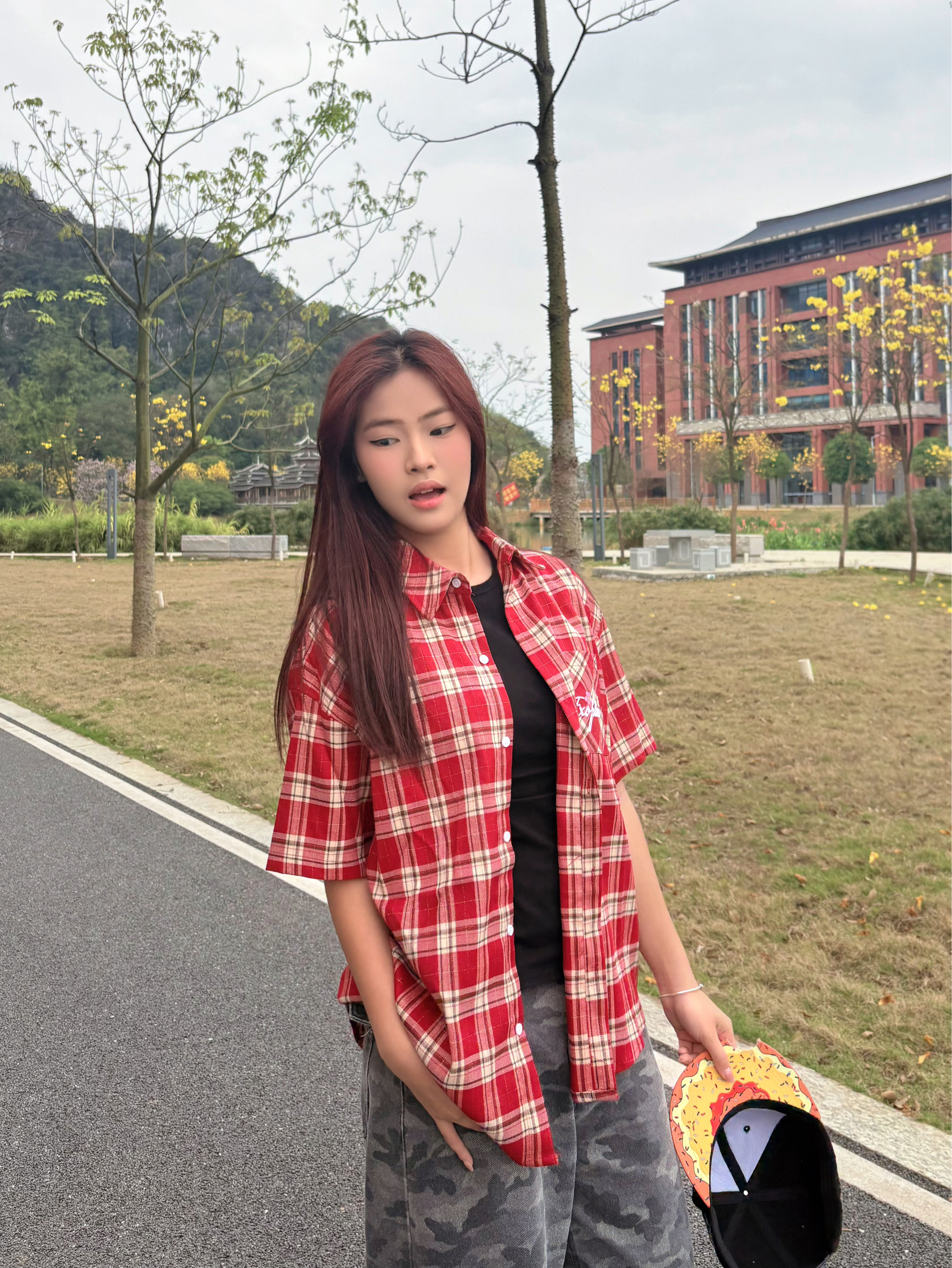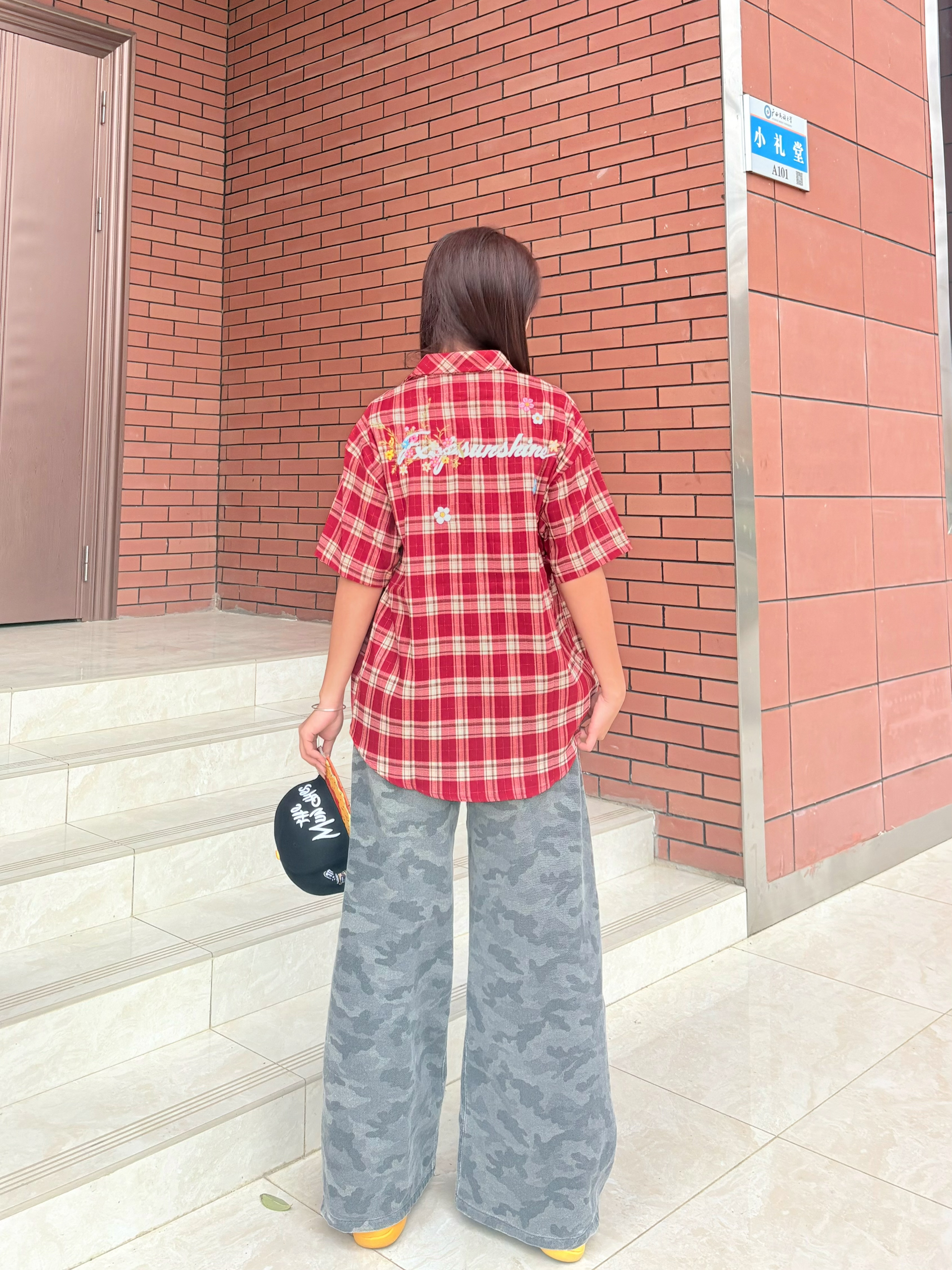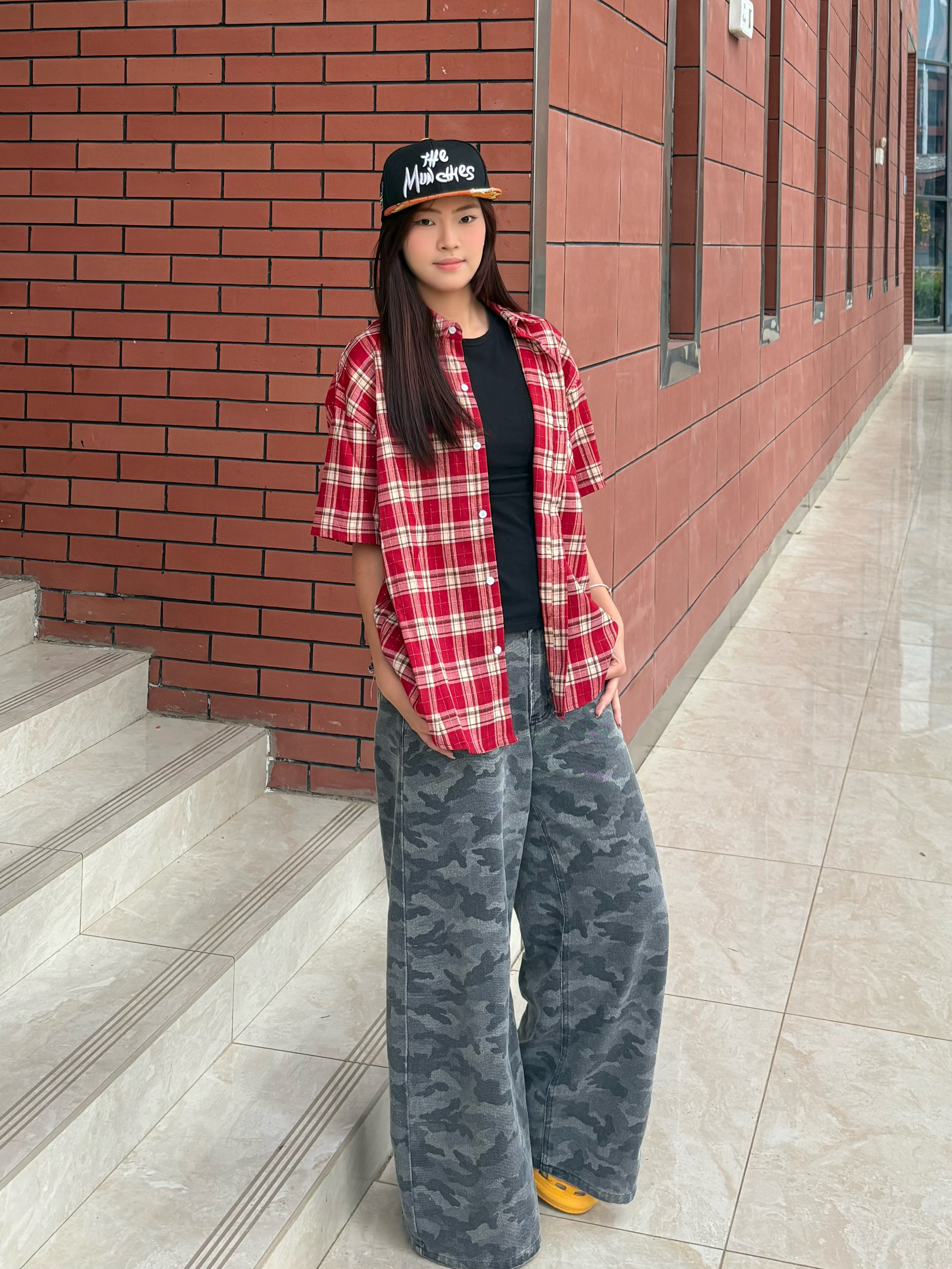 红格纹短袖衬衫叠穿黑T,复古感直接拉满,宽松版型还能藏住小肉肉,对微胖姐妹超友好~ 灰调迷彩阔腿裤垂感绝了!显腿长又舒服,走路带风的感觉谁穿谁知道✨