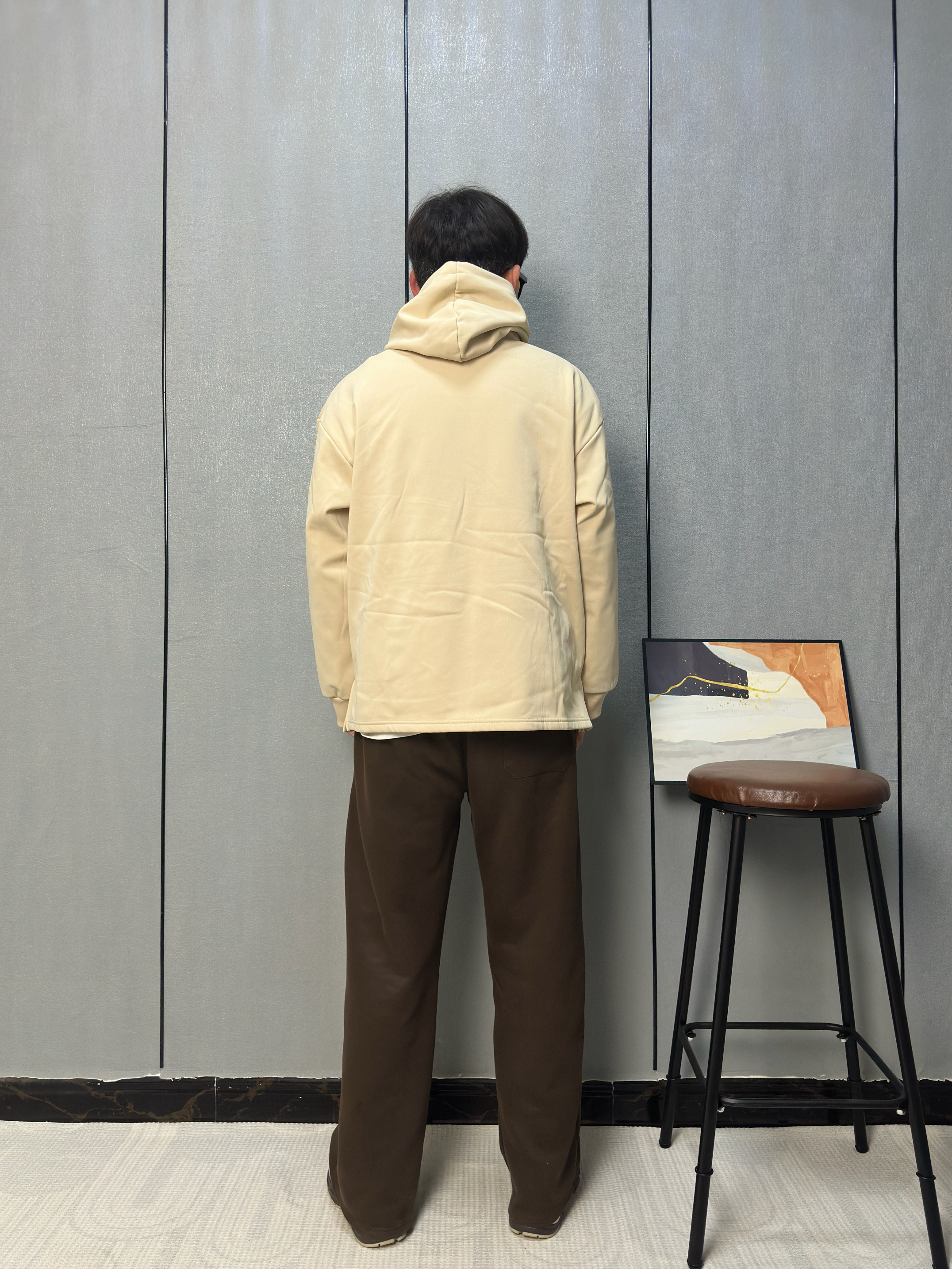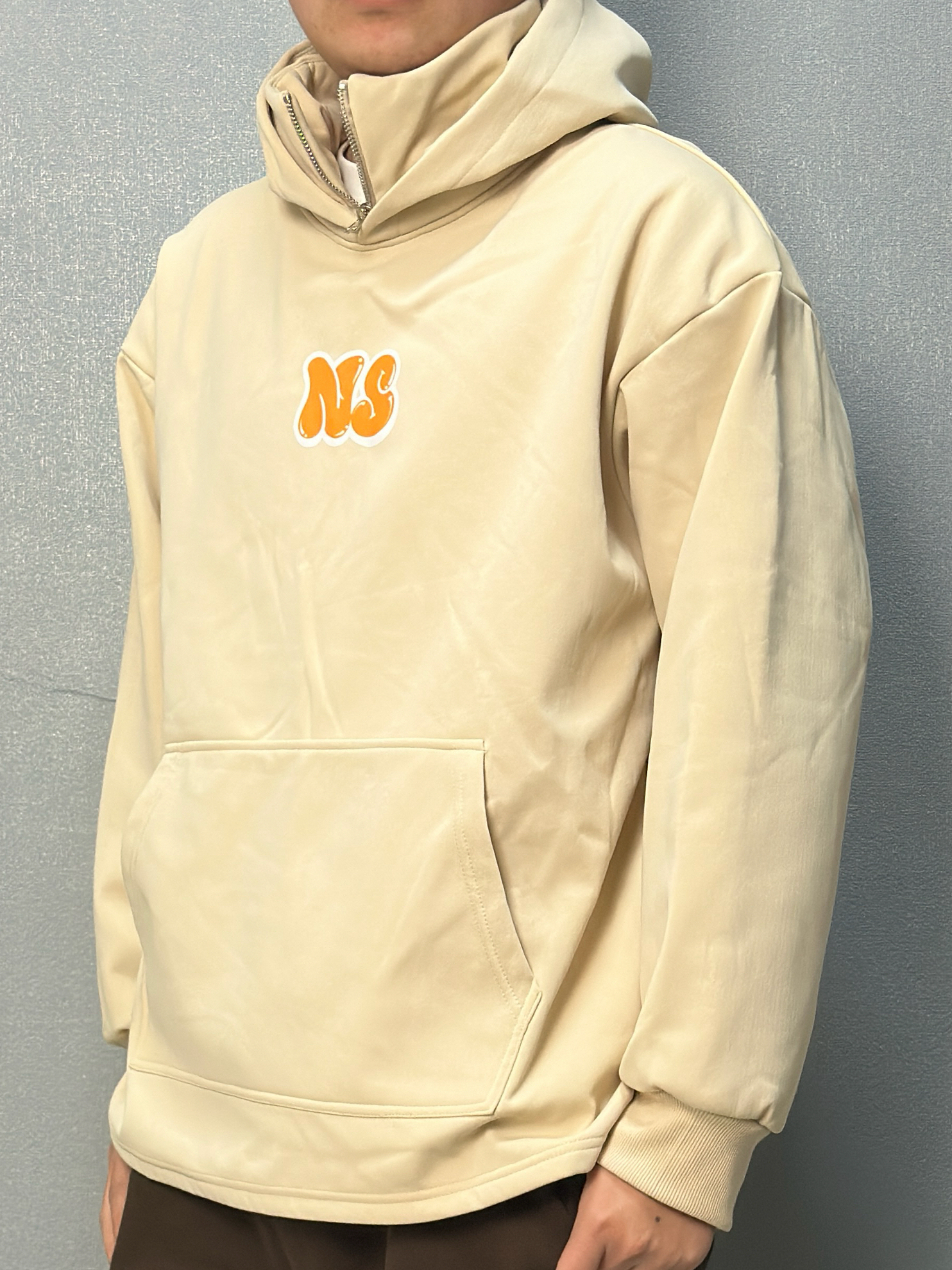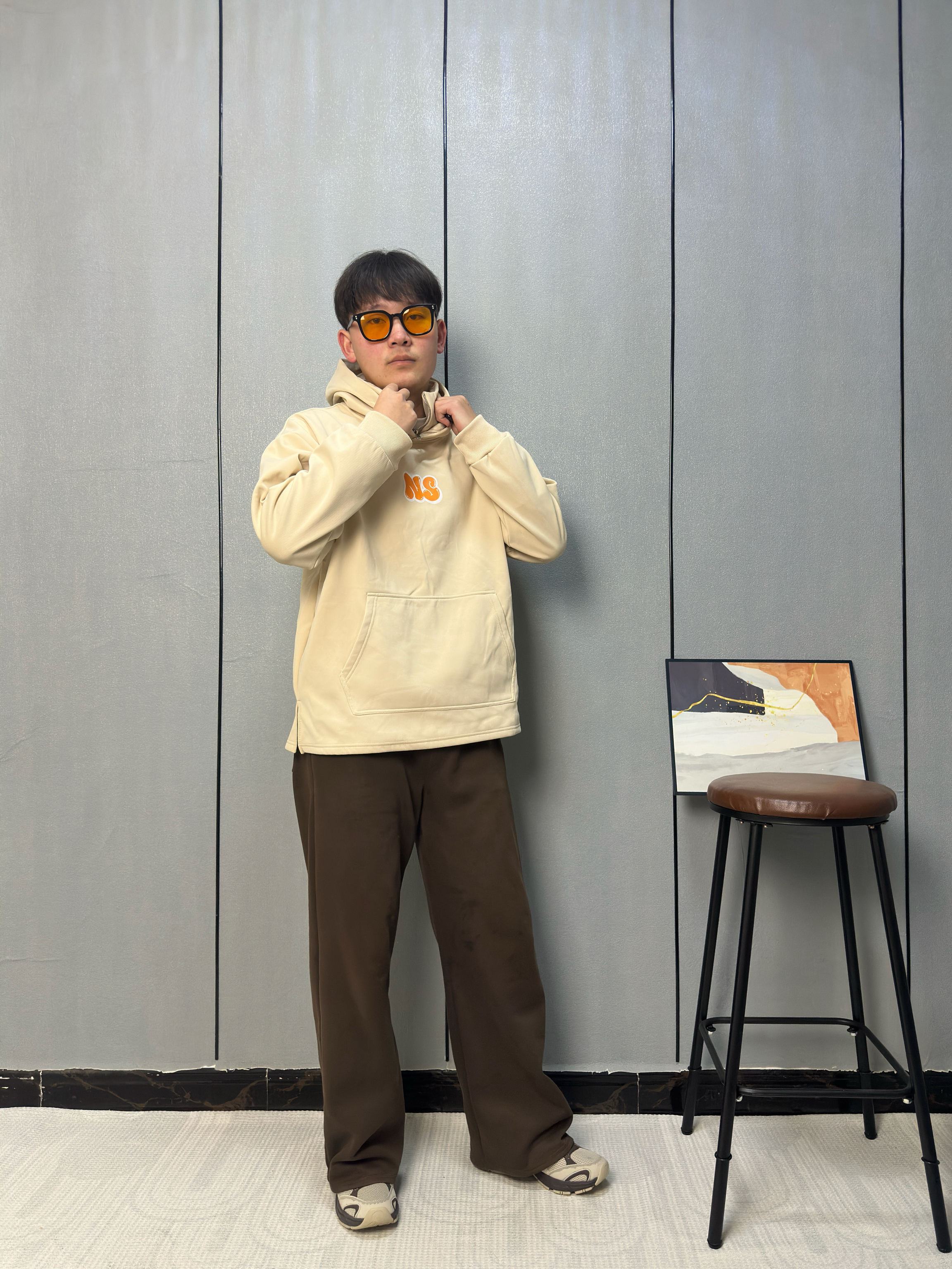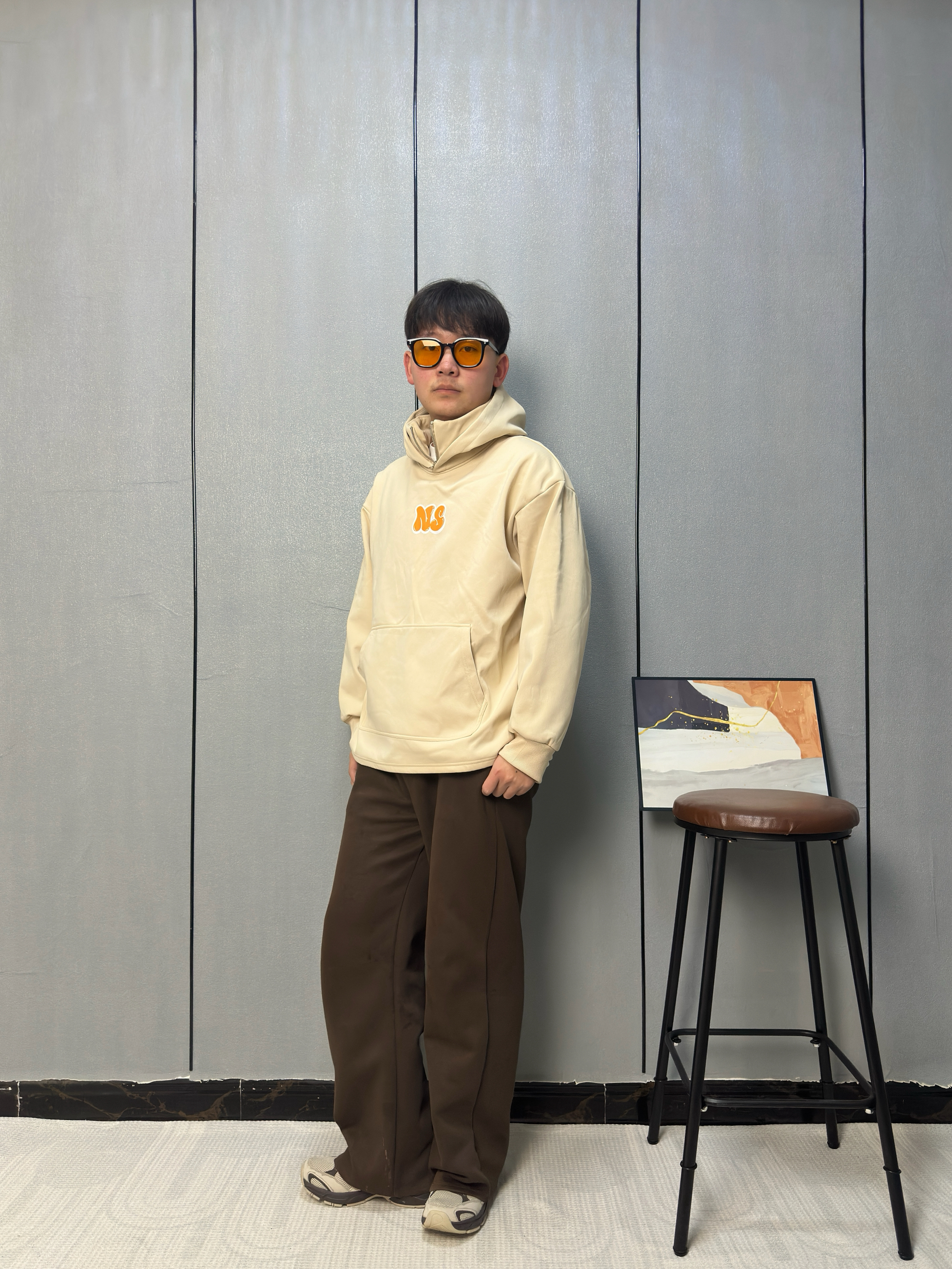 这件米杏色半拉链连帽卫衣是近期搭子 胸前橙黄色“NS”字母点缀 下身搭配深棕直筒裤 垂坠感刚好修饰腿型 上衣的暖调形成柔和过渡 这身色调温暖又沉稳 不用费心搭配就能出门 都透着舒服自在的松弛感 像把春天穿在了身上