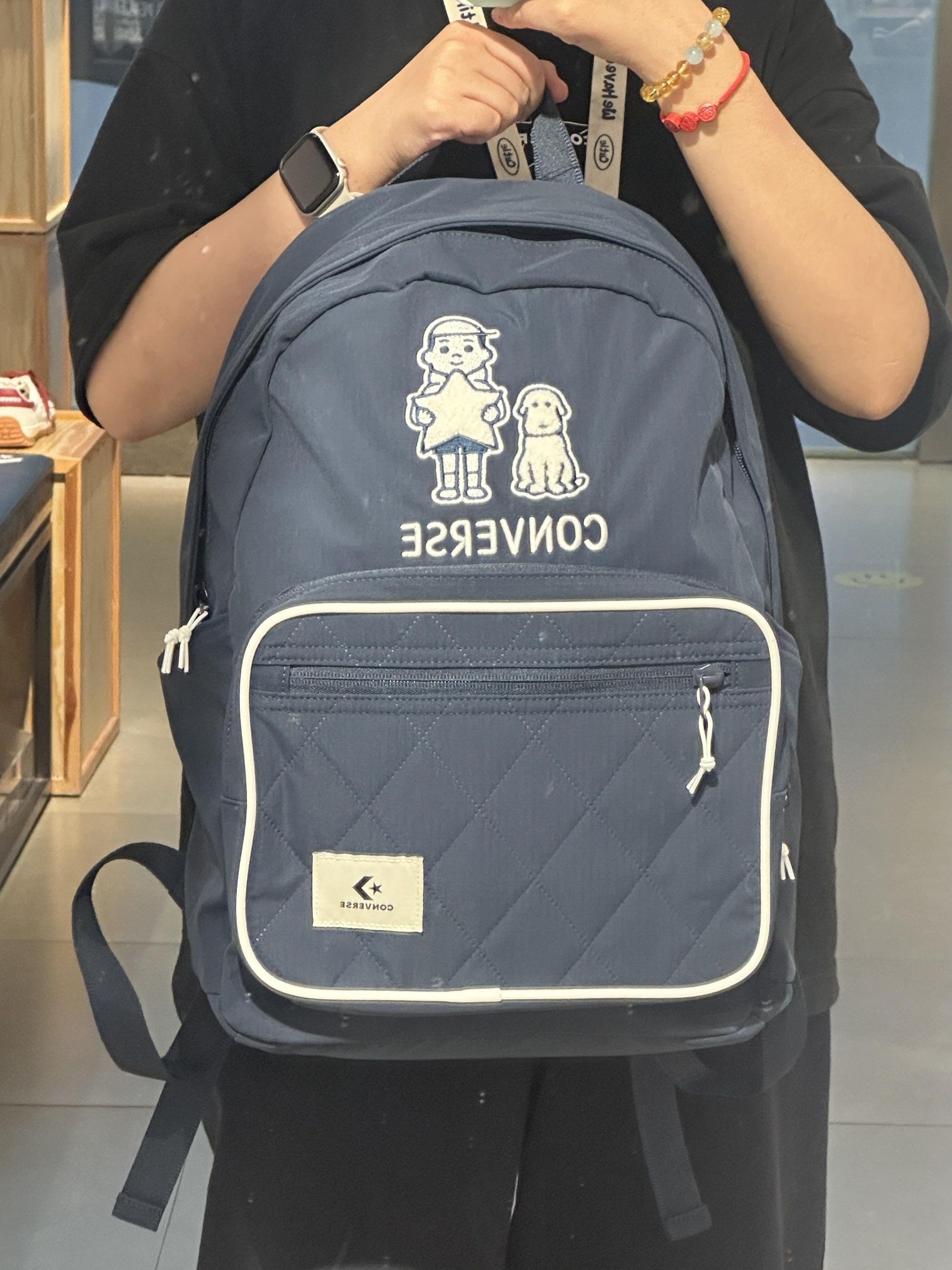 藏蓝色的主调,是属于街头的沉稳质感,而正面那个抱着星星的小男孩与乖萌小狗的刺绣图案,又瞬间将童趣拉满,像是在潮流里藏了个温柔的童话。下方反转的“CONVERSE”标识,玩趣感十足,打破常规的潮酷态度一眼即明。 前幅菱格纹的绗缝口袋,不仅是别致的设计细节,更是收纳小物的贴心空间,白色包边勾勒出利落线条,让整体造型层次更丰富。无论是上学通勤,还是街头出街,它都能轻松适配,装下你的日常所需,更装下那份不...