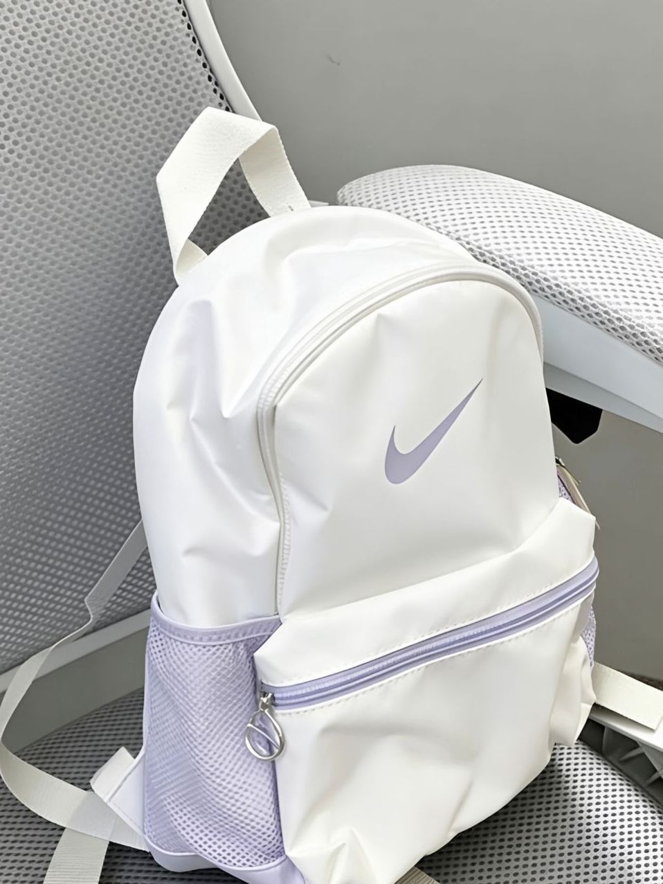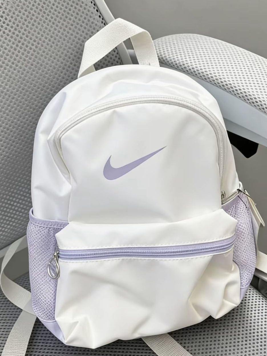 谁能拒绝奶白+淡紫的神仙配色啊🥹 这只Nike迷你双肩包真的长在我审美点上! 简约的Swoosh Logo低调又高级,淡紫拉链和网袋细节拉满, 帆布材质轻便又耐造,容量刚好装下手机、口红和补妆用品, 日常通勤、逛街或出游都超合适,小个子背也完全不压身高, 温柔又百搭,配卫衣、连衣裙都好看,氛围感直接拉满💯