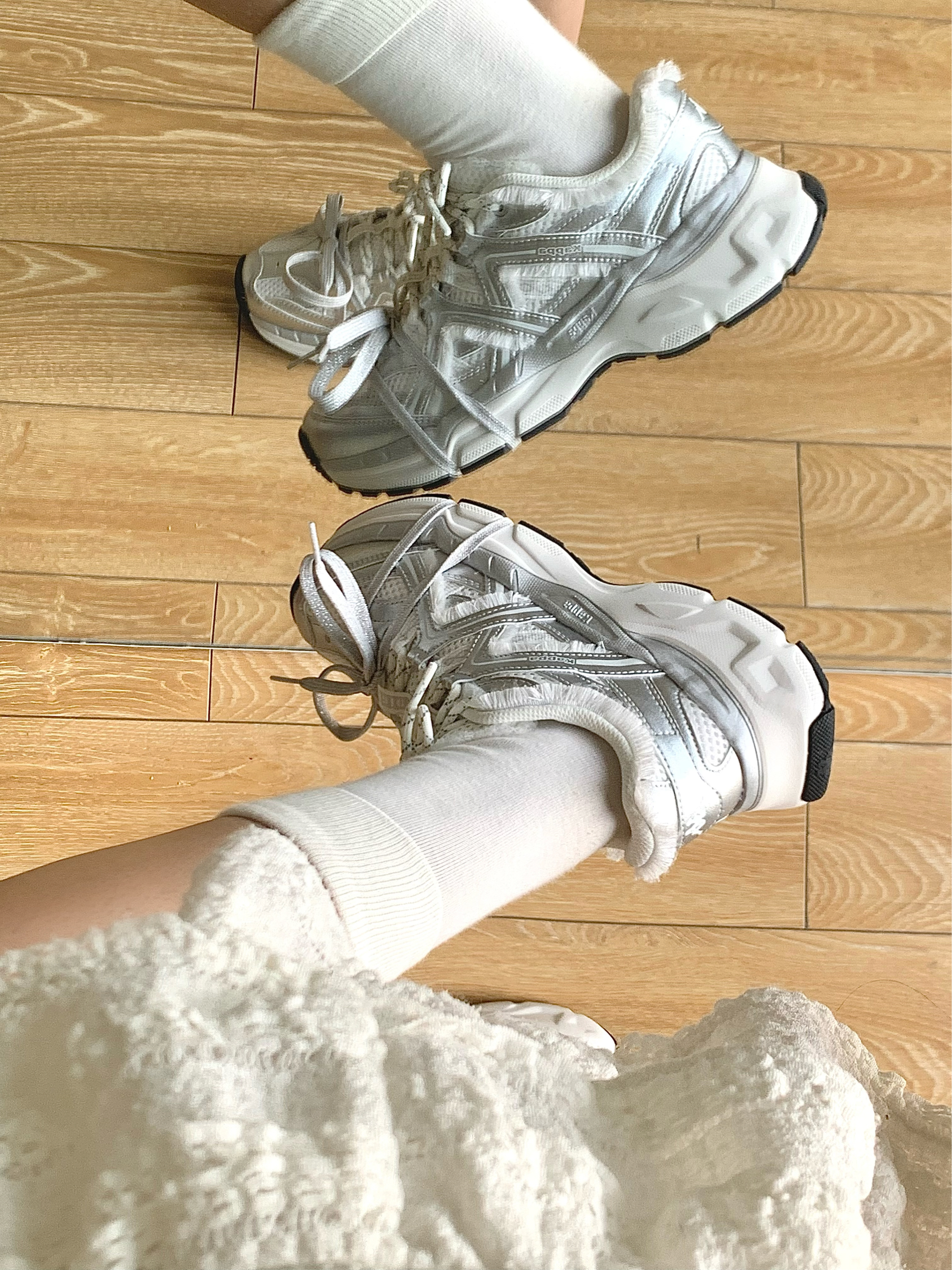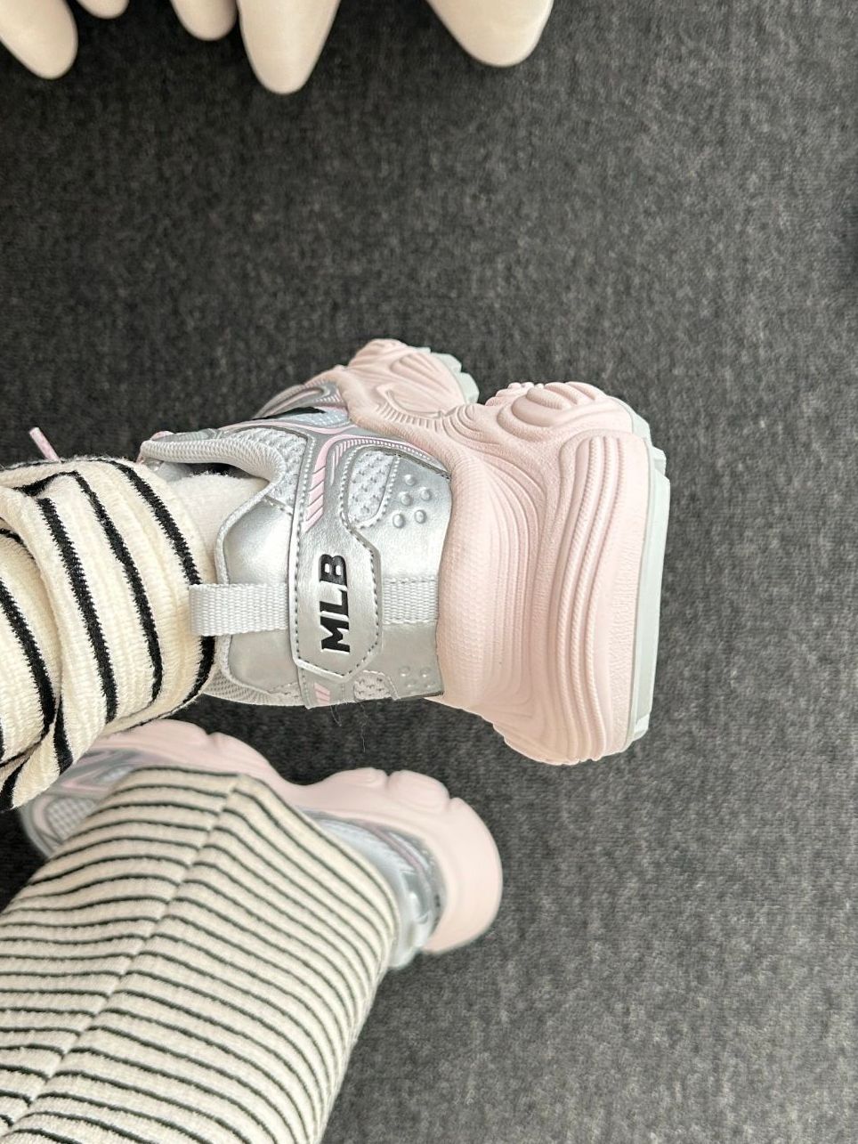 谁能拒绝这双“樱花银箔”MLB老爹鞋啊🥹 银面网布+粉白渐变的撞色设计,自带千禧复古感, 标志性NY Logo低调有辨识度,厚底设计悄悄增高5cm+,网眼材质透气不闷脚,粉白鞋带温柔又吸睛,不管是配辣妹裙、工装裤还是休闲卫衣都超好看,甜酷风、Y2K风、通勤风都能轻松驾驭,显腿长又显白!