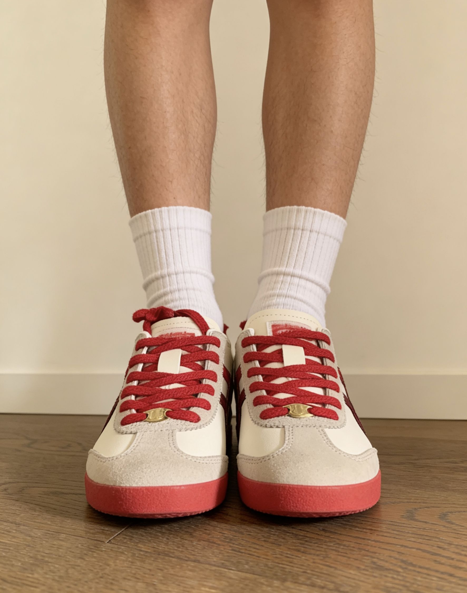 - 亮点:红白撞色+麂皮拼接,复古又活泼,鞋型偏窄长,能拉长腿部线条,红色鞋带和鞋边呼应很协调。