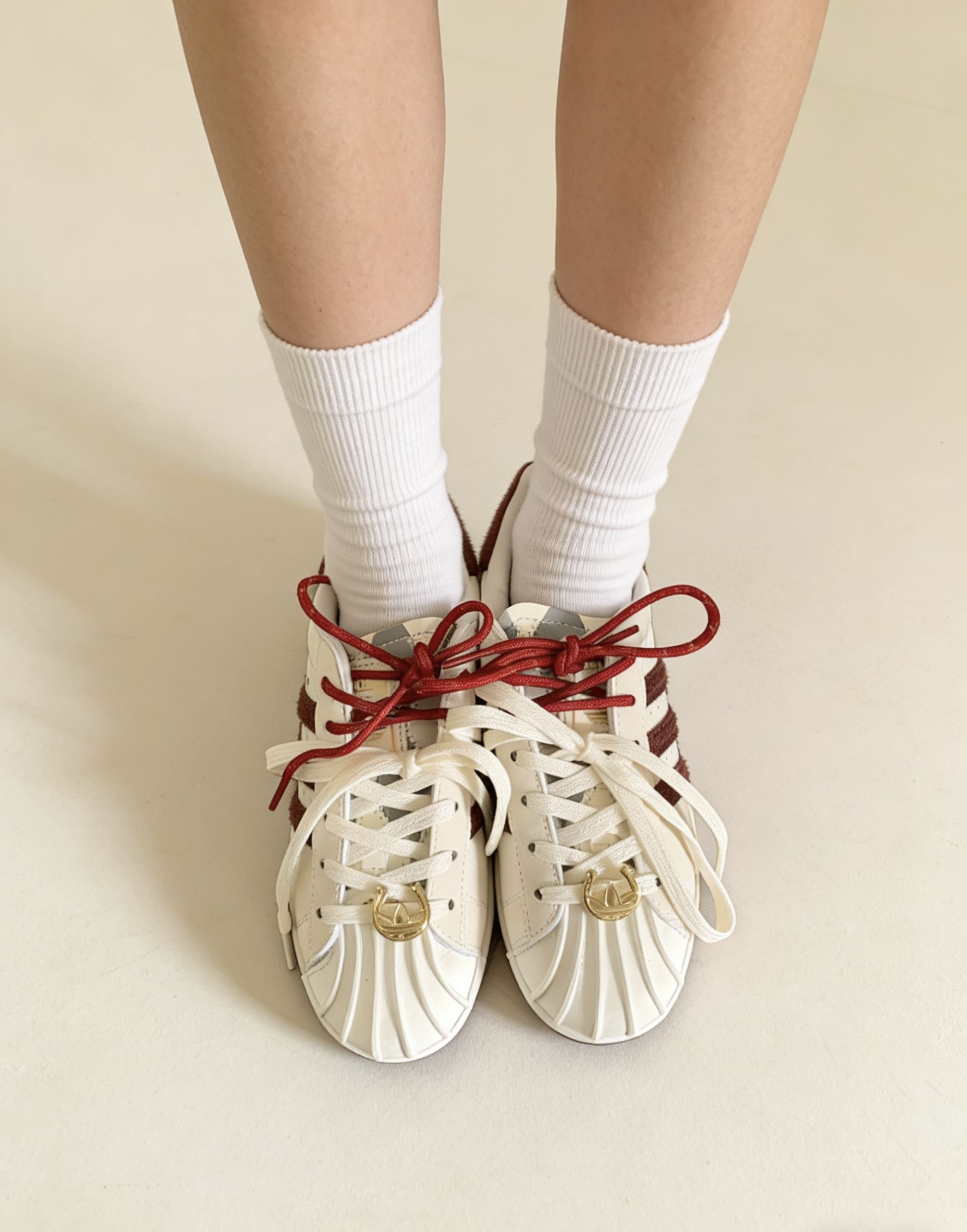 - 亮点:酒红条纹+双层鞋带设计,复古感拉满,鞋舌和内里的细节很有质感,金色鞋扣点缀更显精致。