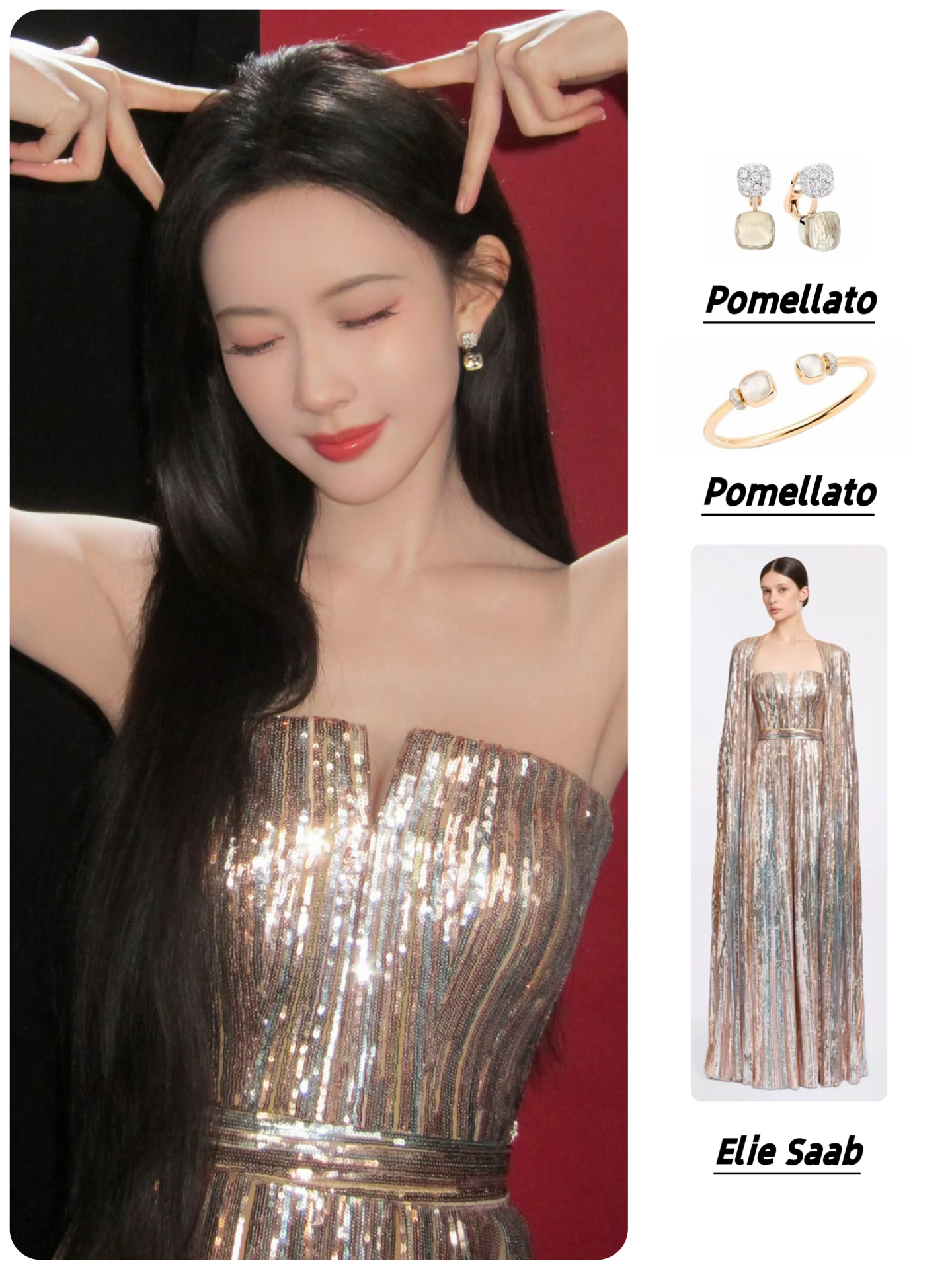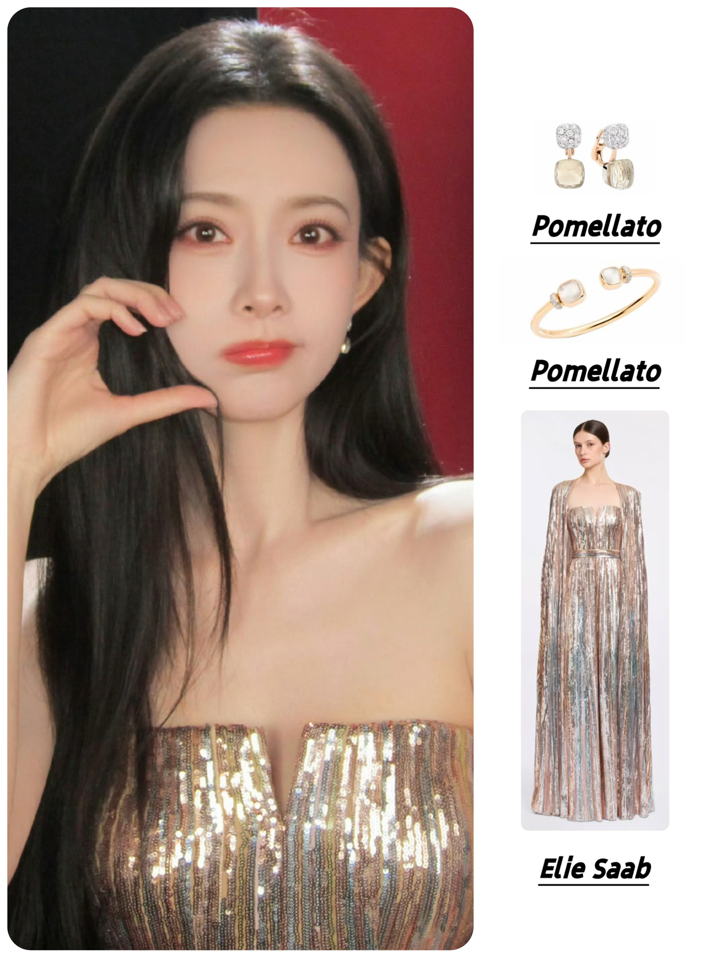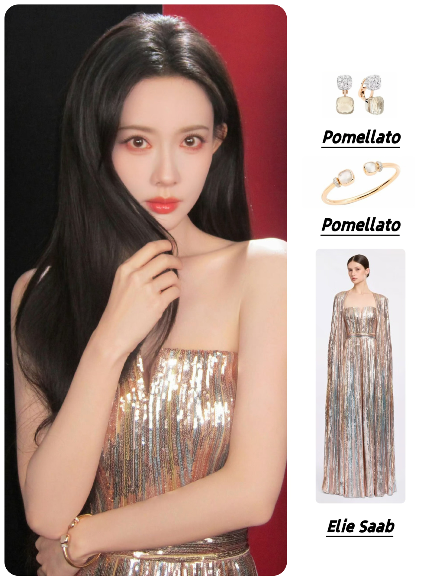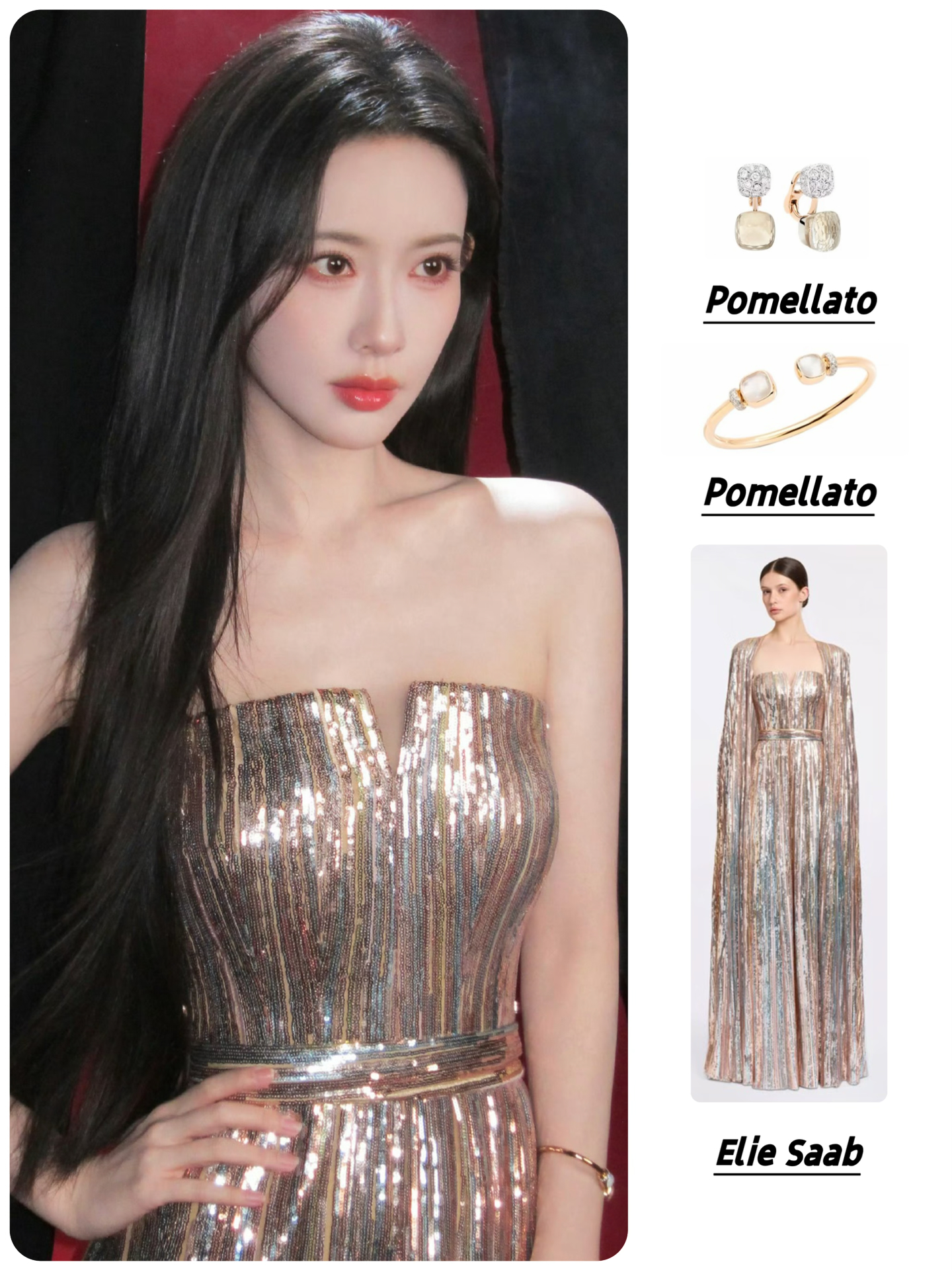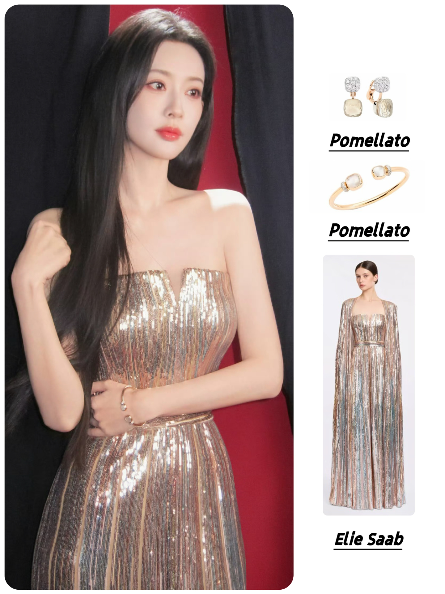 🥻Elie Saab亮片鎏金抹胸礼服长裙 配饰:Pomellato宝曼兰朵 珠宝耳环&手镯 #明星的春日新衣 #孟子义