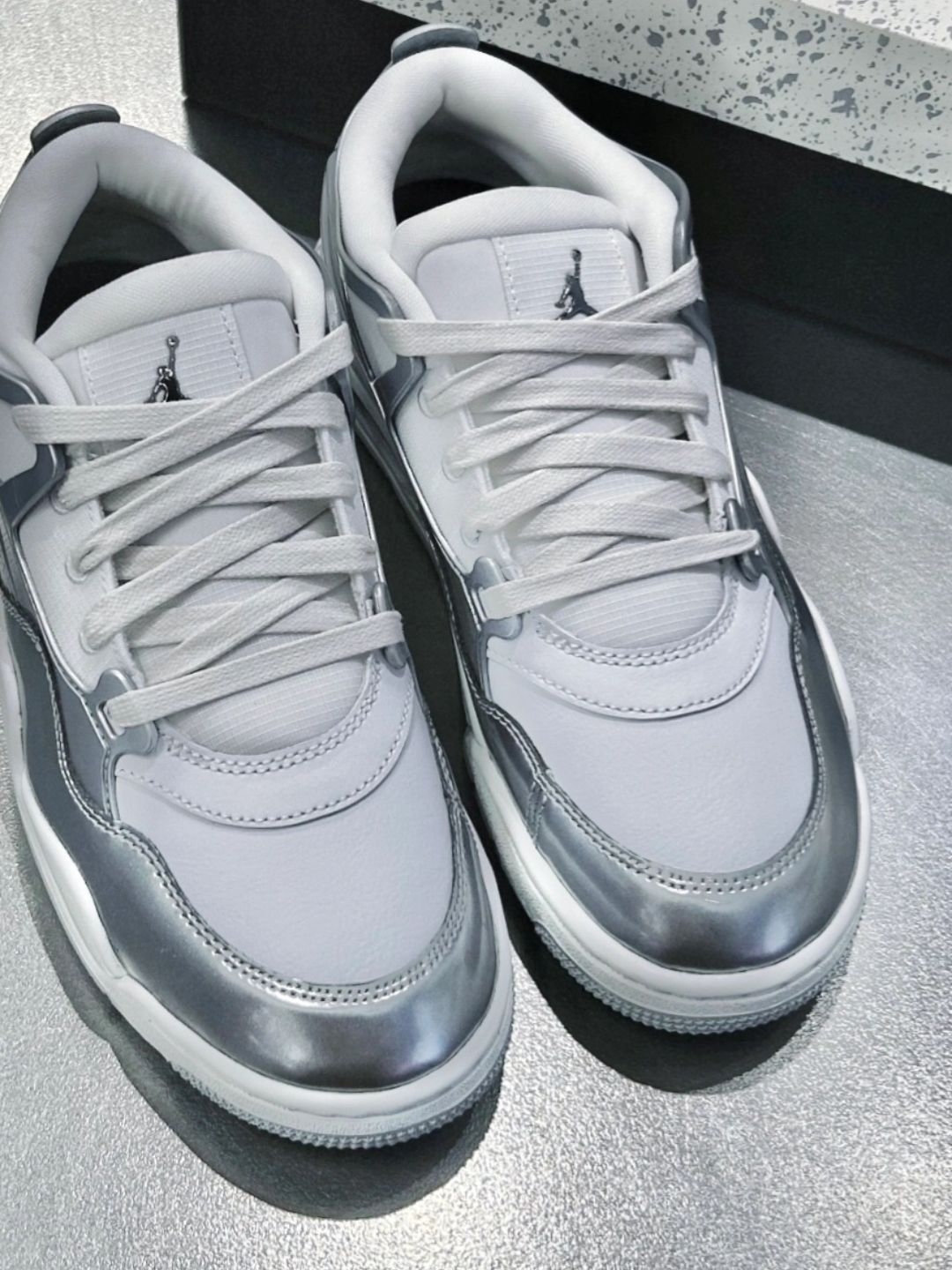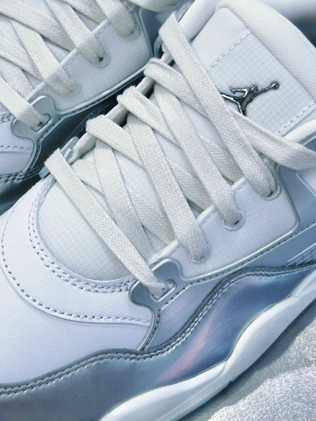 今天穿JordanAirJordan4RMWMNS“Chrome”出门😎~和朋友去咖啡馆喝冰美式,接着逛公园晒太阳☀️。我搭浅灰阔腿裤+白T+牛仔外套,朋友看到直夸:“这银闪闪的鞋好特别,回头率超高!” 鞋子是银白色金属质感,柔软皮革混合材质,透气不闷脚,走路时鞋底支撑感刚好,不会累脚。尺码很正,我37码穿刚好,瘦脚宽脚都适配✅。保养小技巧:白色部分脏了用橡皮擦轻擦就行🧼~ 你们平时喜欢用银色鞋子...