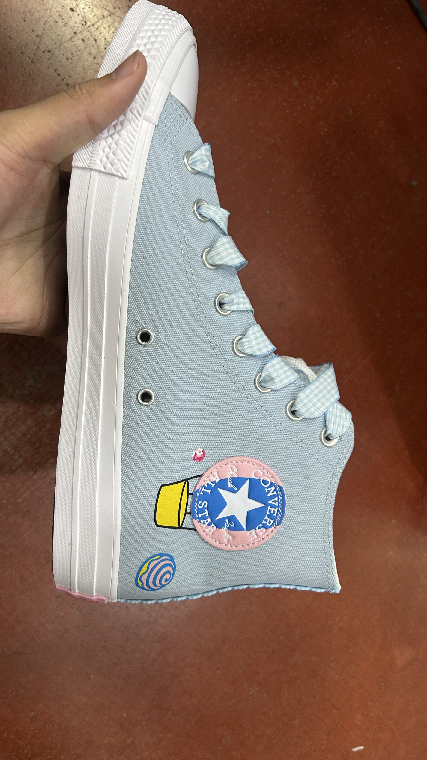刚拆箱就被这双匡威×玉桂狗联名戳中了!整体是软乎乎的奶蓝色,比普通匡威多了一层温柔滤镜,上脚显白又减龄,完全是春日限定的感觉🌿 鞋身的大耳狗印花太可爱了——趴在云朵上的玉桂狗,旁边点缀着星星、小蛋糕和糖果贴纸,连匡威经典的All Star标都换成了粉边,细节控狂喜!最戳我的是附赠的蓝白格纹鞋带,系成蝴蝶结之后甜妹感直接拉满,和奶蓝鞋面搭在一起,温柔又清新。 鞋盒也是联名限定款,绿色的盒子上印着...