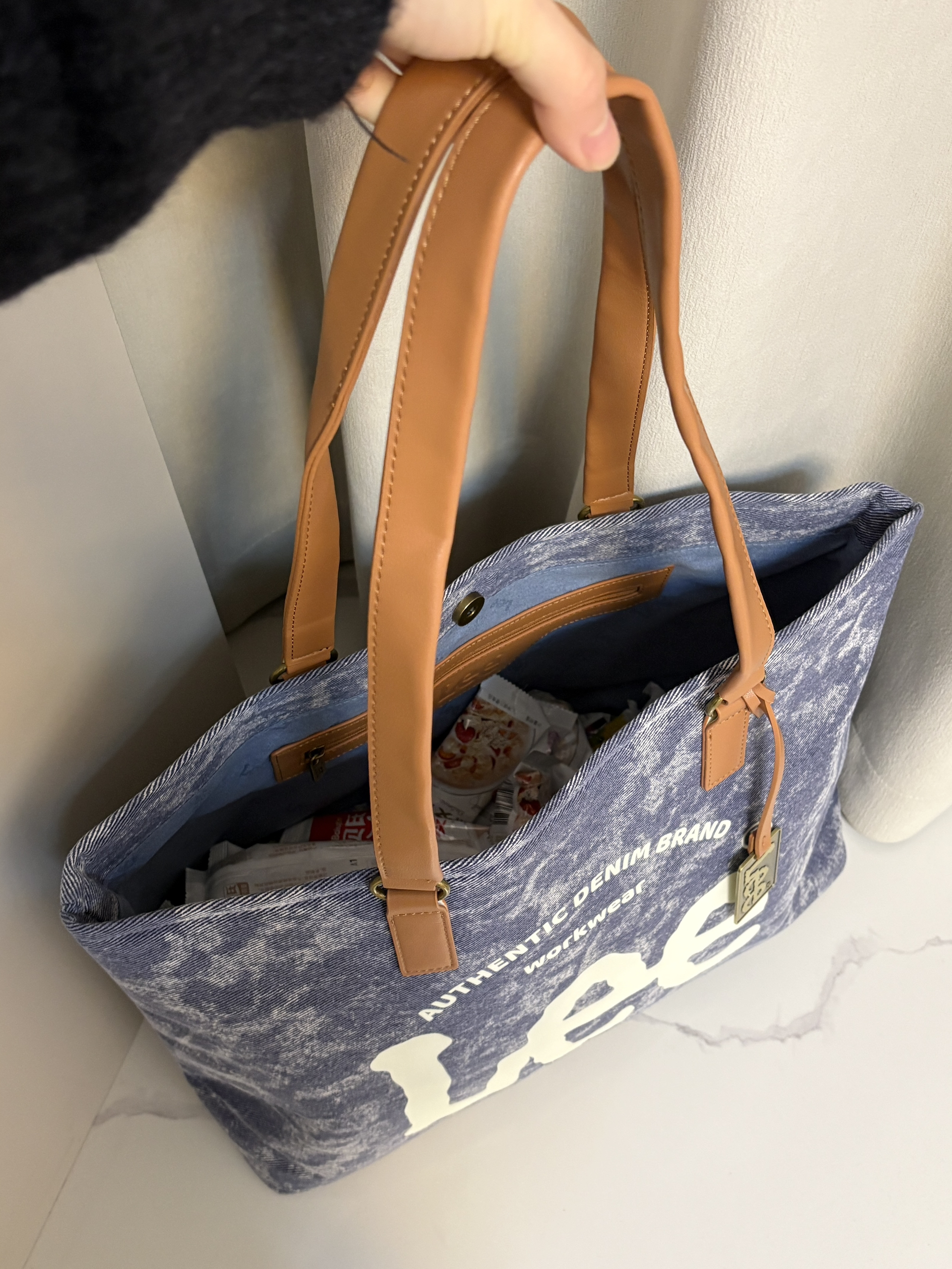 本篇笔记关联了Lee 做旧水洗牛仔潮流织物大容量旅行上班通勤单肩妈咪包手提包 水洗蓝等商品,为用户提供真实的使用体验和购买参考。