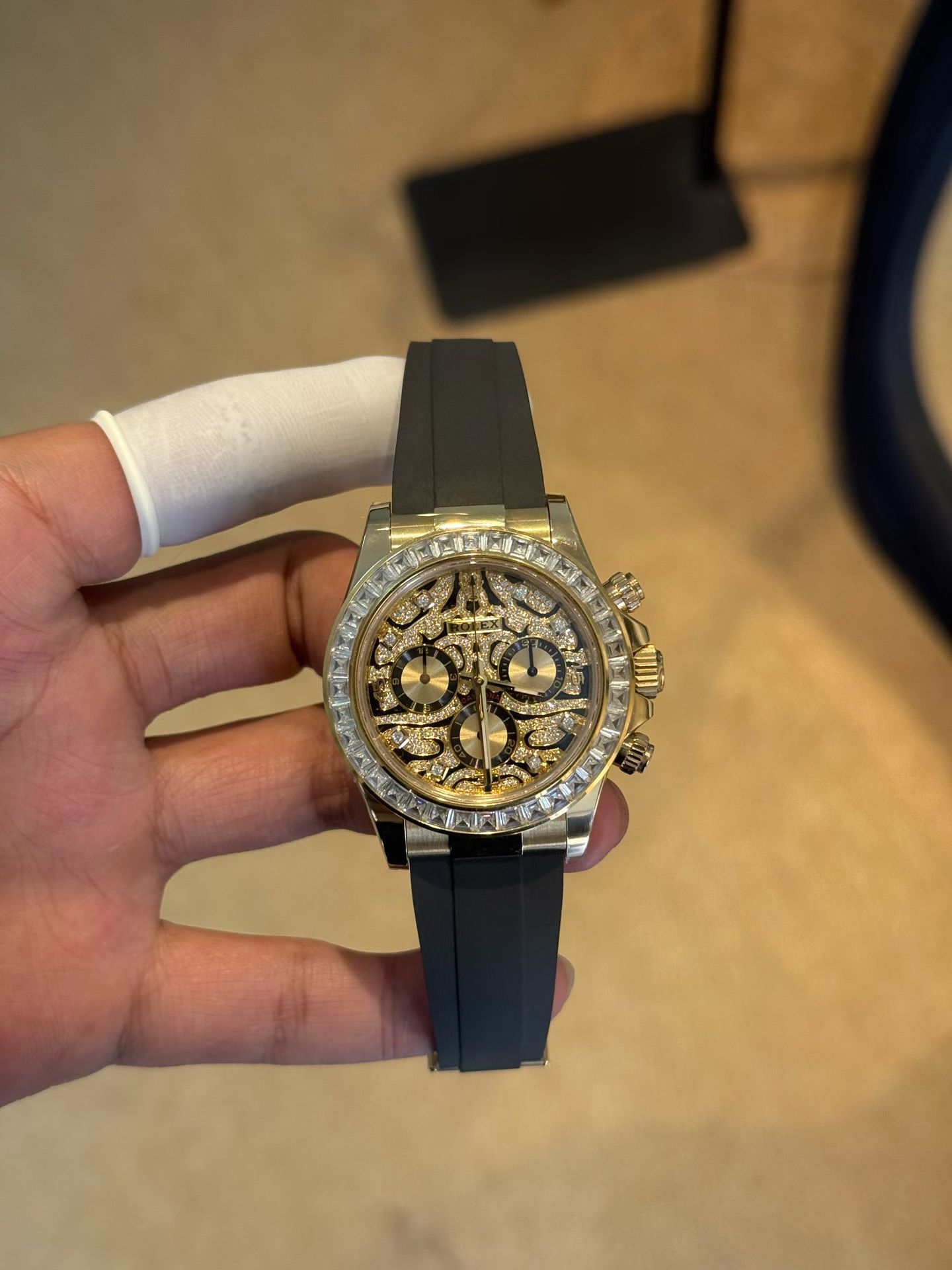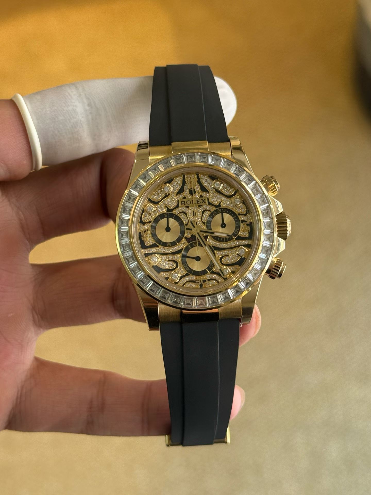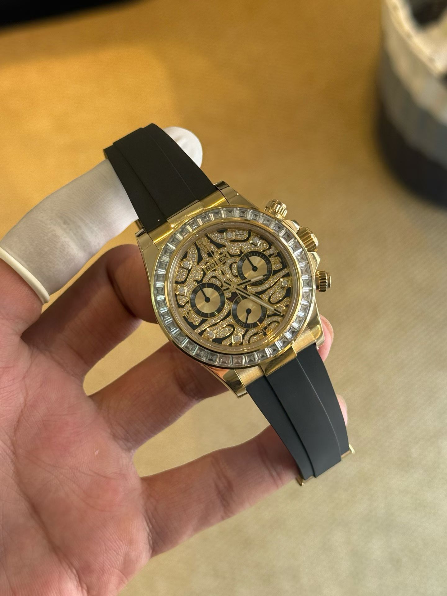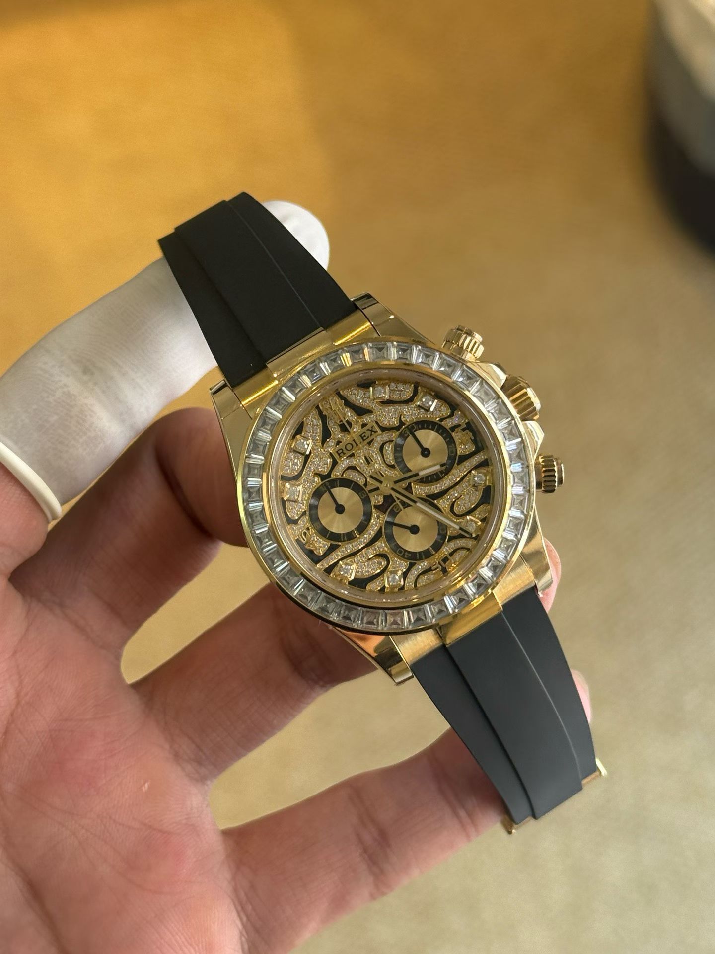 7天搞定老虎迪116588TBR,18k厚包金配金色斑纹盘,盘面花纹像老虎🐯外圈镶嵌宝石,整体奢华且富有野性气息,充满野性张力的虎纹设计,将丛林之王的力量美学与制表工艺完美融合,大胆创新又尊贵不凡的时光艺术品