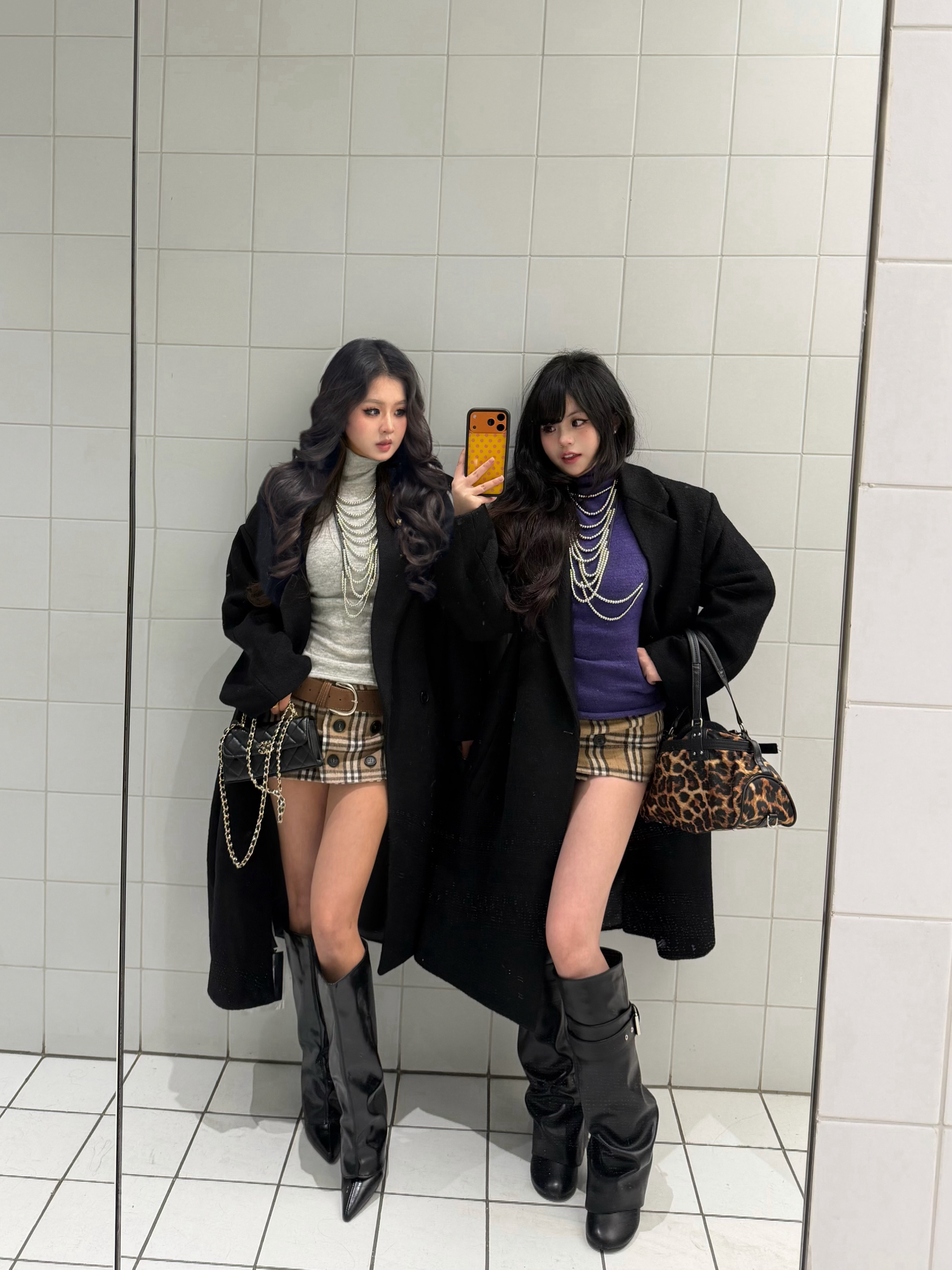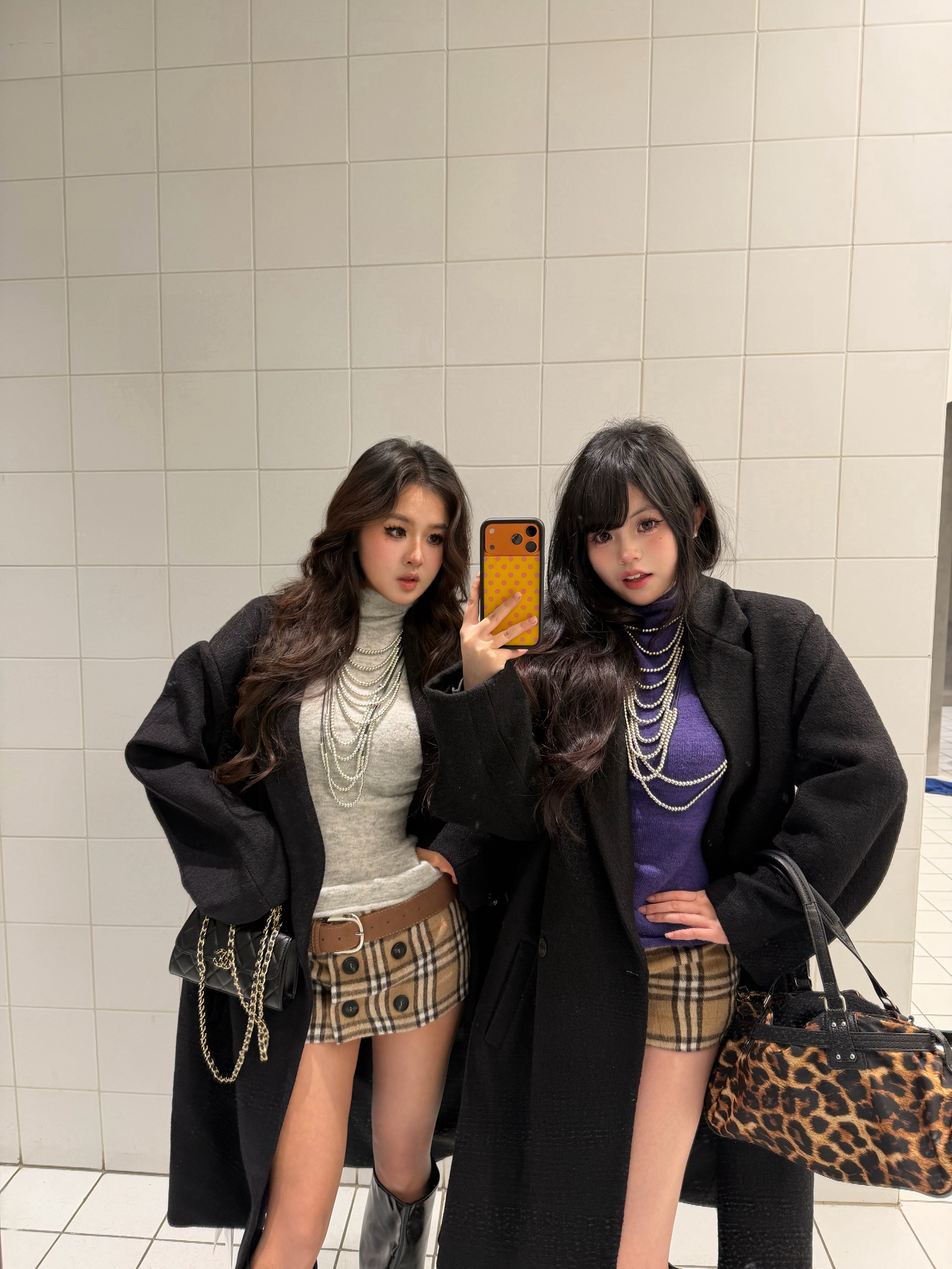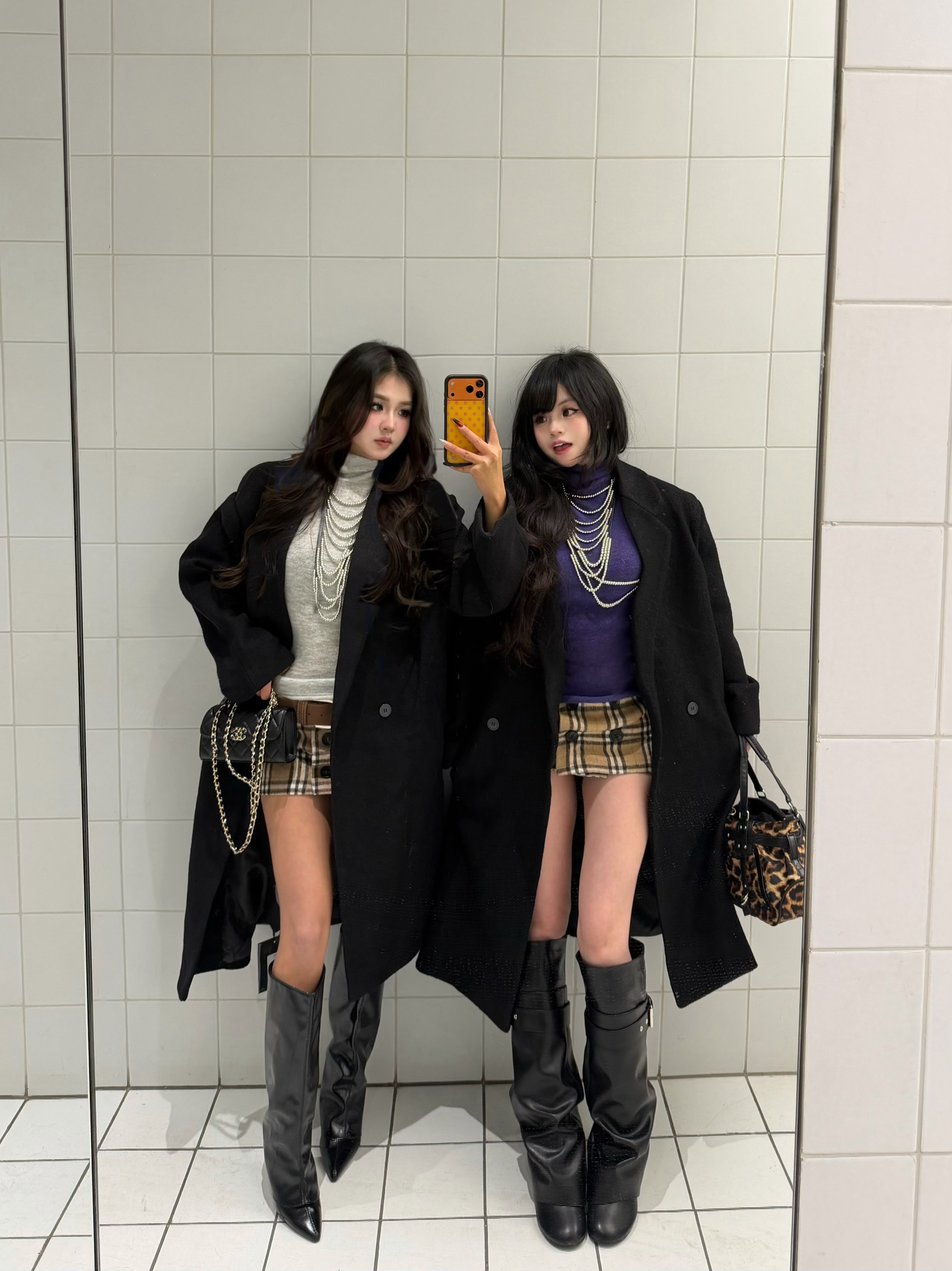 和闺蜜一起穿黑大衣出街也太有氛围感了吧!同色系不同内搭,甜酷双煞直接拿捏~ - 💡穿搭小Tips: • 黑大衣+格纹超短裙,秒变美式复古辣妹,露出长腿超显比例! • 内搭选浅灰/紫色高领,叠戴多层珍珠项链,贵气感直接拉满 • 豹纹包+链条包呼应格纹,细节控狂喜,甜酷平衡得刚刚好 • 尖头靴/堆堆靴二选一,一个干练一个慵懒,和姐妹凑成CP感 春天和闺蜜一起穿这套出门,回头率绝对爆表