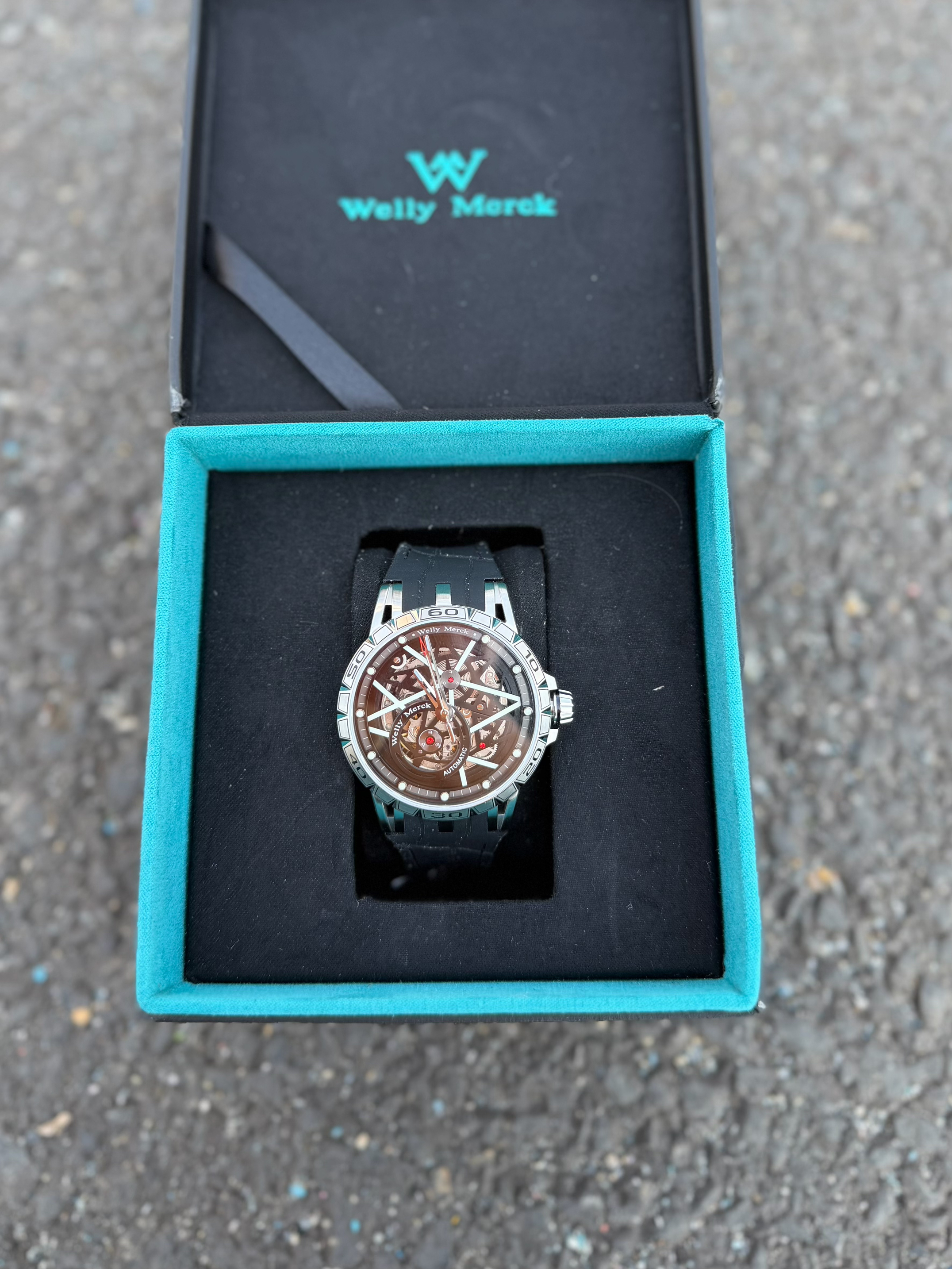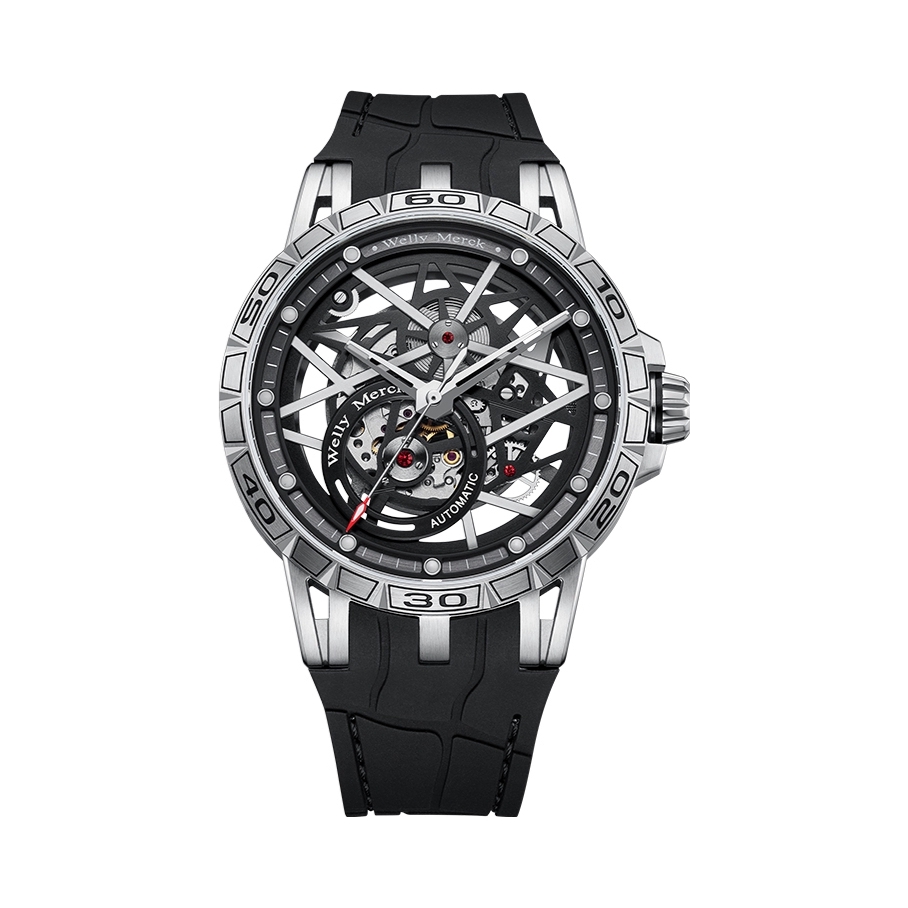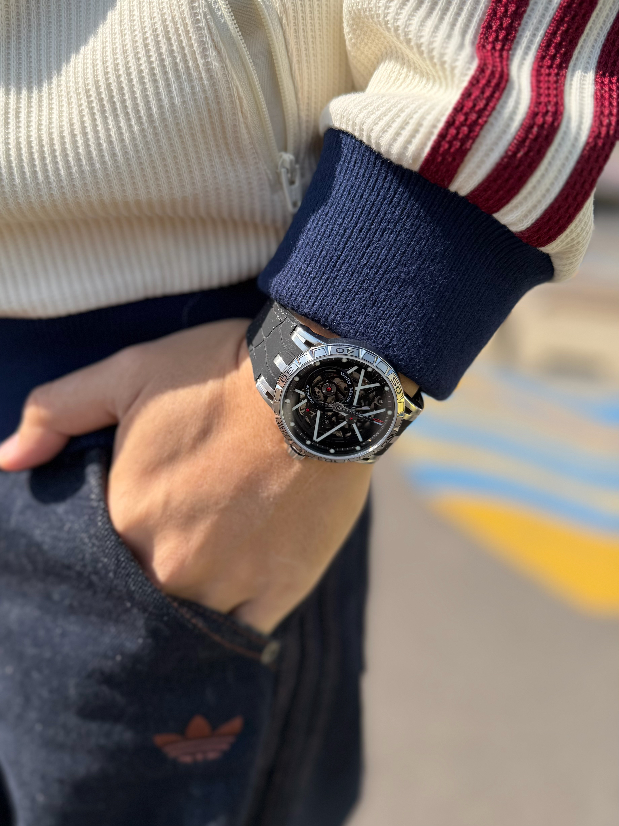 谁懂啊🥹找到能戴出手腕高级感的表啦 乳白华夫格+深蓝牛仔裤 配上这块威利默克星际系列 镂空表盘里的五芒星转得太酷了✨ 橡胶表带调节大小也很方便, 痞帅风直接拉满💯