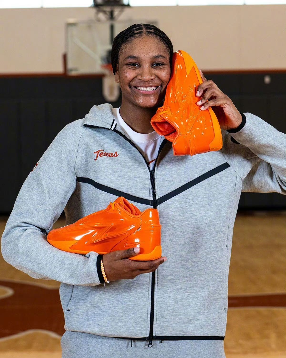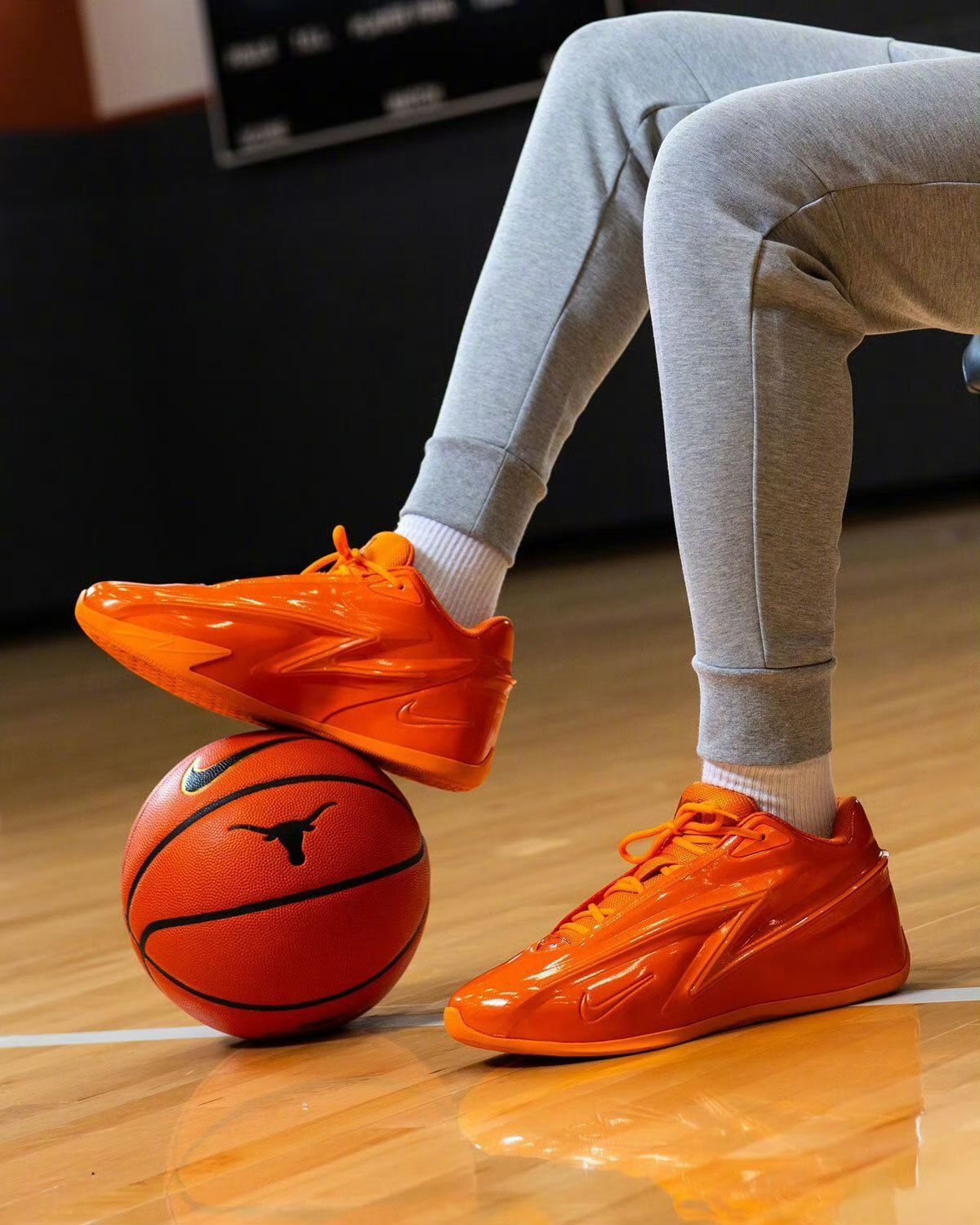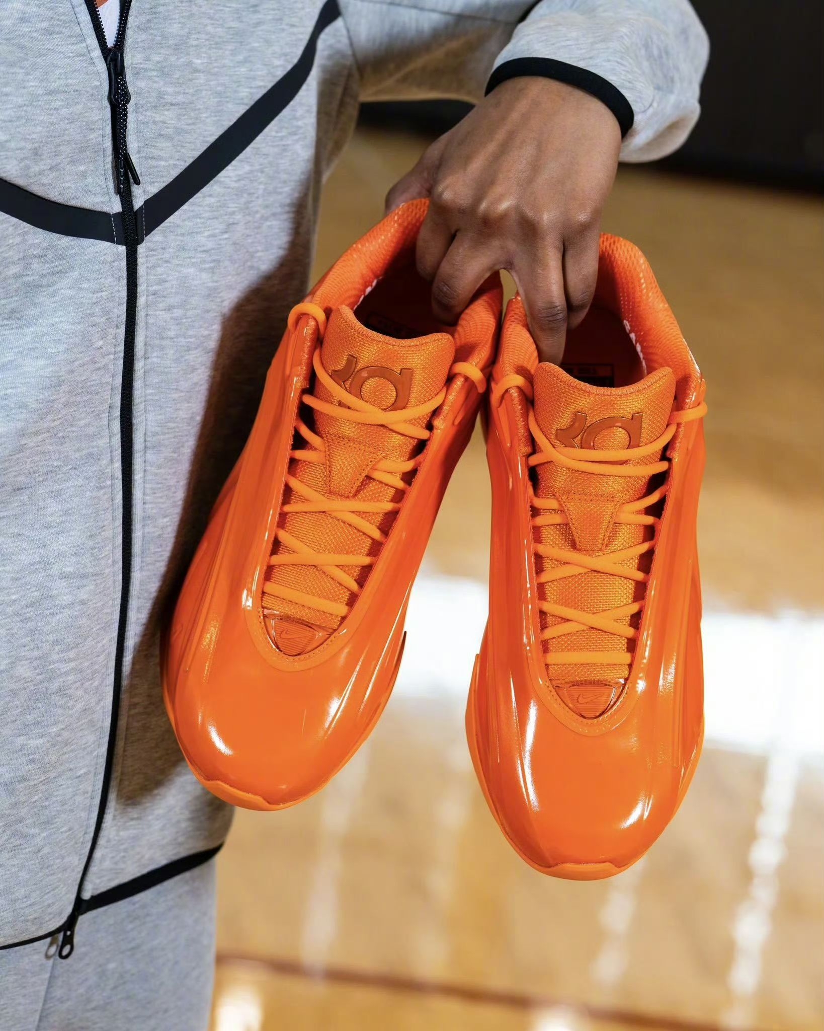 家人们谁懂啊!KD为母校得州大学搞的NIL项目,居然第一个就给了女篮前锋麦迪逊·布克! 这双专属「长角牛」配色KD19“Orange Crush”PE,亮橙漆皮闪到我眼睛疼,跟得州的大太阳一样热情,上脚直接把球场变成橘子汽水摊! 流线型鞋身+后跟KD Logo,妥妥的Team KD开门礼,排面直接拉满。 咱就是说,这鞋要是能市售,我第一个冲!有没有懂哥跟我一起蹲?