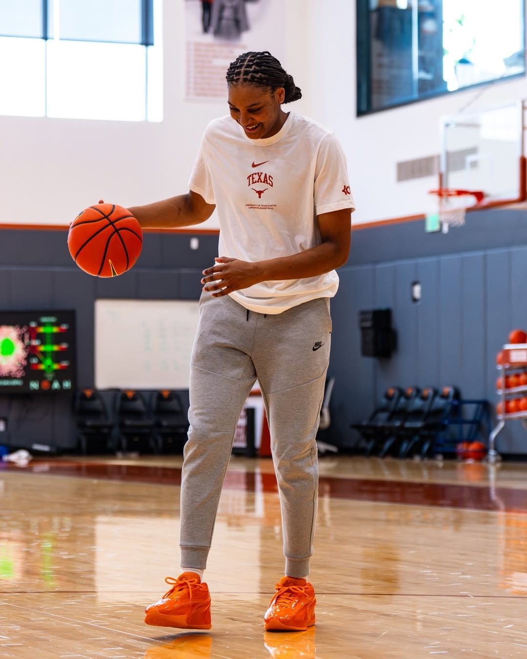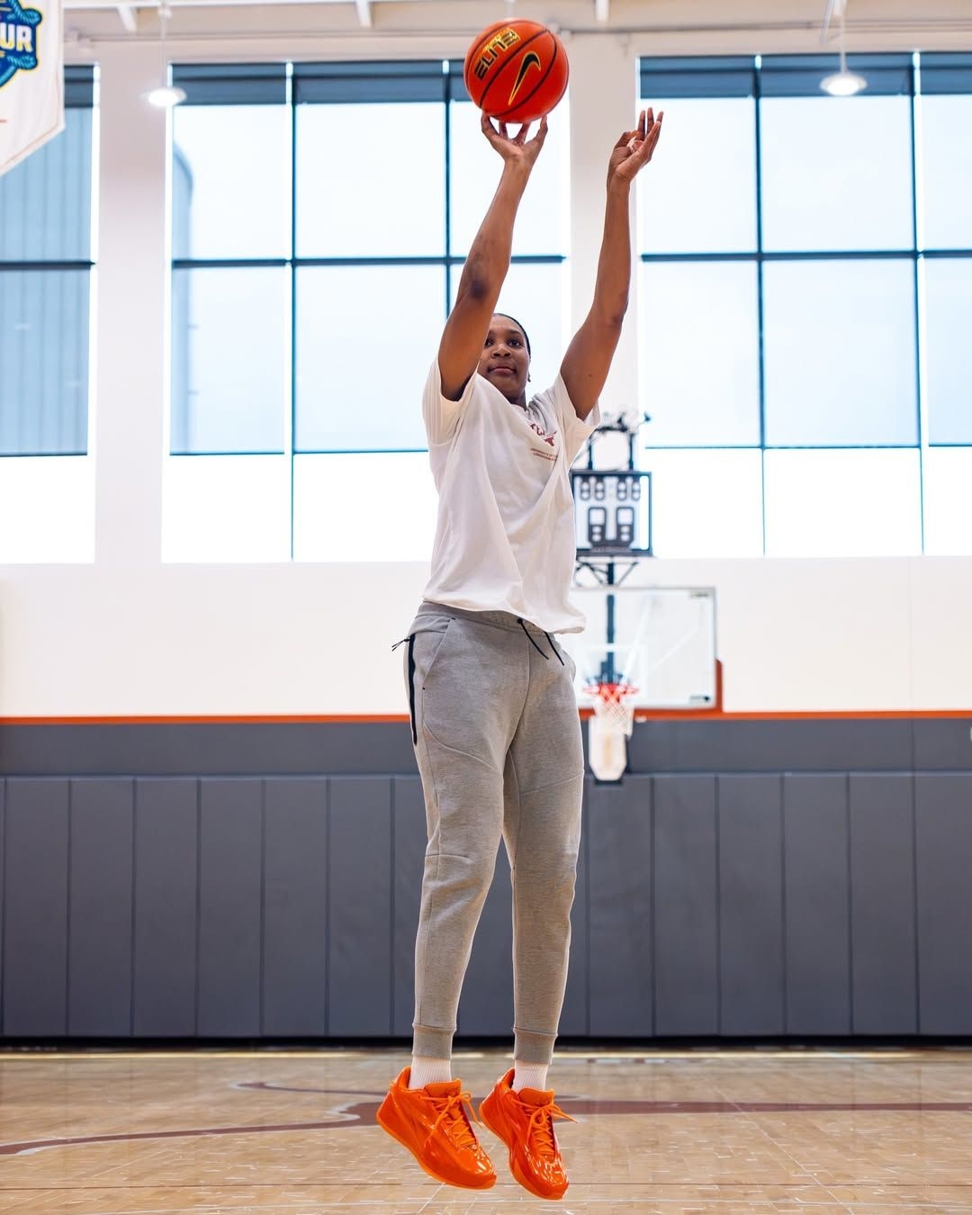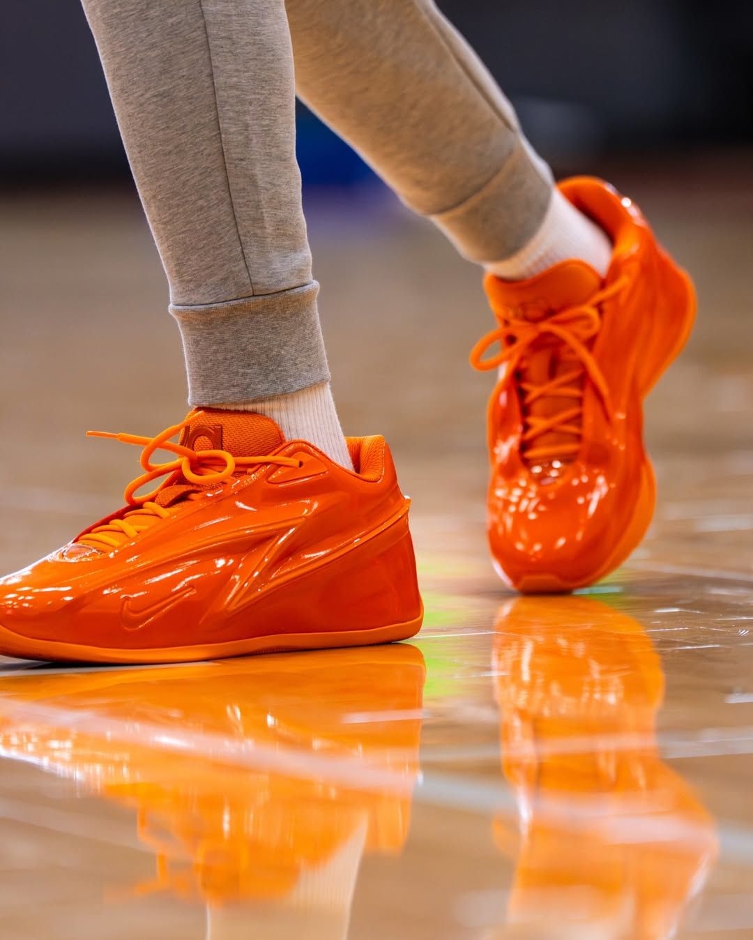 家人们谁懂啊!KD为母校得州大学搞的NIL项目,居然第一个就给了女篮前锋麦迪逊·布克! 这双专属「长角牛」配色KD19“Orange Crush”PE,亮橙漆皮闪到我眼睛疼,跟得州的大太阳一样热情,上脚直接把球场变成橘子汽水摊! 流线型鞋身+后跟KD Logo,妥妥的Team KD开门礼,排面直接拉满。 咱就是说,这鞋要是能市售,我第一个冲!有没有懂哥跟我一起蹲?