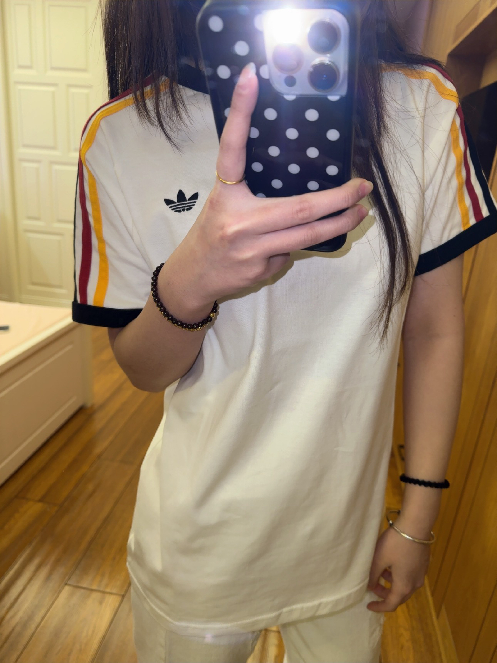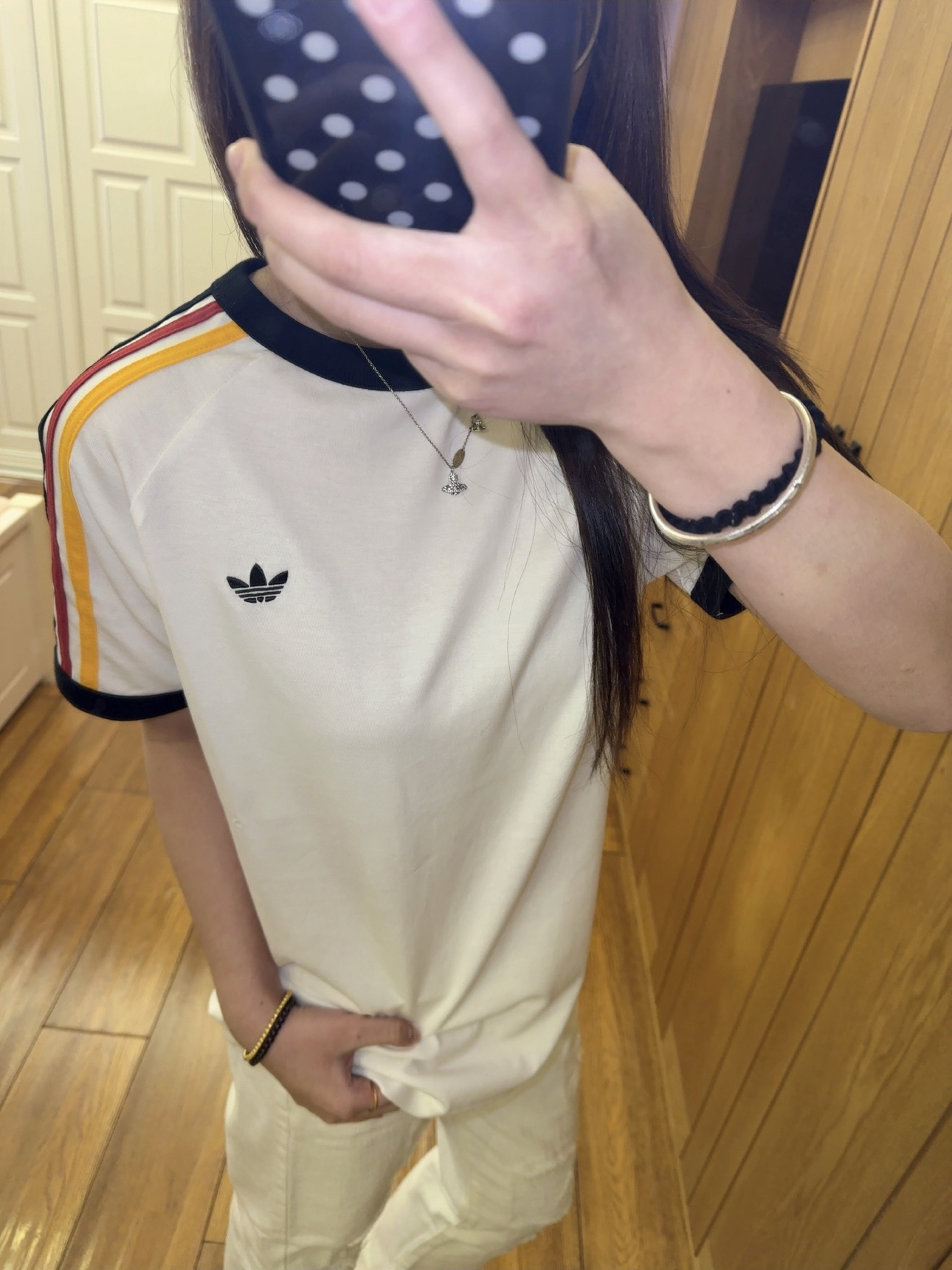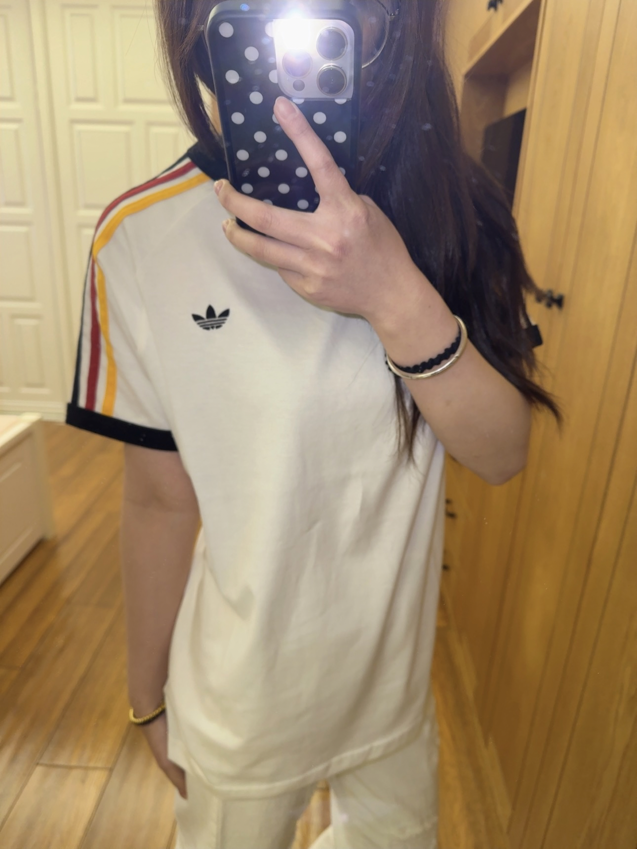 今天穿的是 adidas 家滴衣服 是我新买的一件短袖! 整体上是白色 特别之处就在袖口 三色的条纹设计 很有夏天的气息 红黄黑三色条纹搭配就没有那么单调了 夏天就是要穿特别鲜艳的颜色呀 我160 93穿的是164码的噢 可以盖住一大半屁股