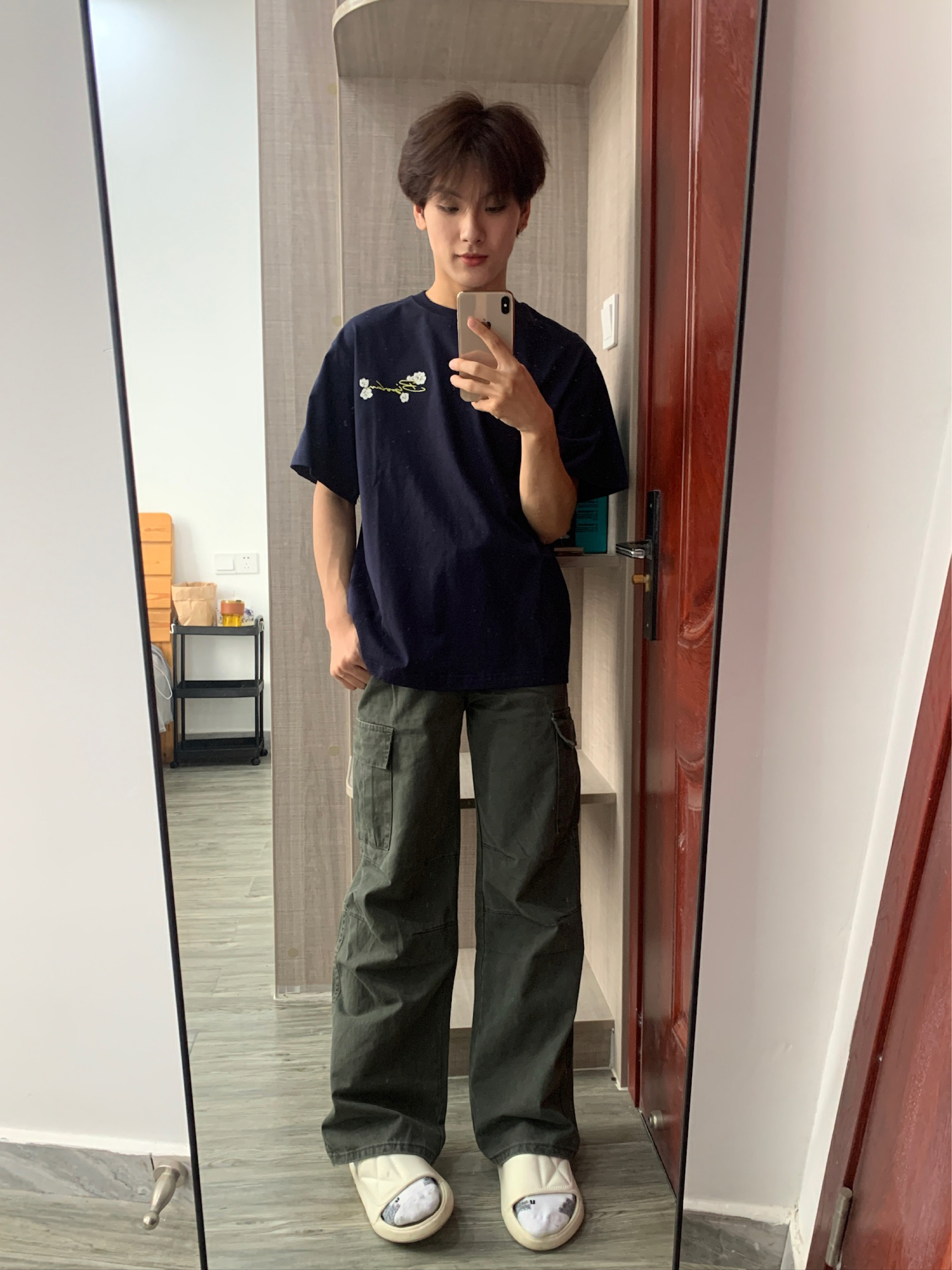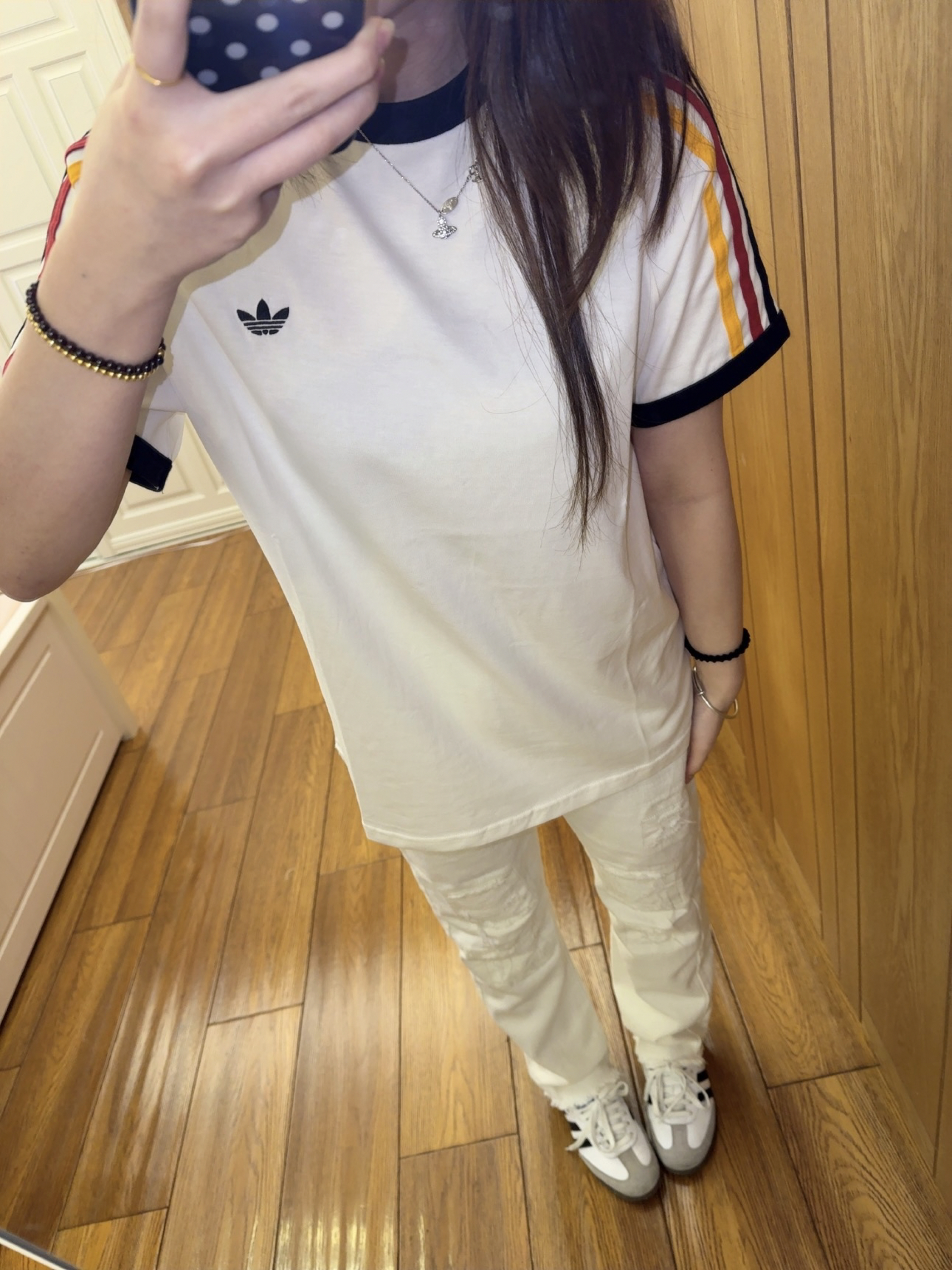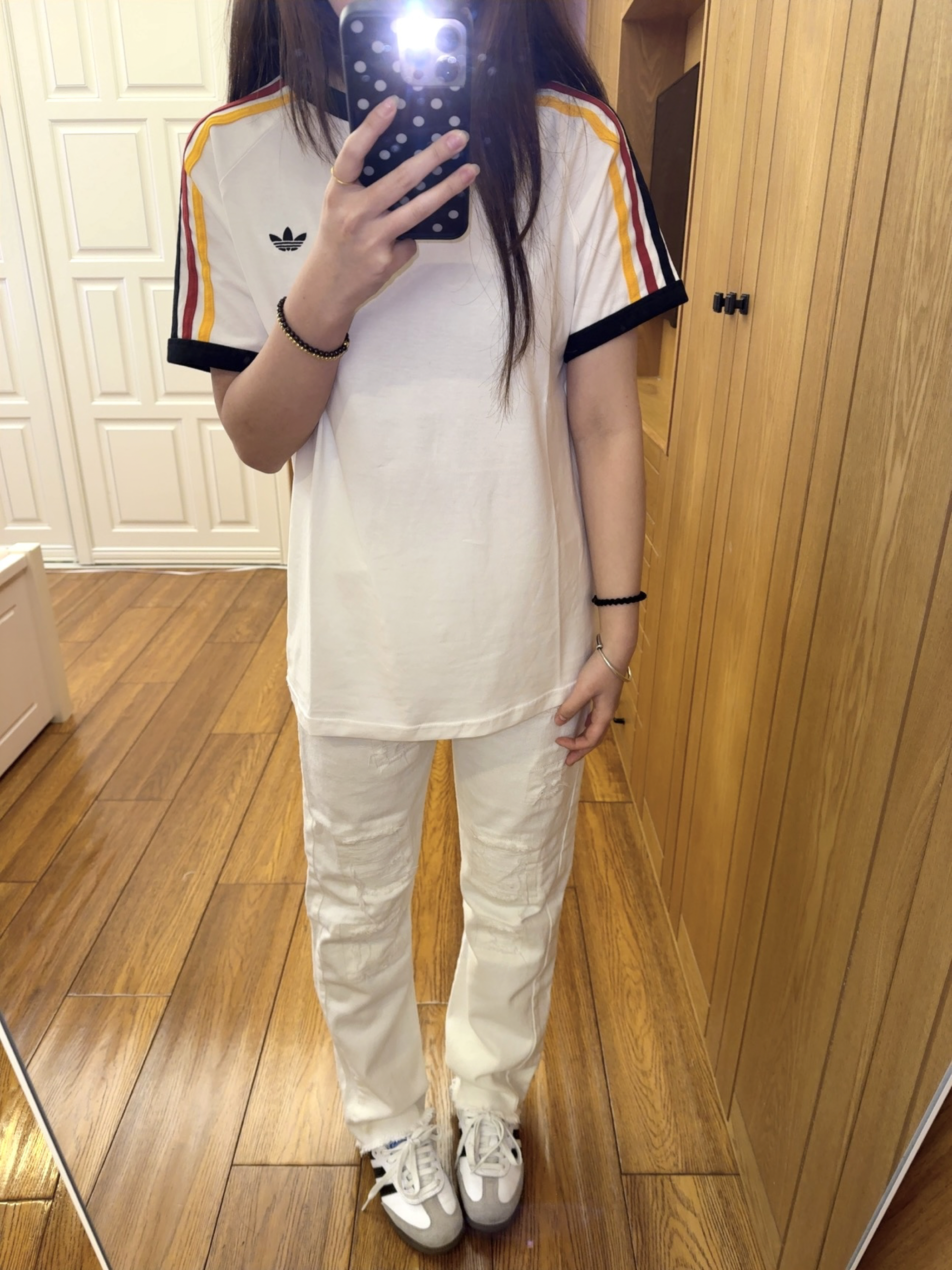 今天穿的是 adidas 家滴衣服 是我新买的一件短袖! 整体上是白色 特别之处就在袖口 三色的条纹设计 很有夏天的气息 红黄黑三色条纹搭配就没有那么单调了 夏天就是要穿特别鲜艳的颜色呀 我160 93穿的是164码的噢 可以盖住一大半屁股