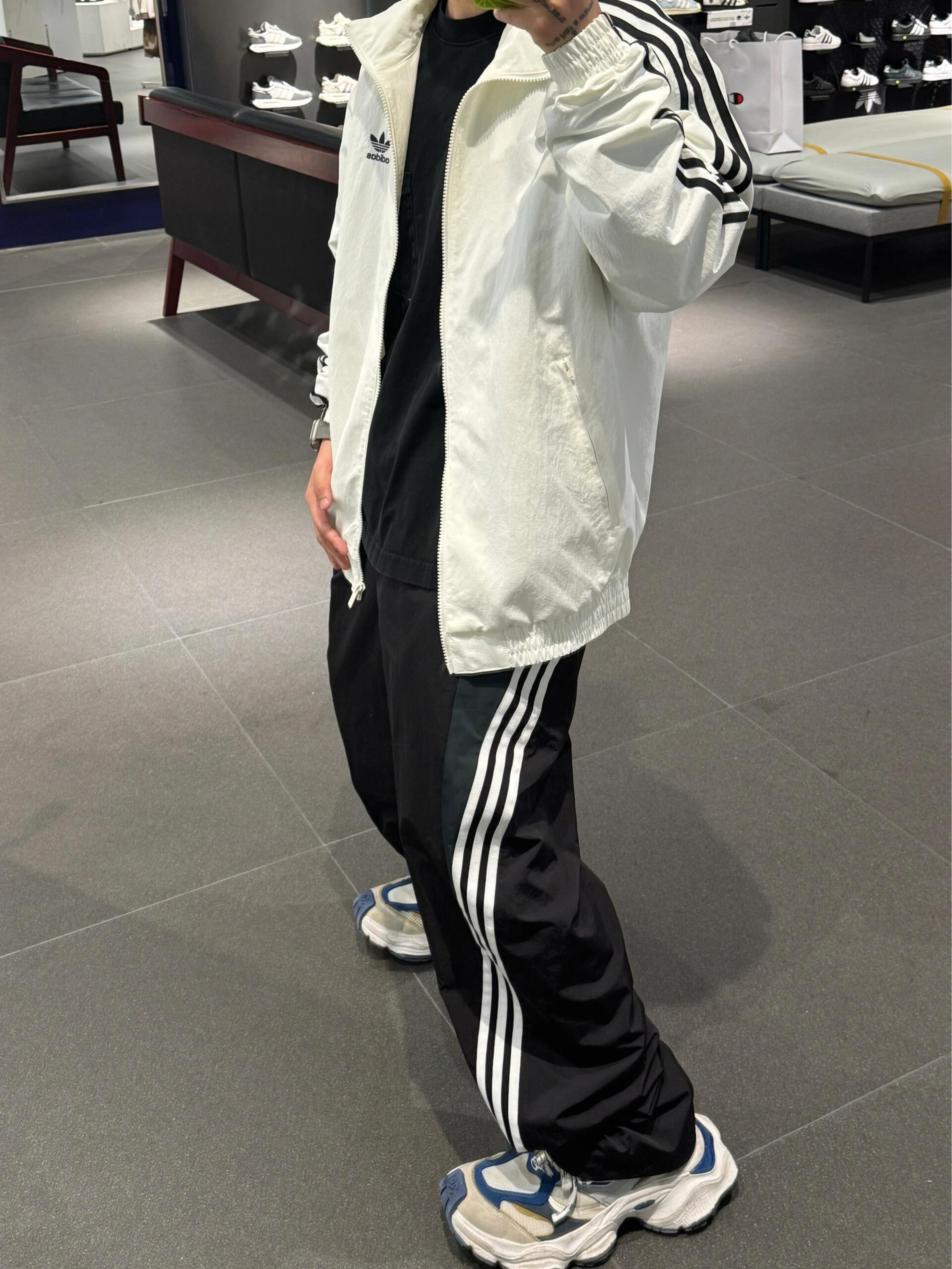 今日帅哥look|这套自留款直接焊在身上! 这条拼色宽松直筒长裤真的有点东西✨ 撞色设计+直筒版型,藏肉显瘦还显腿长,脚口自带抽绳,可盐可甜随意切换,束脚变工装、放落变街头,一裤两穿太香了! 上身搭一件白色经典款外套,干净清爽又少年感拉满,秒变阳光男大,谁穿谁是校园男神,不说了家人们我先冲!