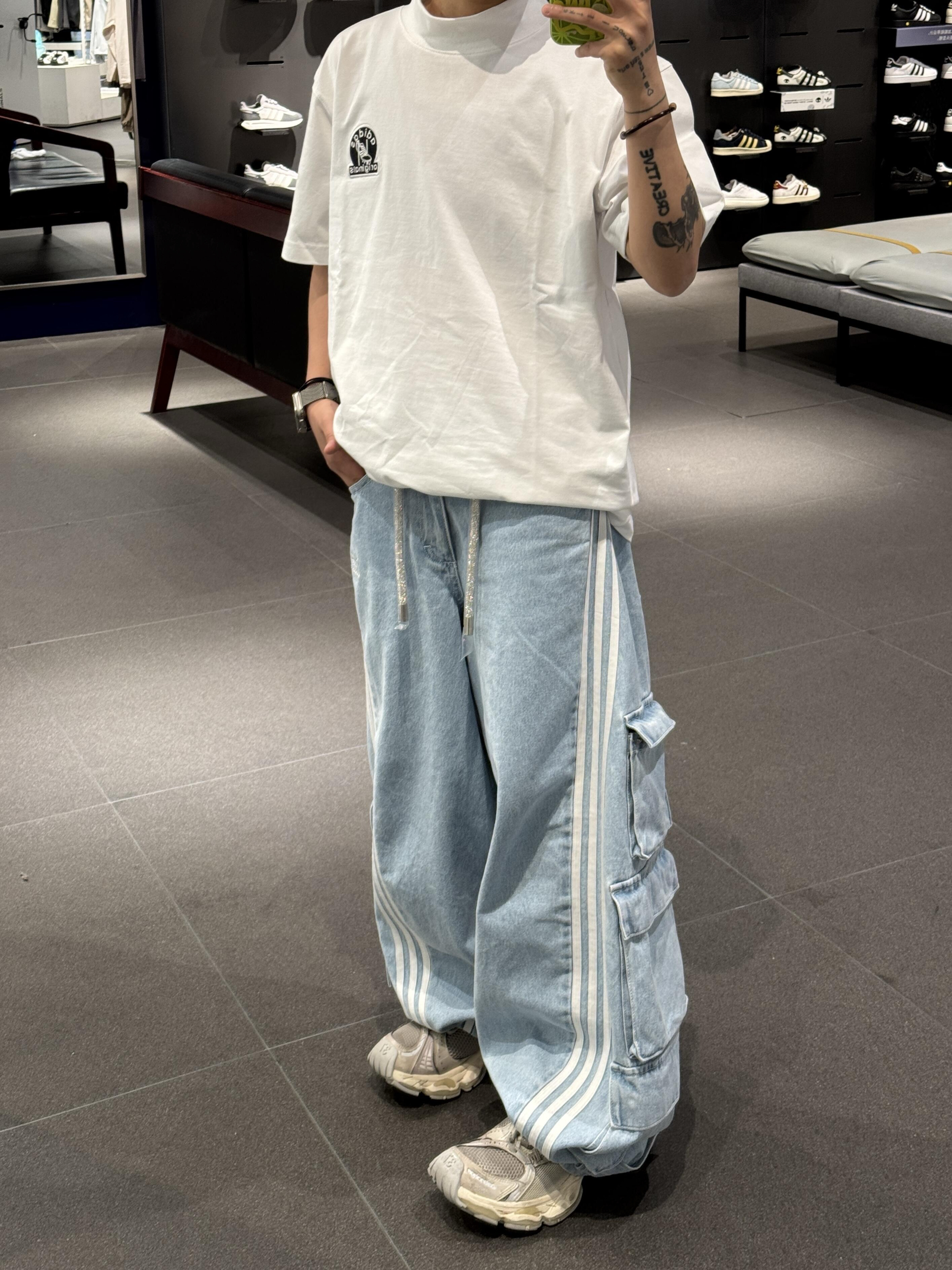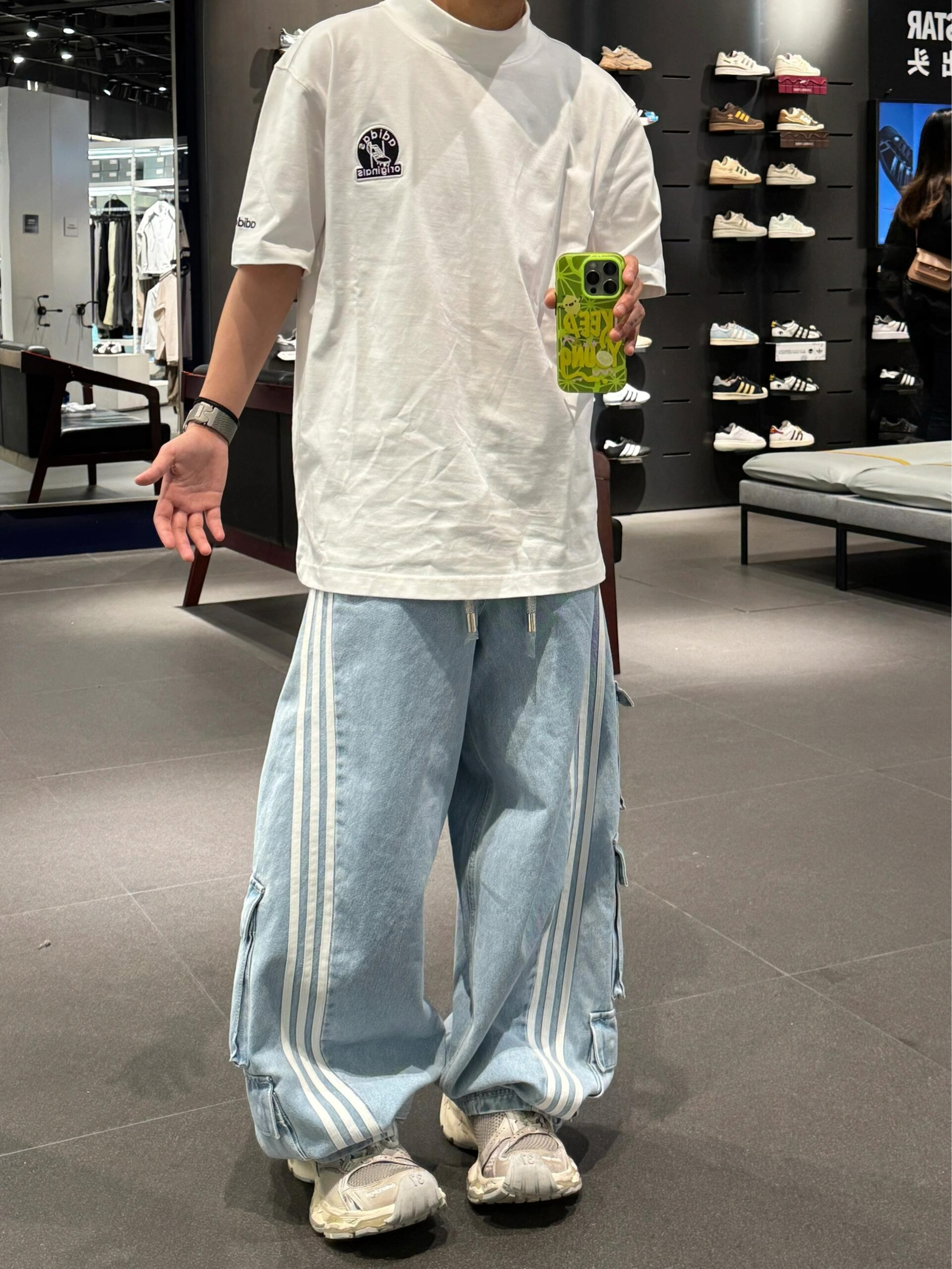 谁懂啊!这条adidas三条杠工装牛仔裤真的是夏日街头天花板🩳 浅蓝水洗牛仔+经典三条杠,美式复古感直接拉满,清爽又显白! 阔腿工装版型+侧边大口袋,慵懒随性又能装,抽绳腰头不挑身材,对梨形/胯宽超友好, 搭白T、卫衣都好看,配老爹鞋秒变街头潮人,夏天穿它出门,松弛感直接被它拿捏住!