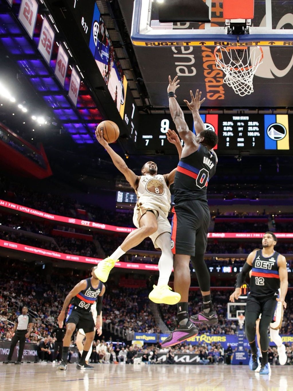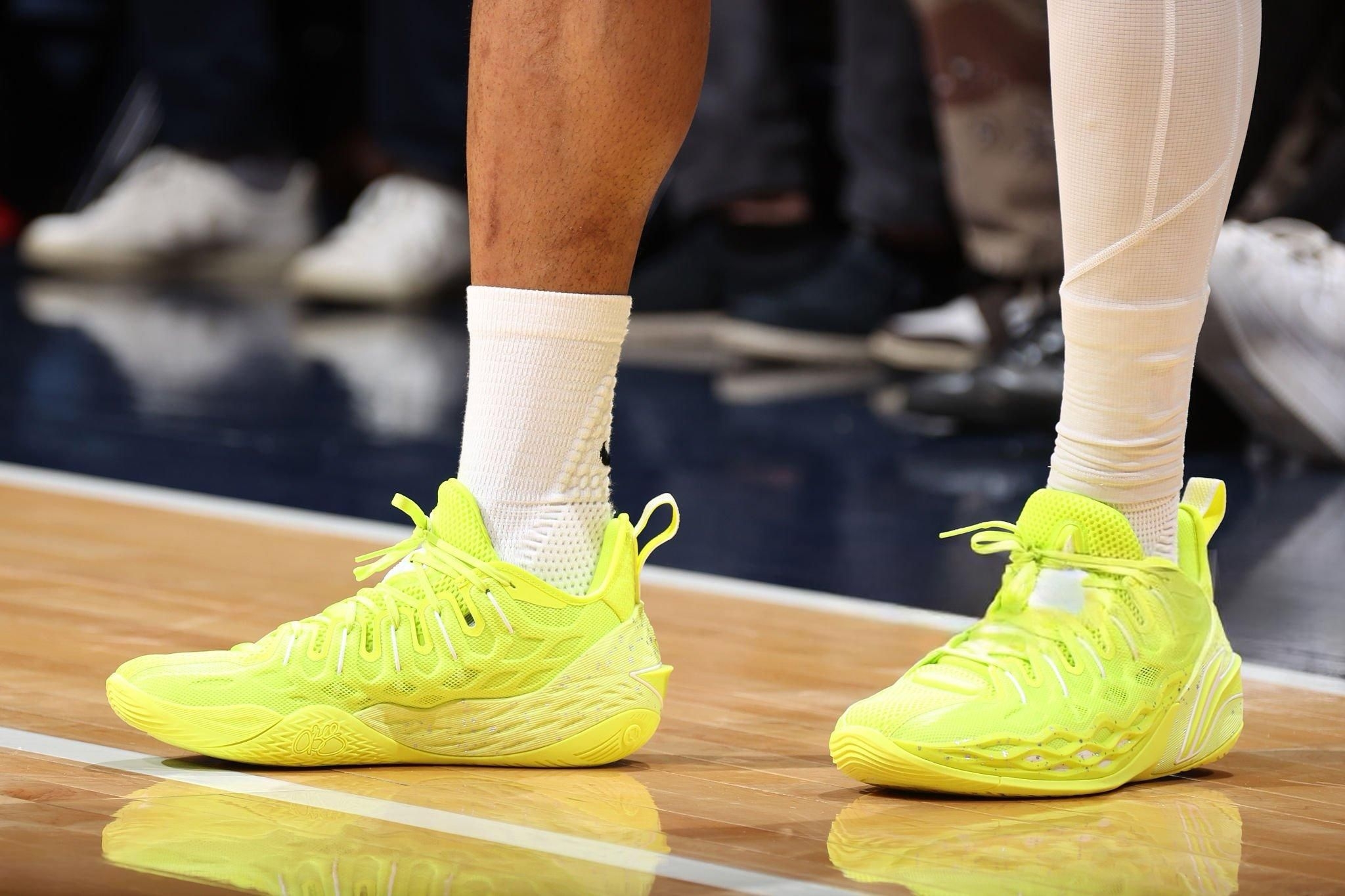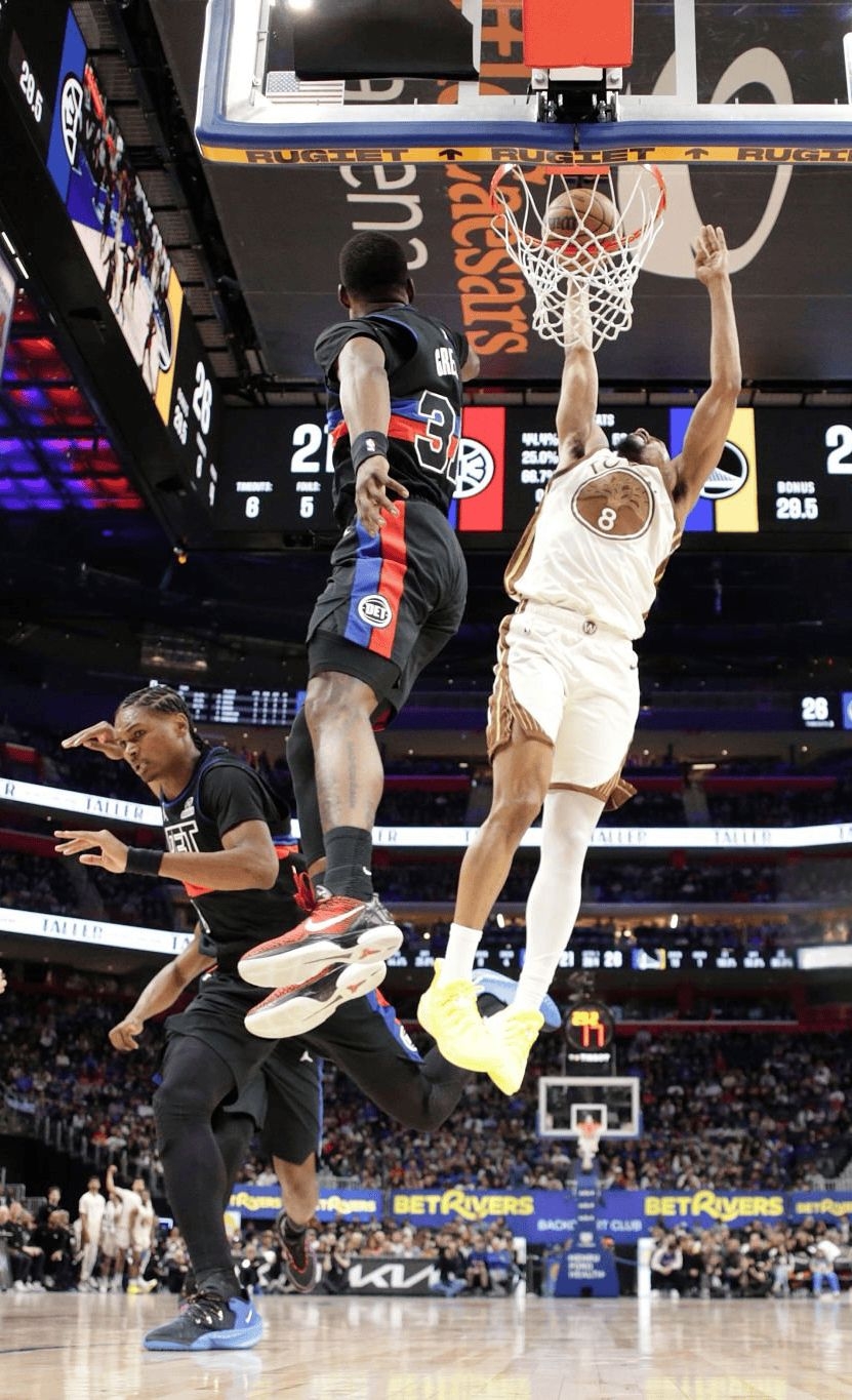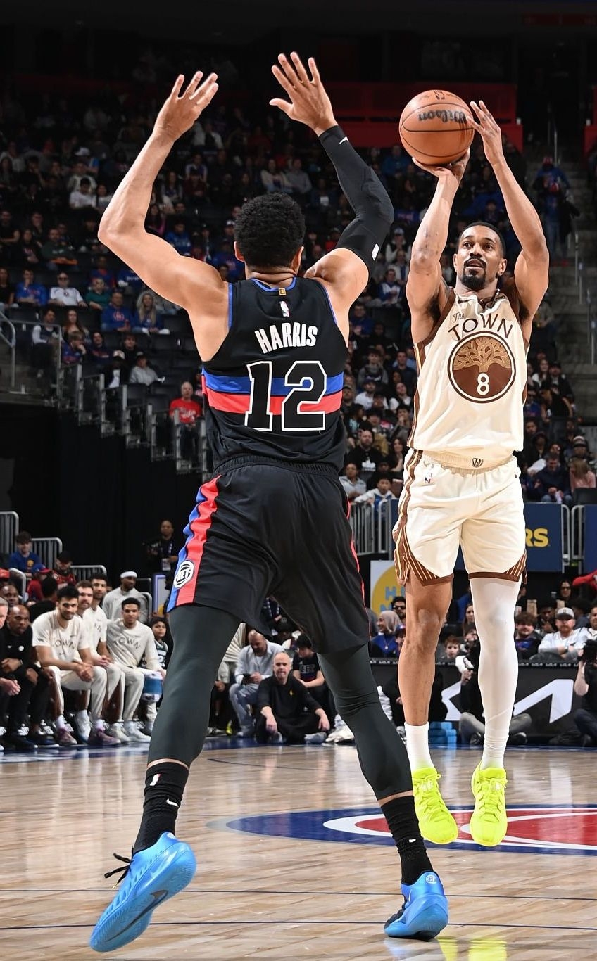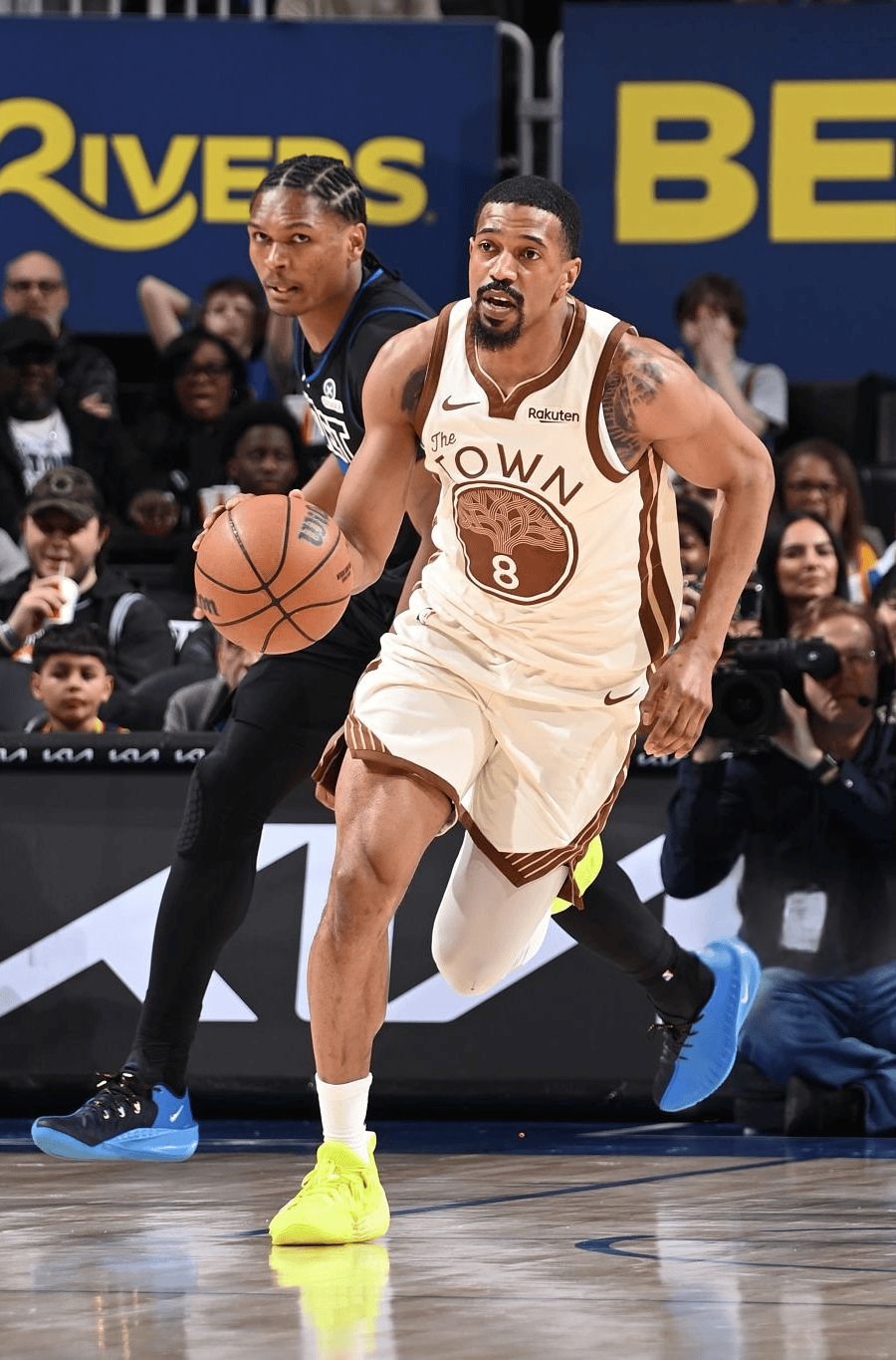 今日NBA常规赛勇士101-115不敌活塞。 本场比赛,勇士队球员丹东尼-梅尔顿出战22分钟,投篮14中5,三分球6中2,罚球3中2,得到14分4篮板1盖帽。 比赛中,梅尔顿上脚李宁 Buckets“网球”。