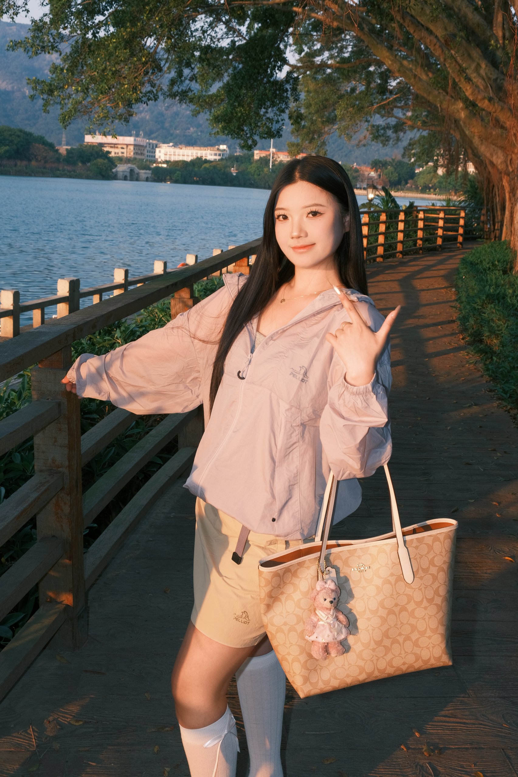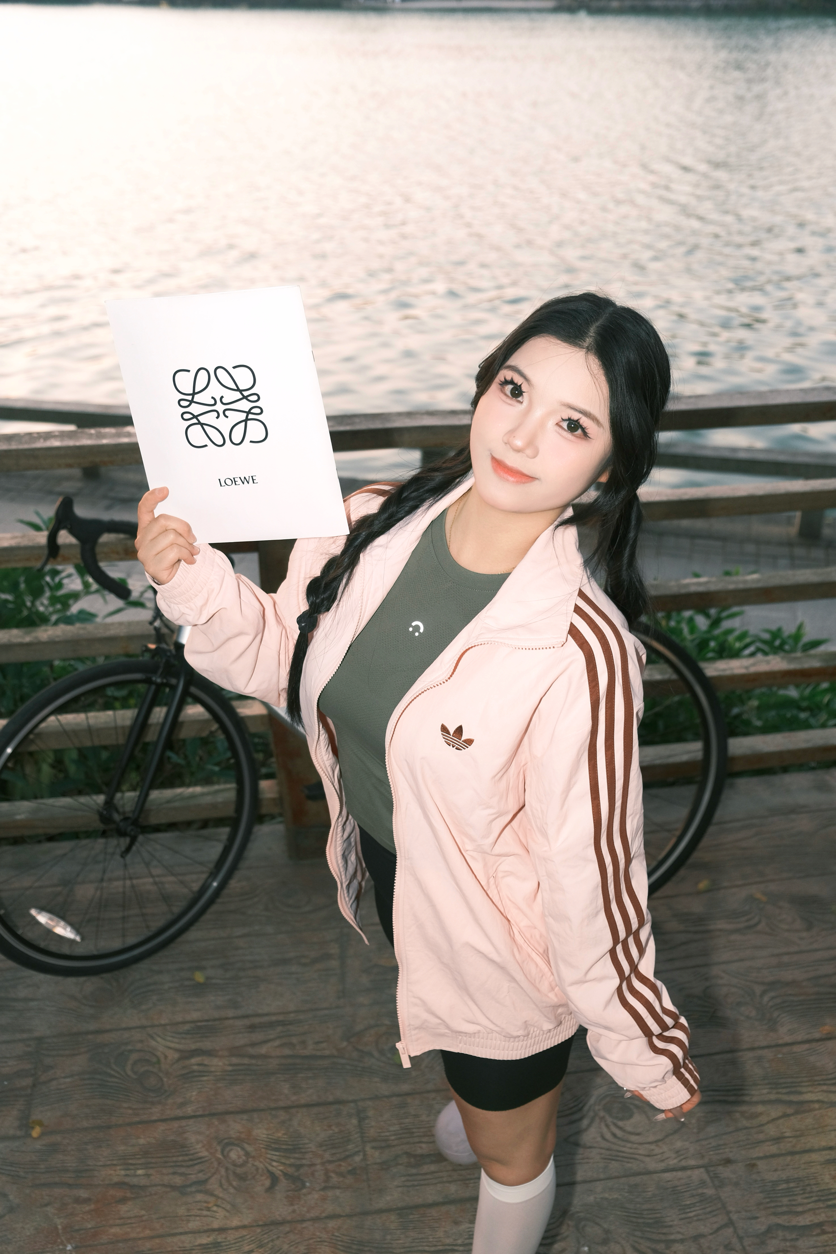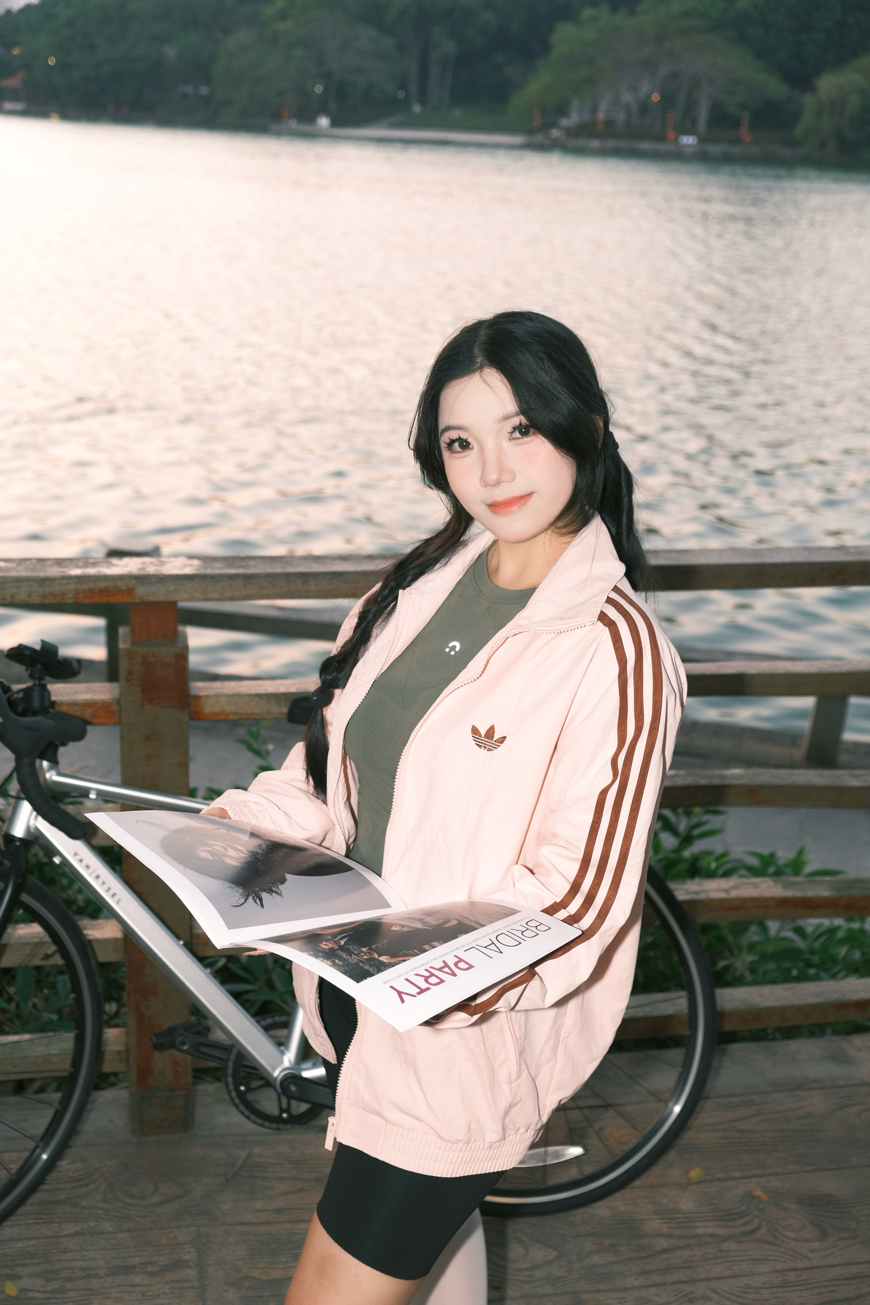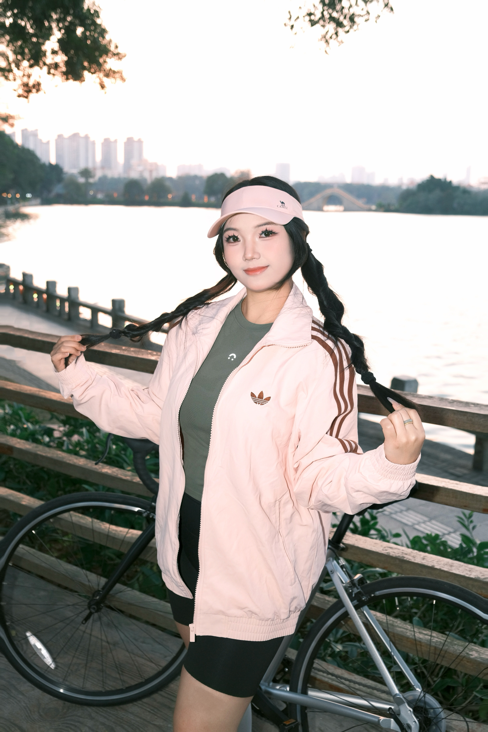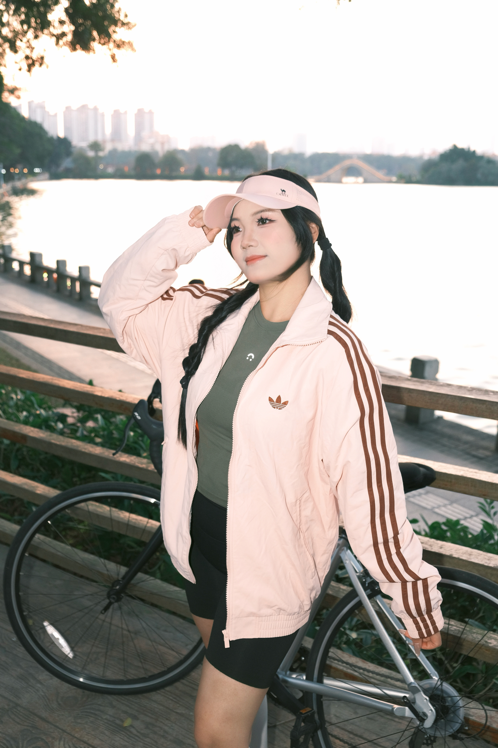今天的温柔是日落给的,也是这件粉棕外套给的。 软乎乎的浅粉底色,配上三条棕条纹,复古感直接拉满。 轻薄面料刚好适合开春的风,骑车、散步都不闷。 内搭一件军绿小上衣,甜酷平衡得刚刚好。 下装搭骑行裤,再踩一双小白袜,活力感瞬间拉满。 湖边日落时拍这组,暖光衬得整个人都温柔了。