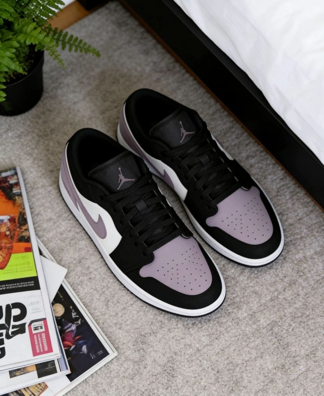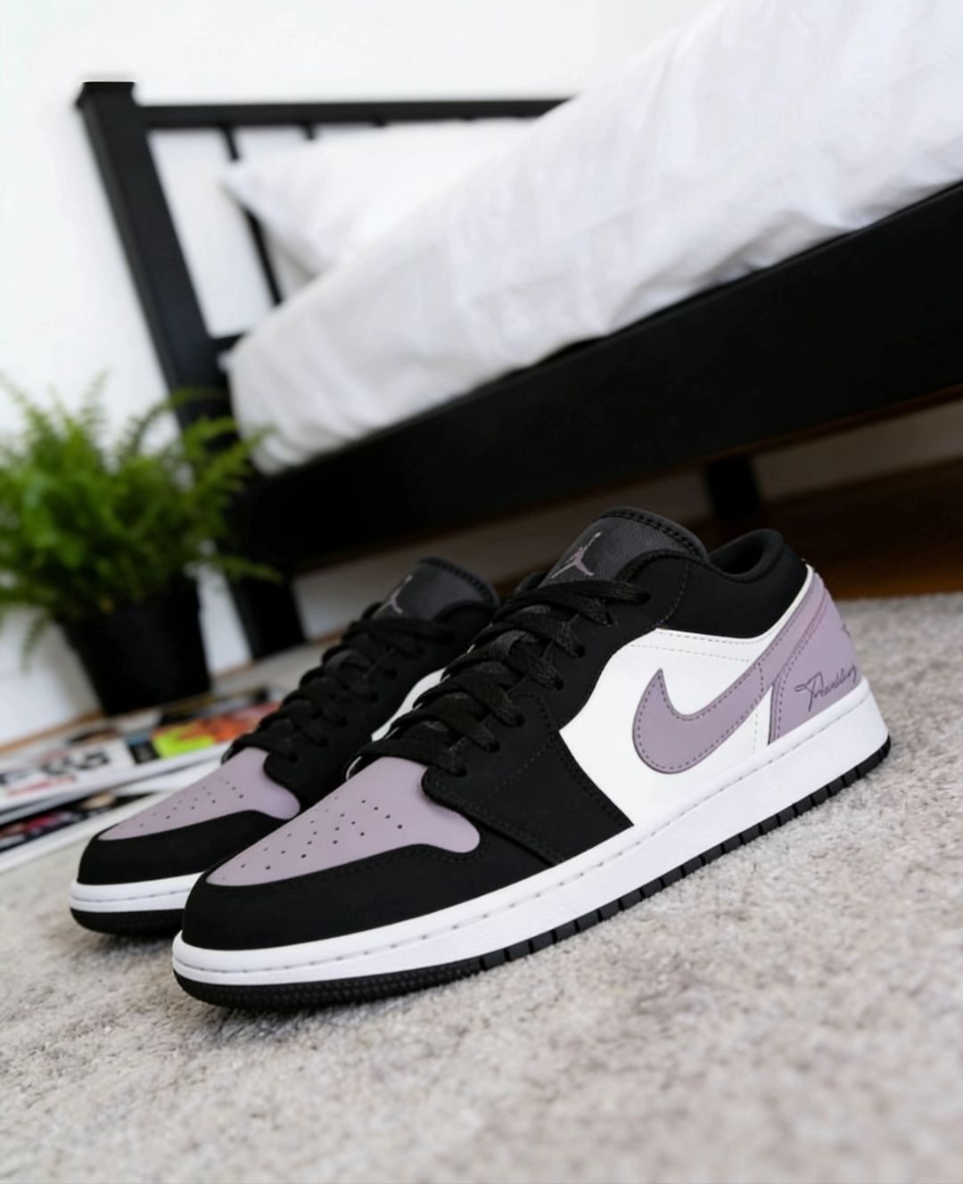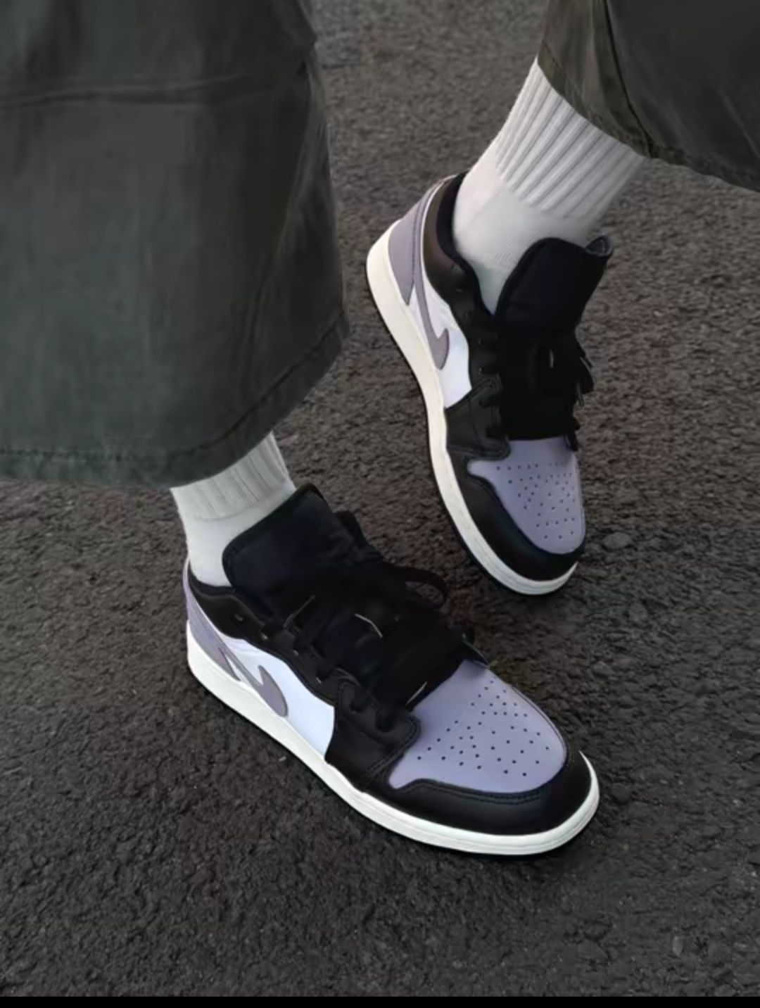 谁懂啊!这双黑紫AJ1也太温柔了吧! 淡紫+黑撞色,甜酷双修,搭牛仔裤直接封神! 上脚舒服到想蹦跶,后跟签名细节拉满~ 春天就该穿点“有味道”的鞋,这芋泥味我先冲了!
