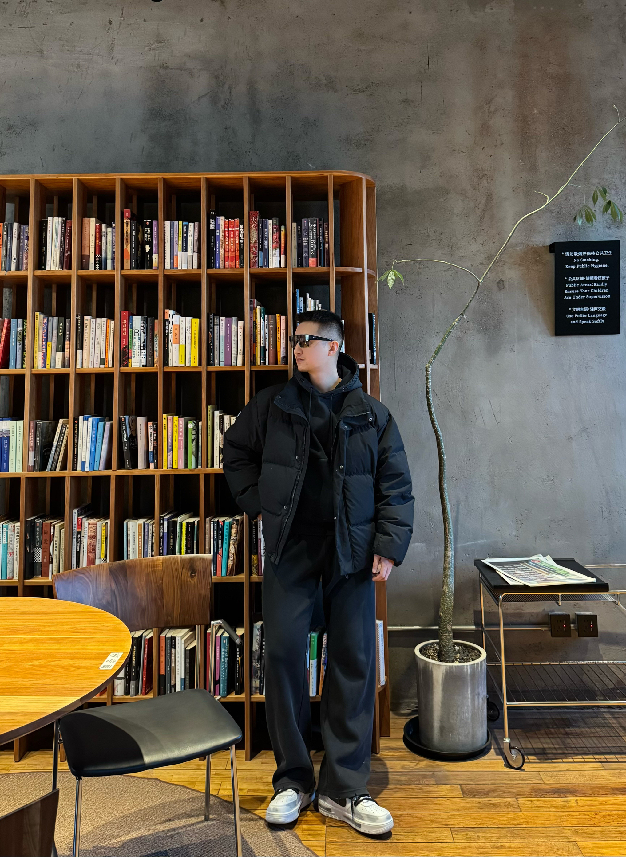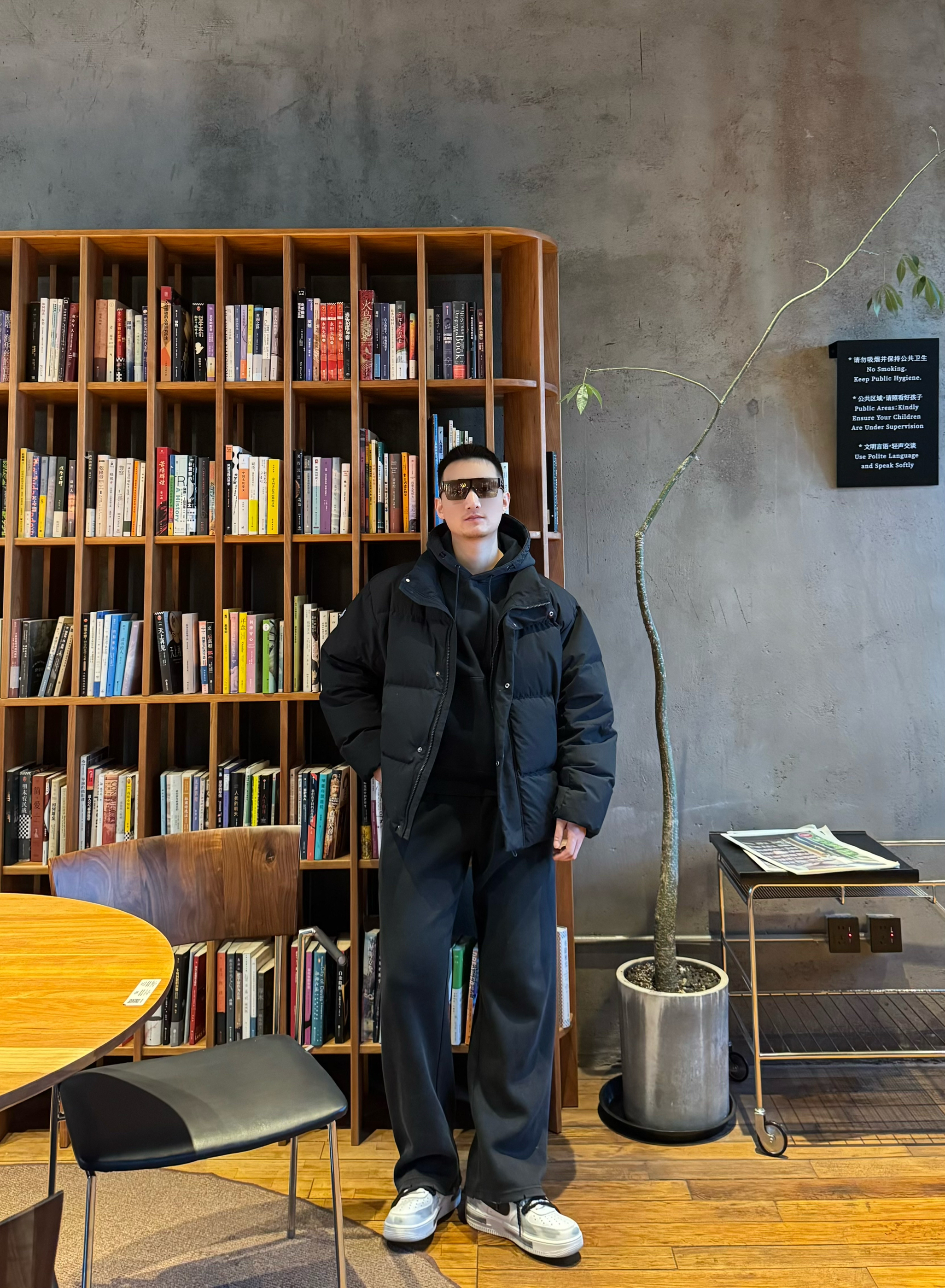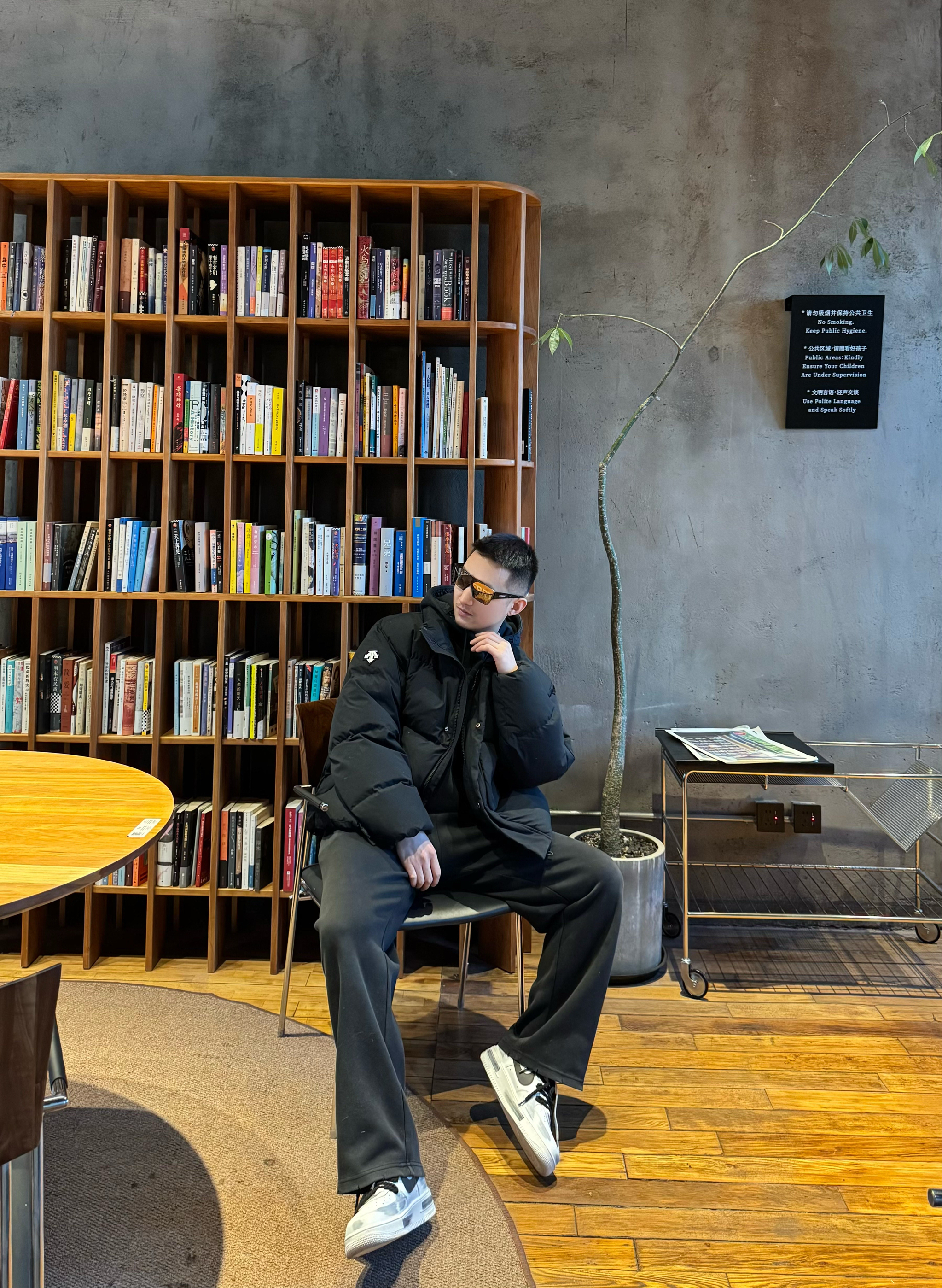 进入工业风的咖啡馆角落冷墙、原木、满架书 氛围感拉满 纯黑色的羽绒服 加厚保暖 撞色的刺绣点缀 简约而不简单 搭配黑色休闲长裤同色系百搭显腿长 再穿一双定制款的板鞋 双鞋带造型感十足坐在咖啡馆 随手一拍就很出片!