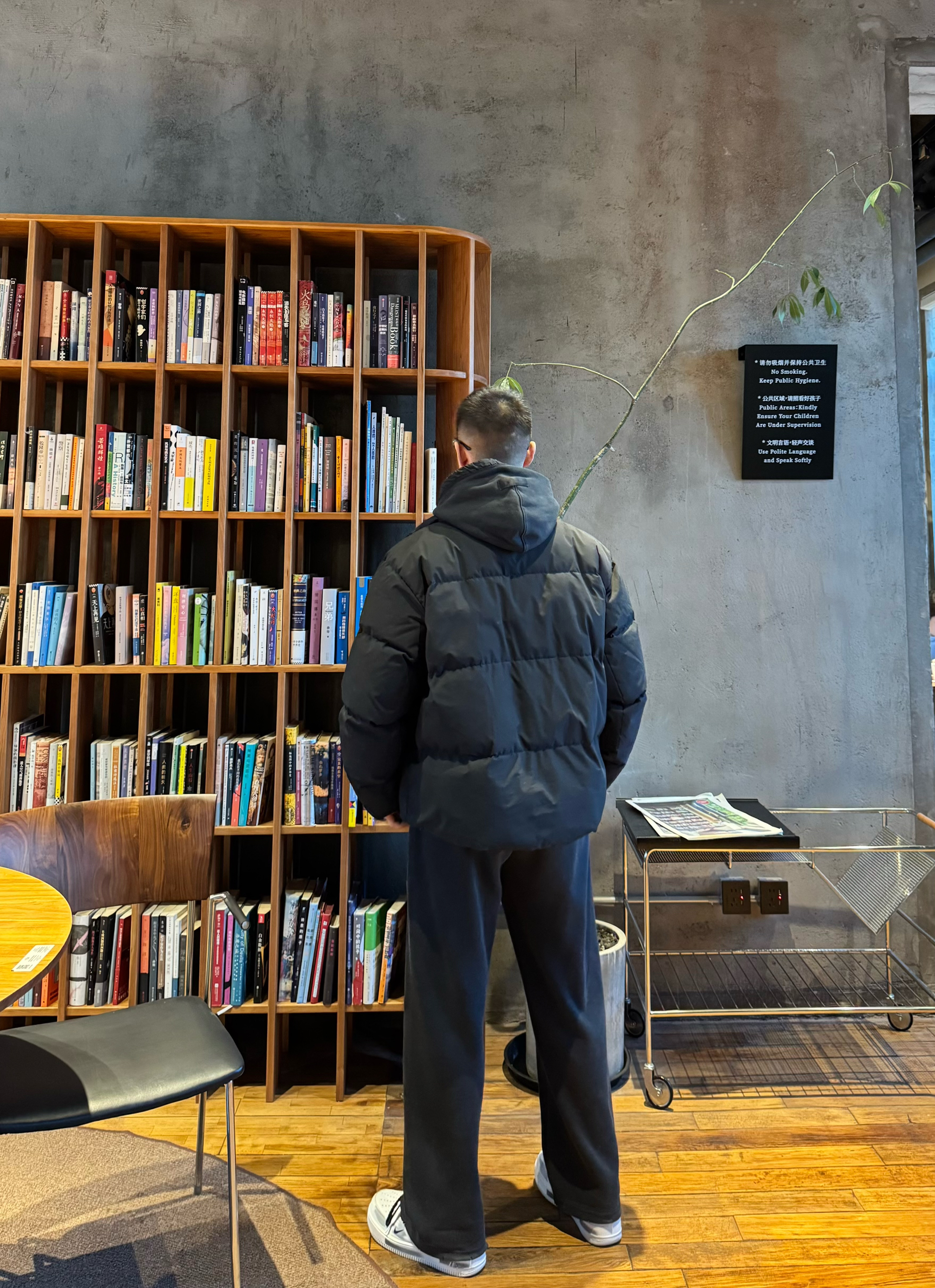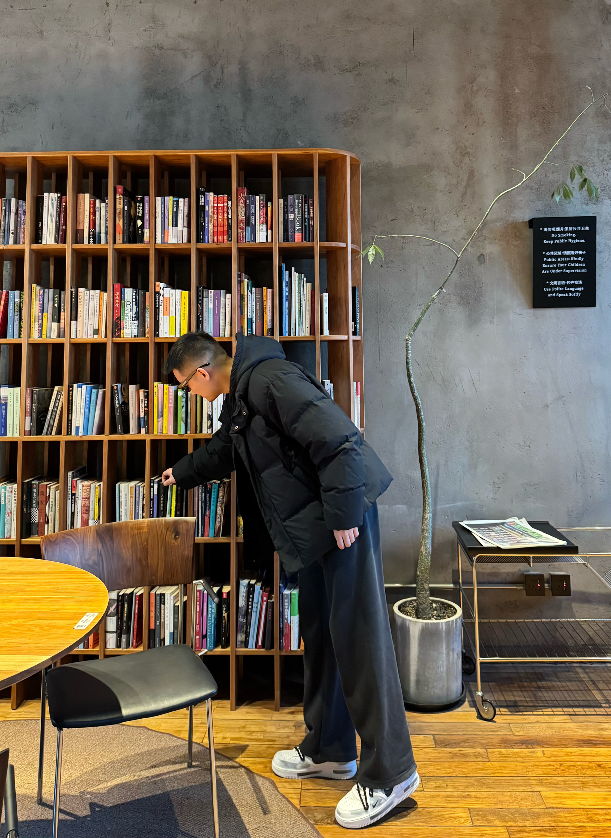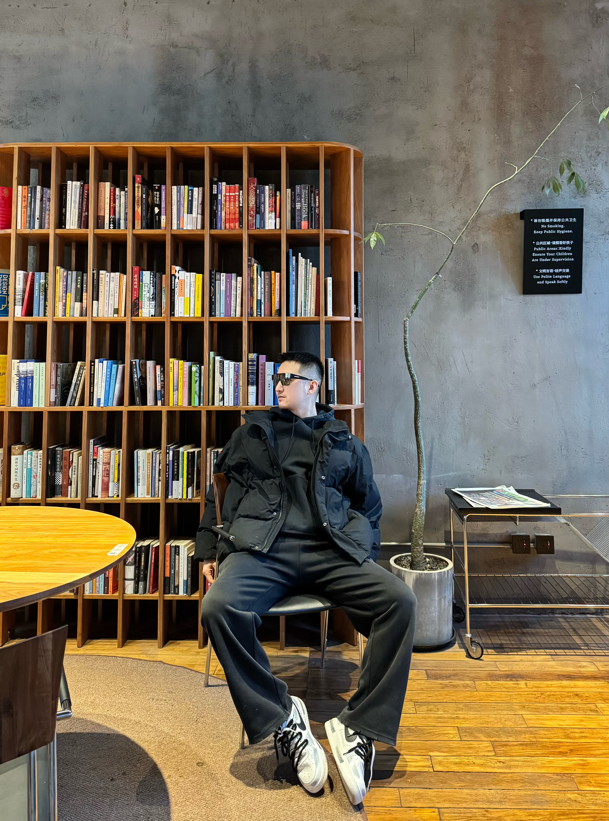 进入工业风的咖啡馆角落冷墙、原木、满架书 氛围感拉满 纯黑色的羽绒服 加厚保暖 撞色的刺绣点缀 简约而不简单 搭配黑色休闲长裤同色系百搭显腿长 再穿一双定制款的板鞋 双鞋带造型感十足坐在咖啡馆 随手一拍就很出片!