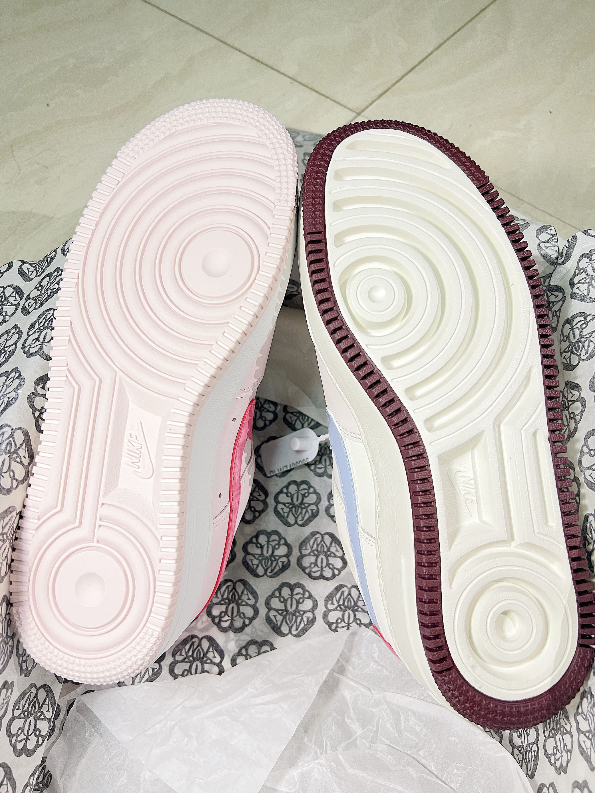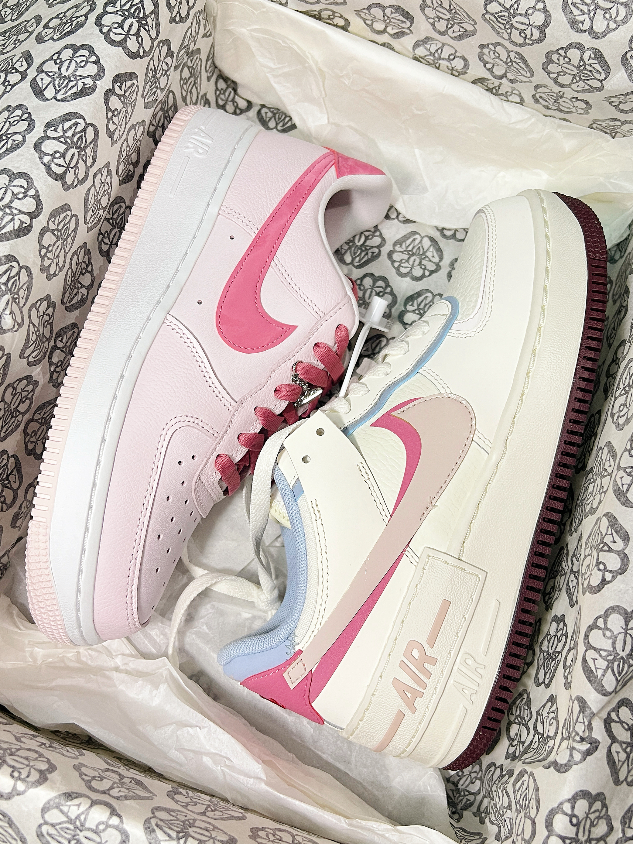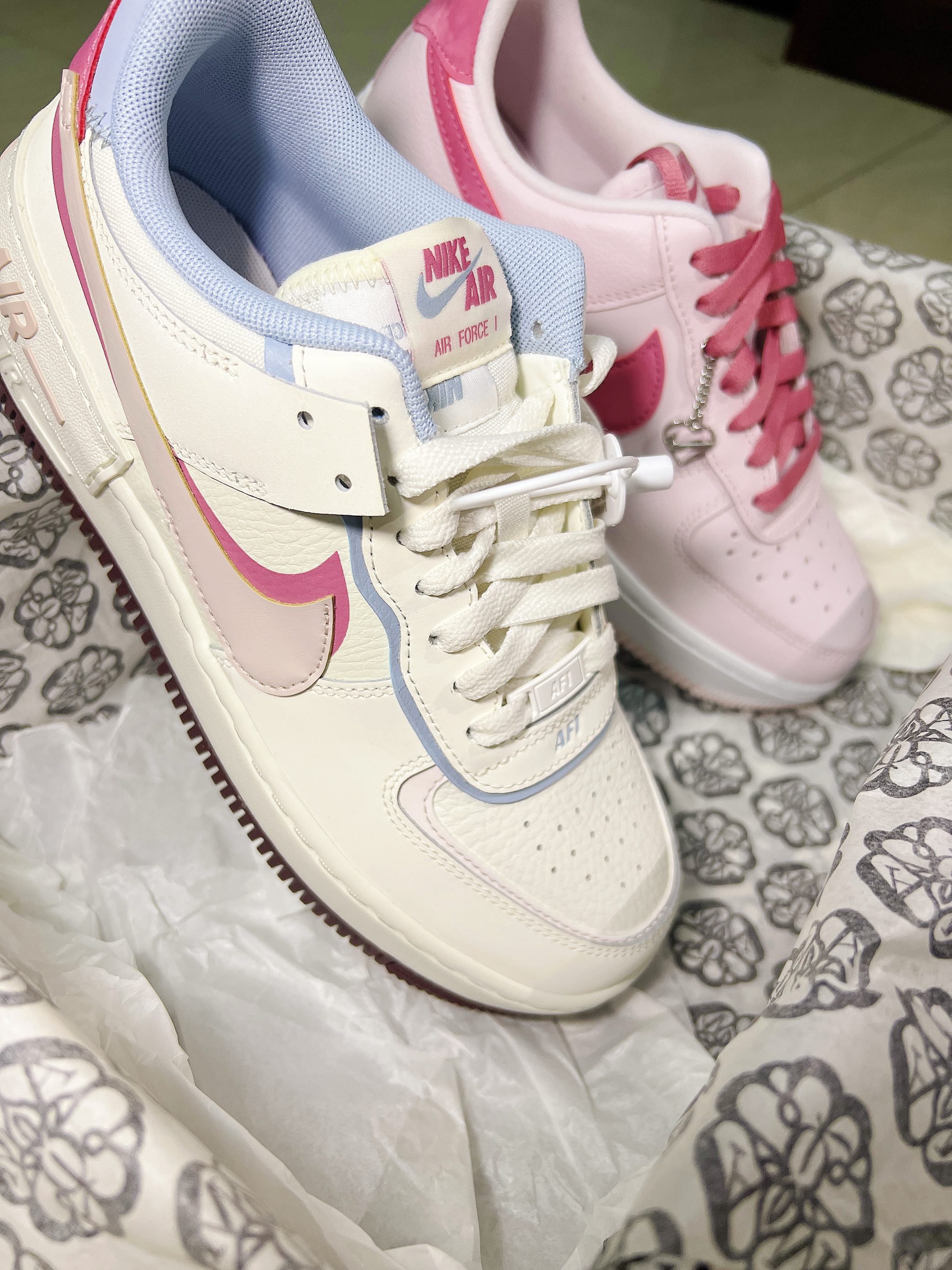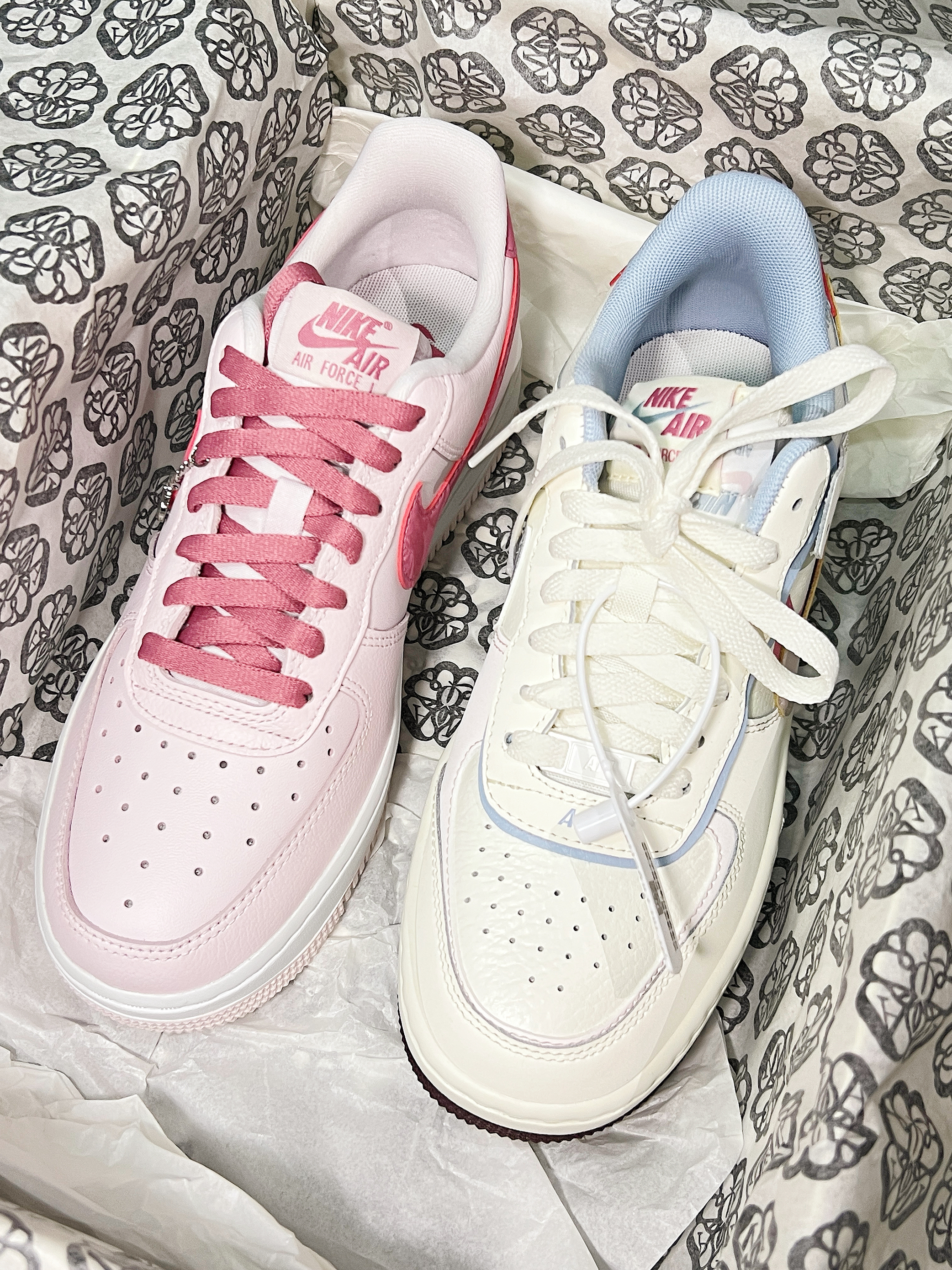 1️⃣粉色款整体是樱花粉+深粉撞色,像一杯草莓奶昔 鞋舌、后跟、Swoosh都是同色系丝绒/皮革质感,搭配深粉鞋带,还有爱心挂饰细节鞋底是淡粉色,视觉上更显干净利落 2️⃣白蓝粉款米白基底+浅蓝+樱花粉+酒红外底,层次丰富的马卡龙撞色解构风双层鞋头+后跟立体“AIR”字样,鞋跟还有刺绣“nike”小标浅蓝鞋领中和了粉色的甜腻,更有元气感,视觉上更活泼减龄