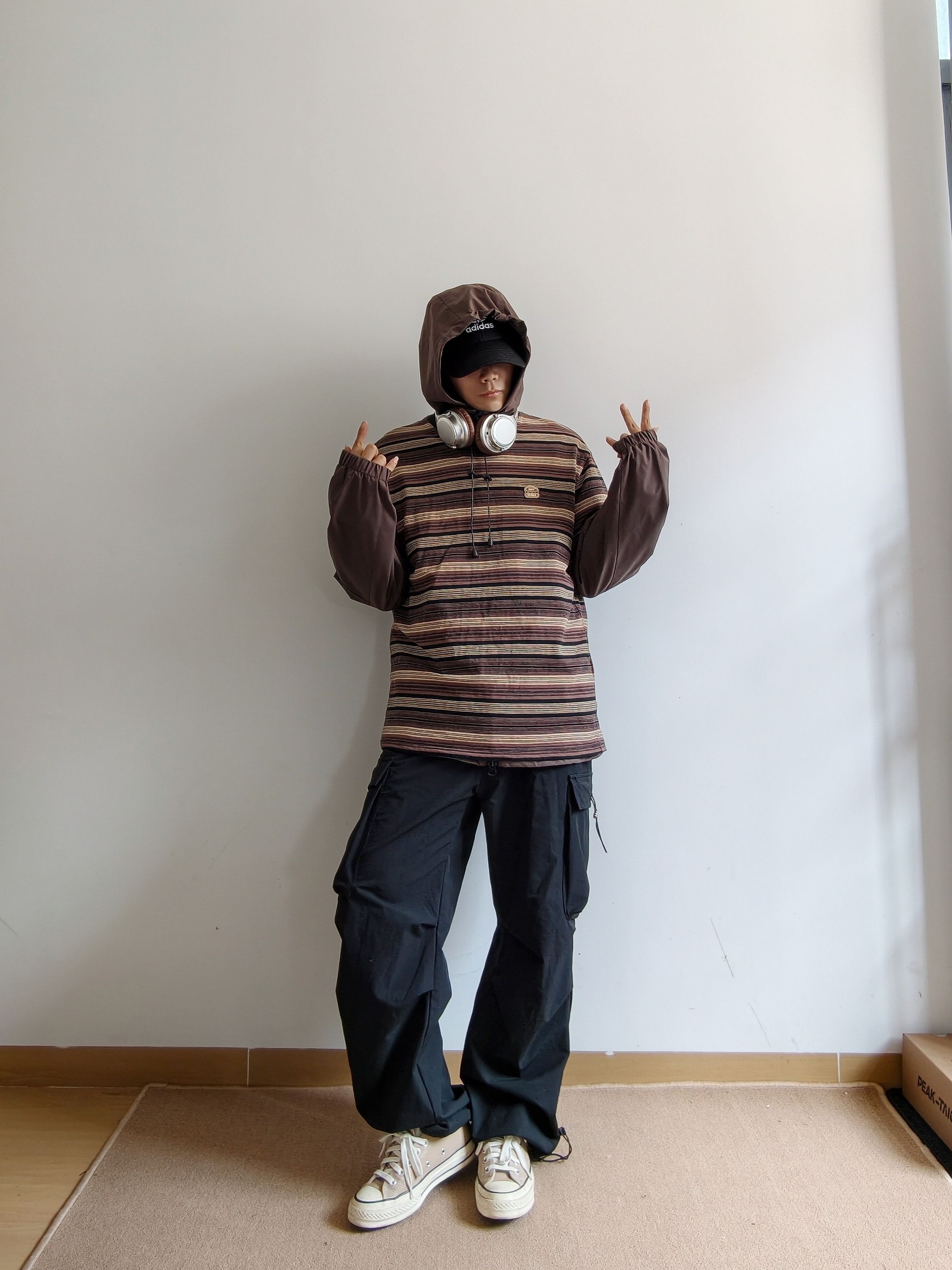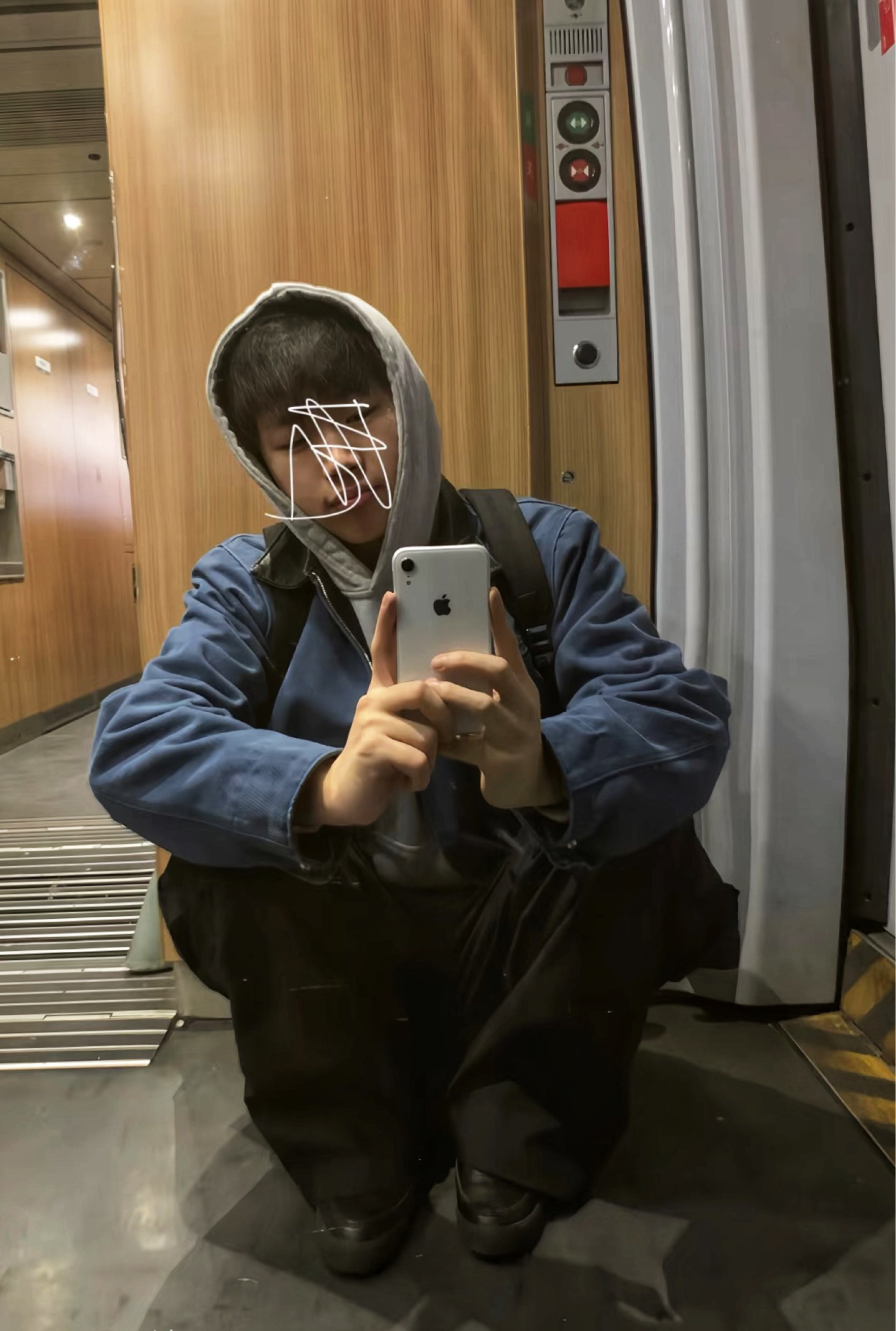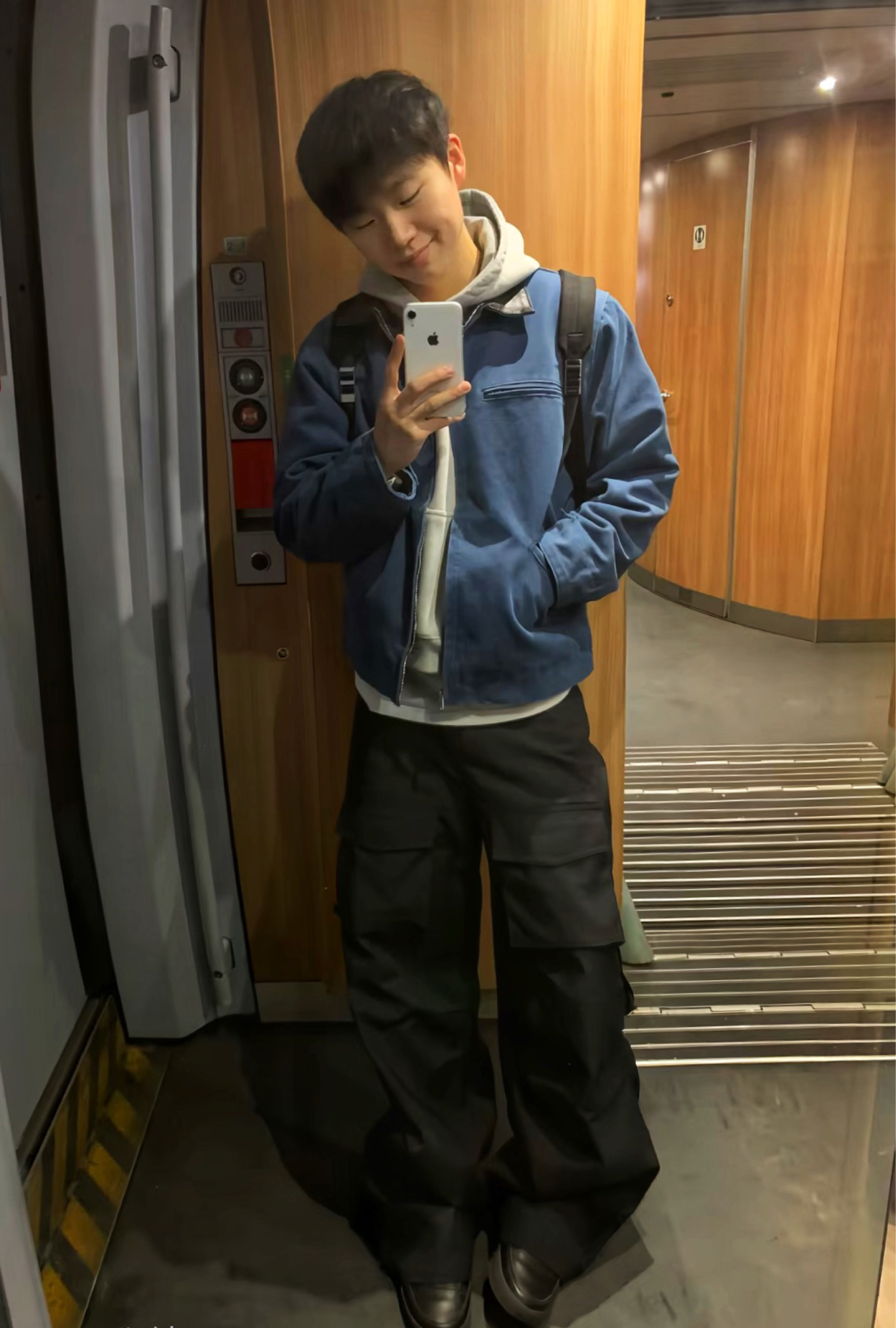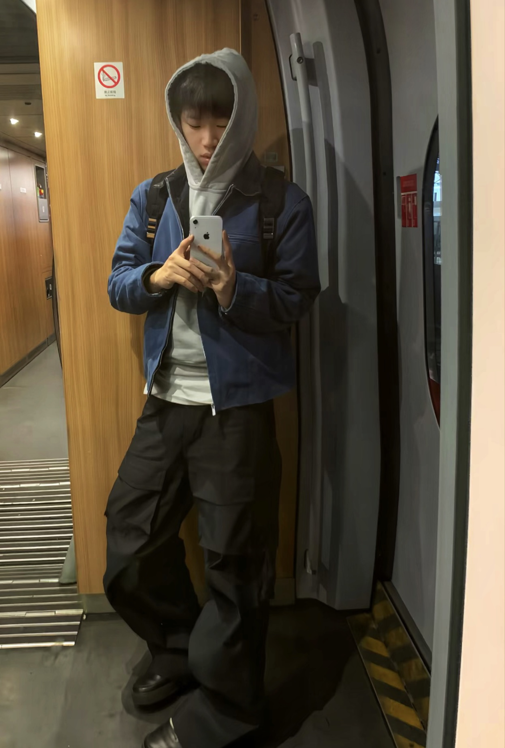 藏青短款工装夹克叠穿浅灰连帽卫衣,层次分明又利落。🧢 黑色阔腿工装裤垂坠感拉满,藏住腿型还显利落,搭配厚底皮鞋,街头感与少年感平衡得刚好。🤓 背着双肩包,在车厢镜子前随手一拍,是随性又不费力的日系少年感,通勤或出行都适配。