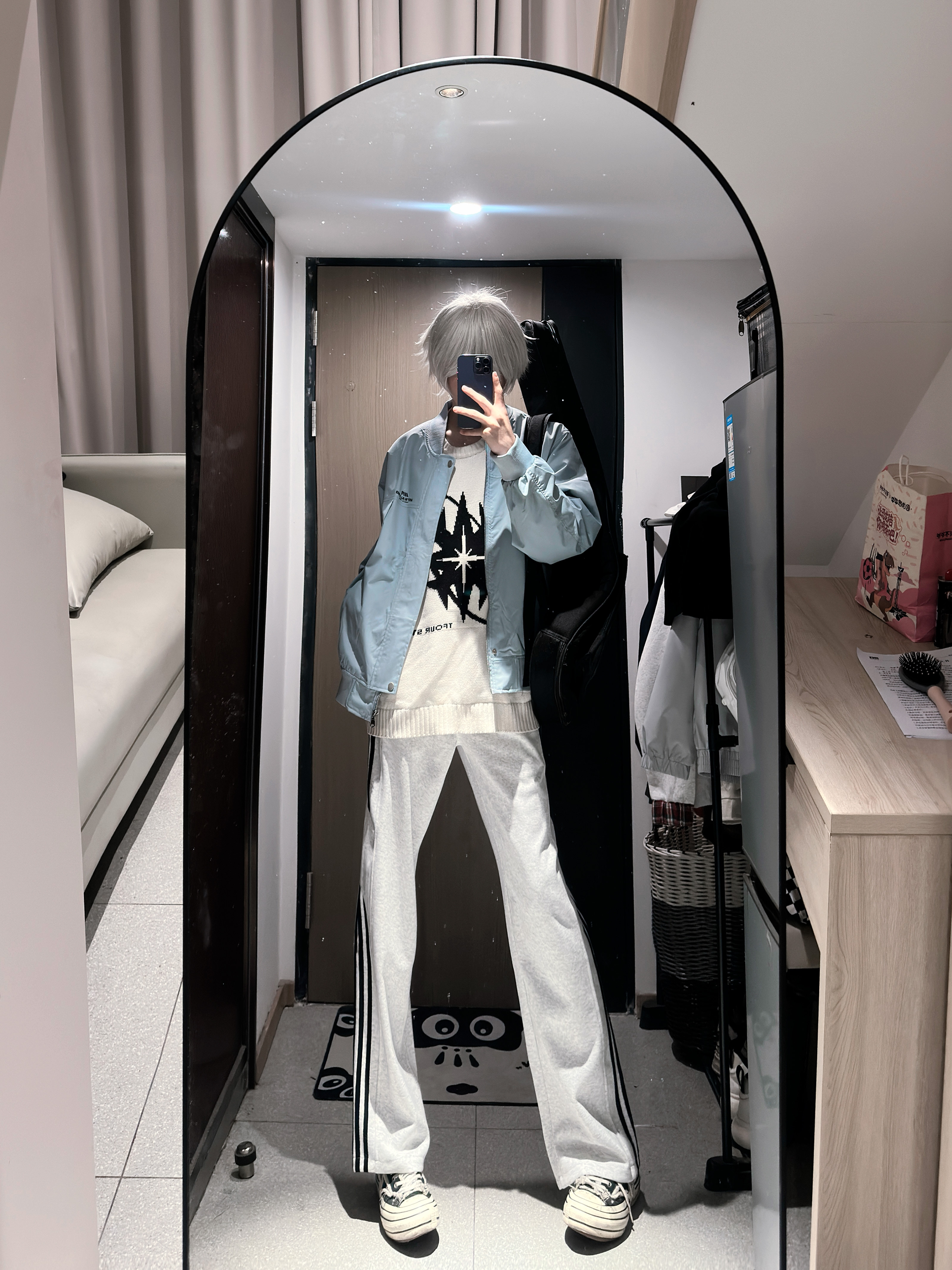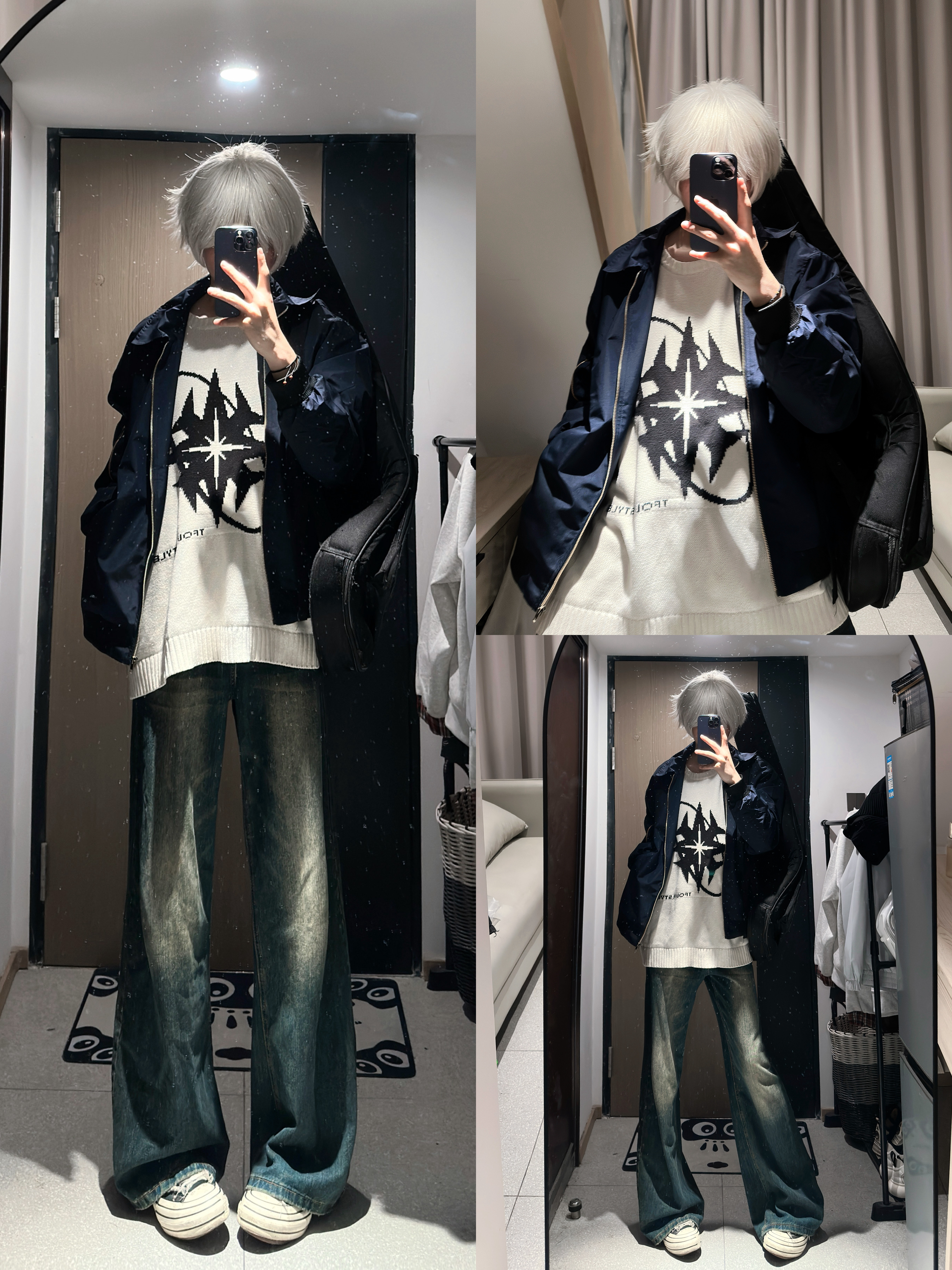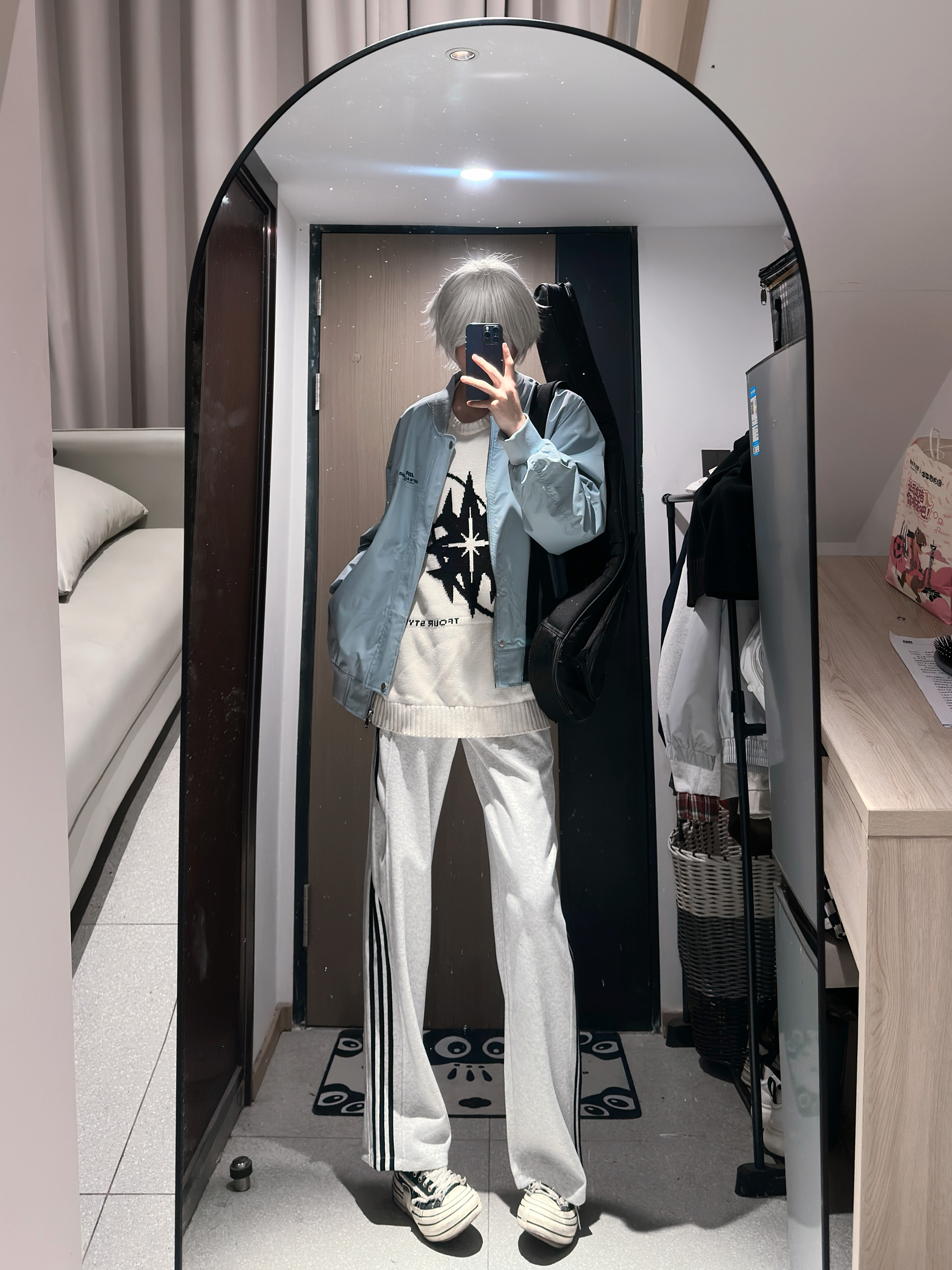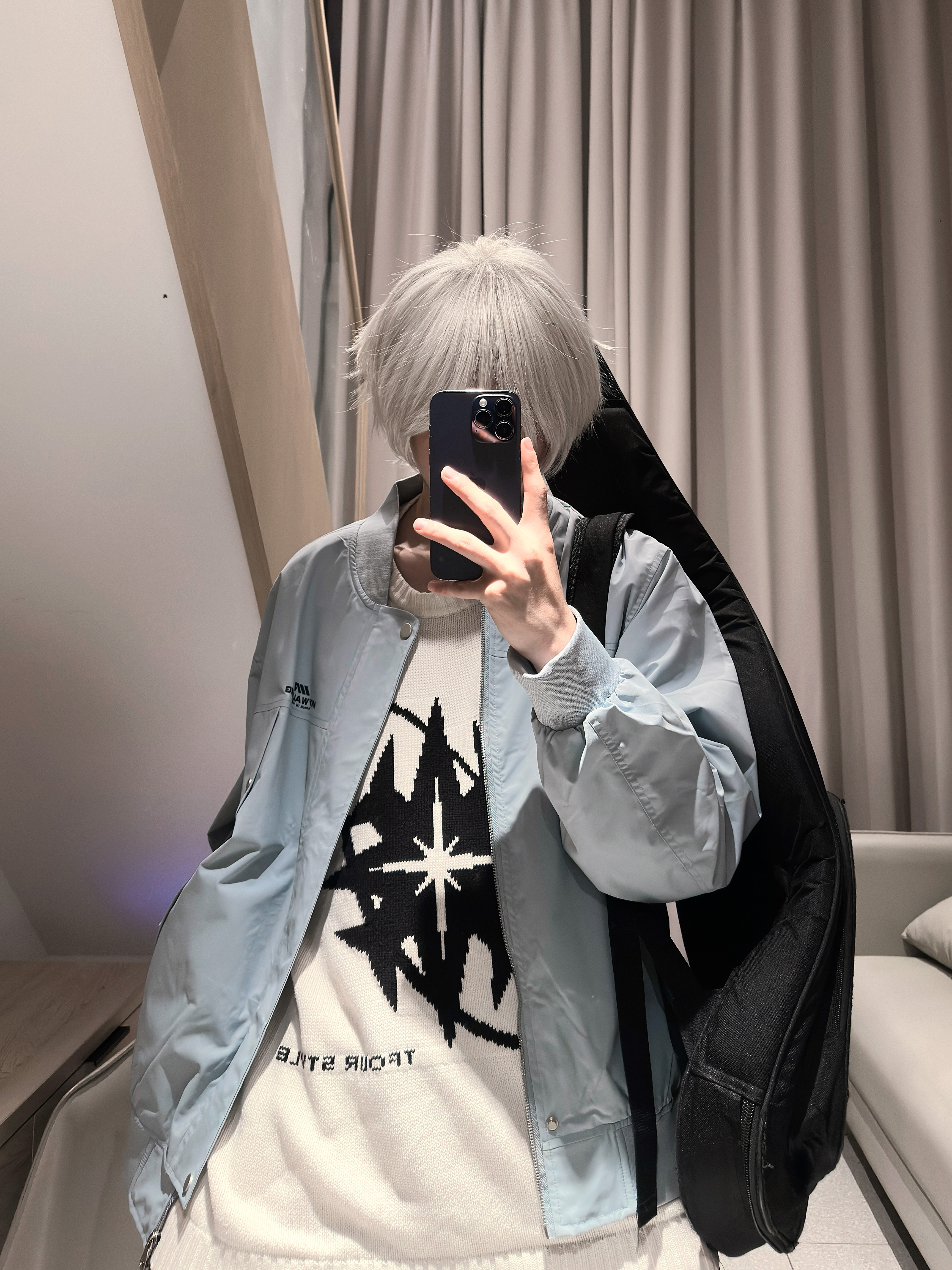美式复古夹克外套好爱 面料上身质感十足 蓝色显白又耐看 内里叠穿一件白色毛衣就可以 下身再搭配一条条纹休闲裤 轻松拿捏少年感