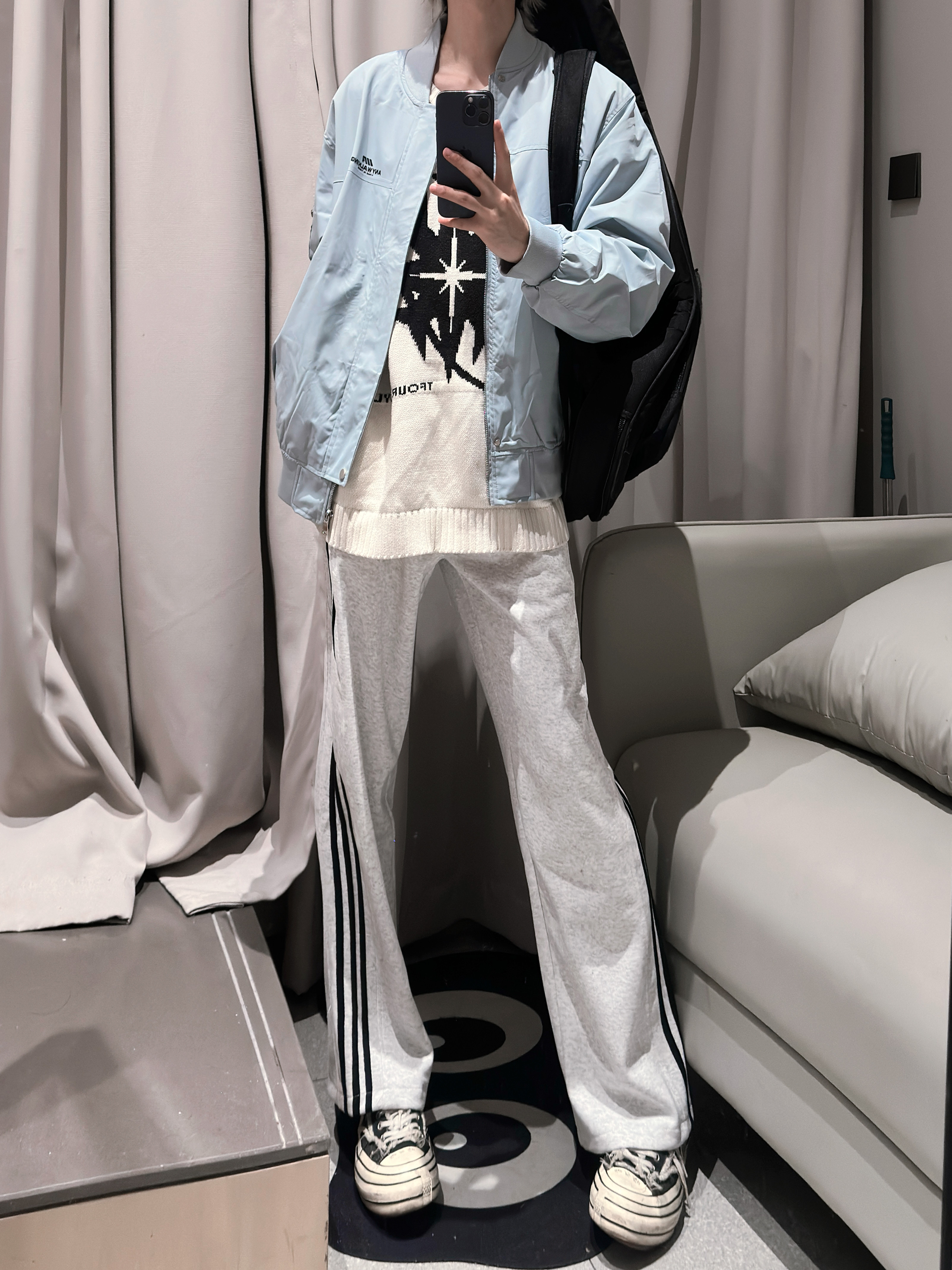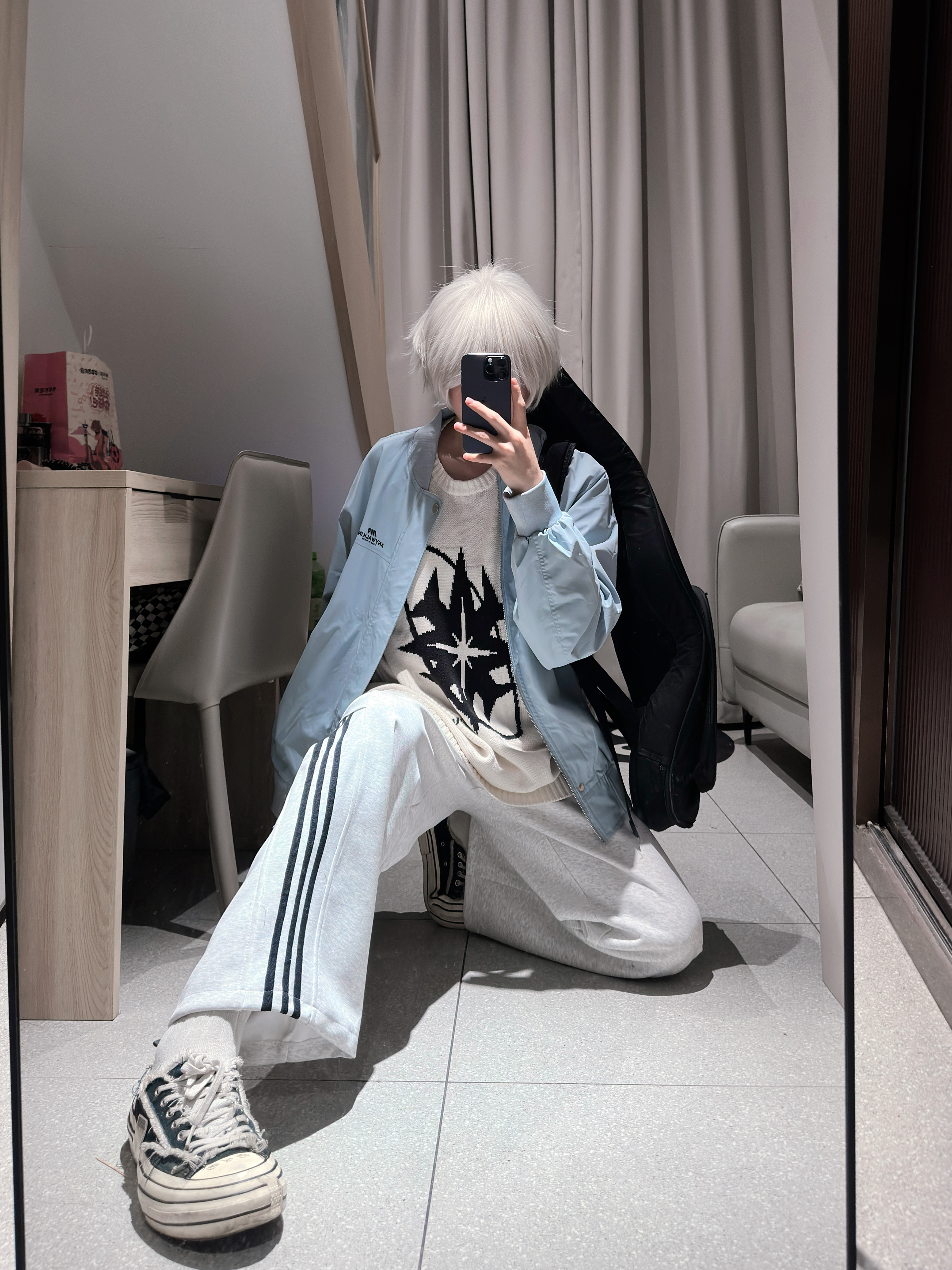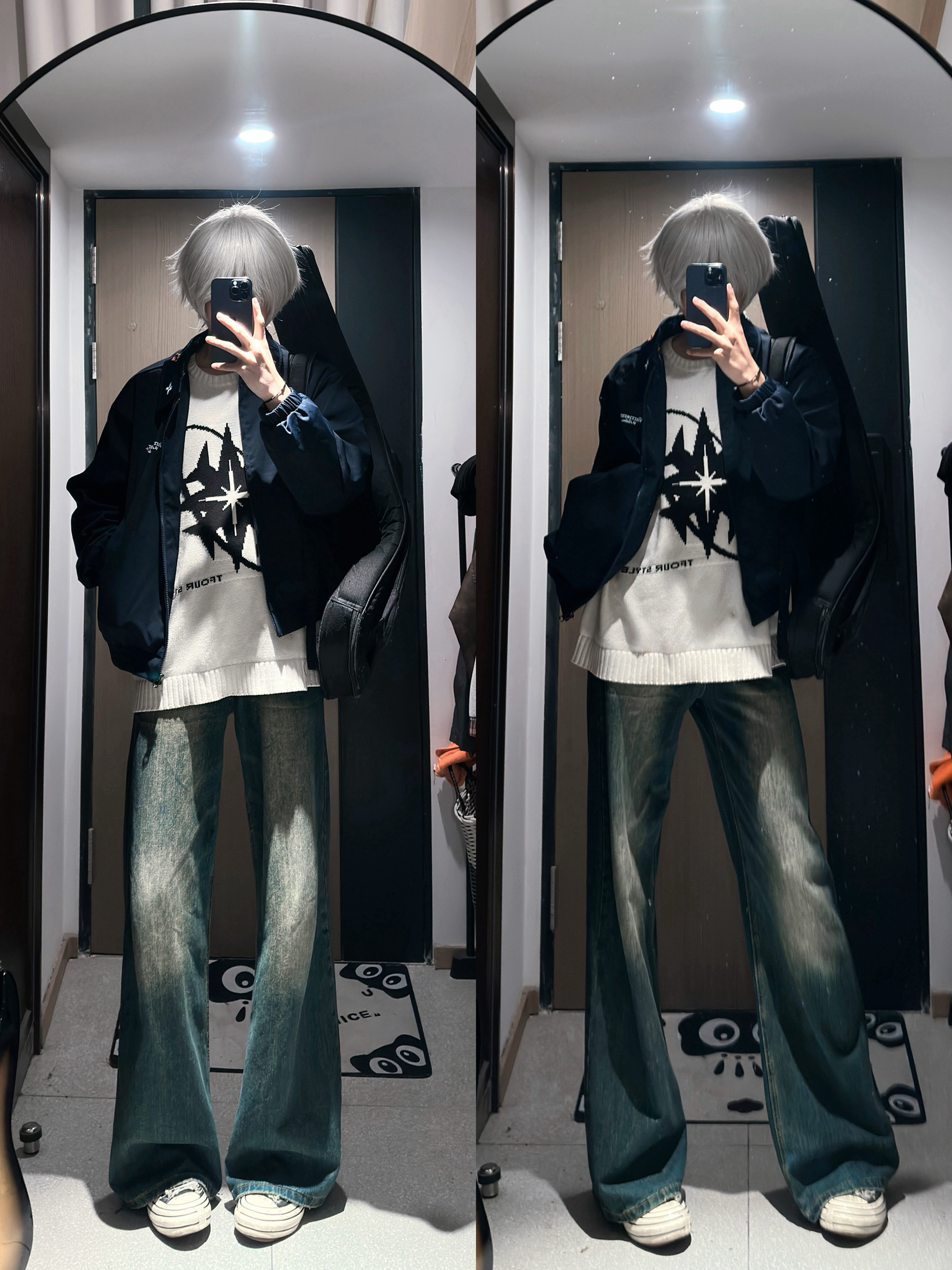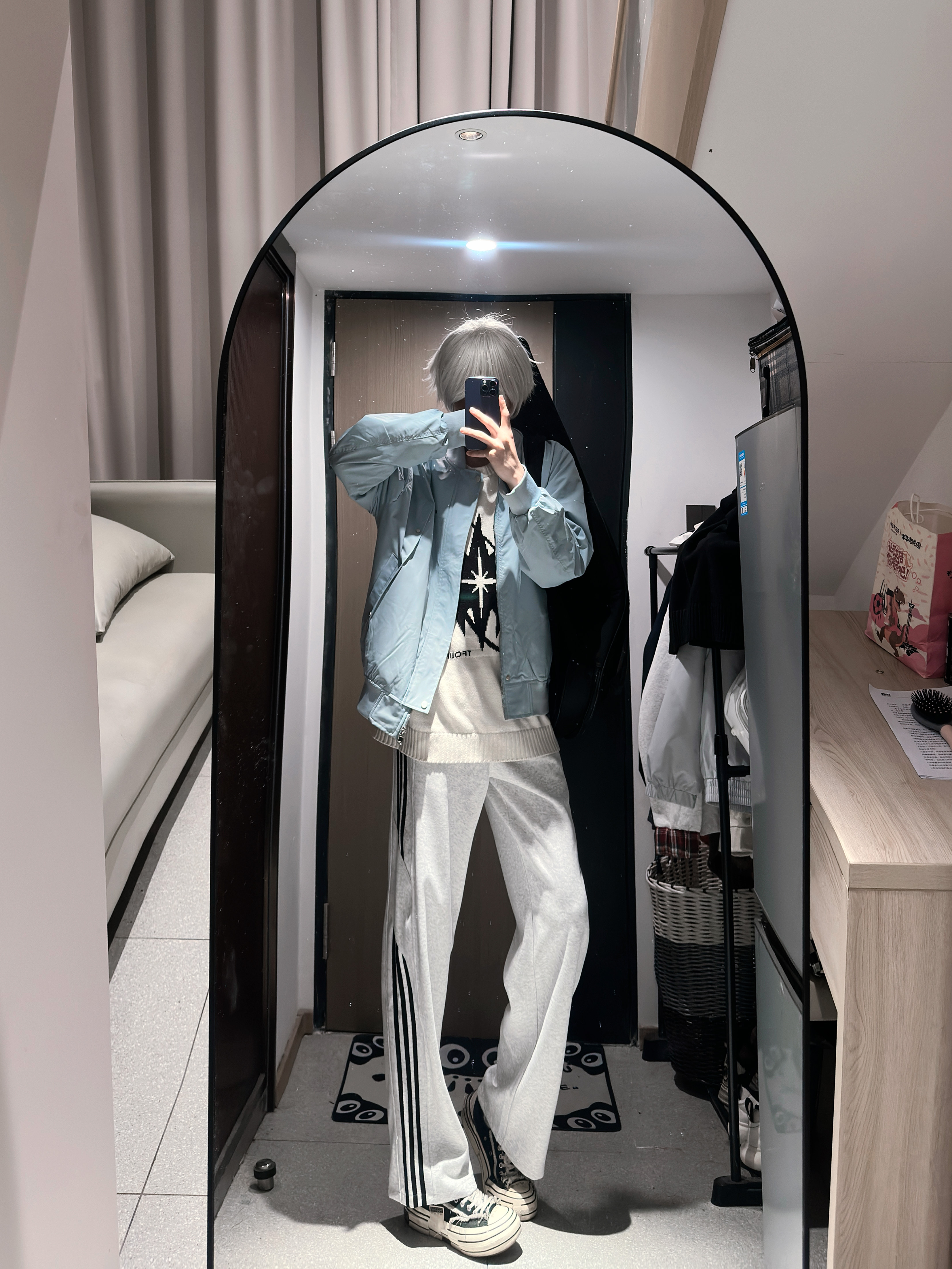 美式复古夹克外套好爱 面料上身质感十足 蓝色显白又耐看 内里叠穿一件白色毛衣就可以 下身再搭配一条条纹休闲裤 轻松拿捏少年感