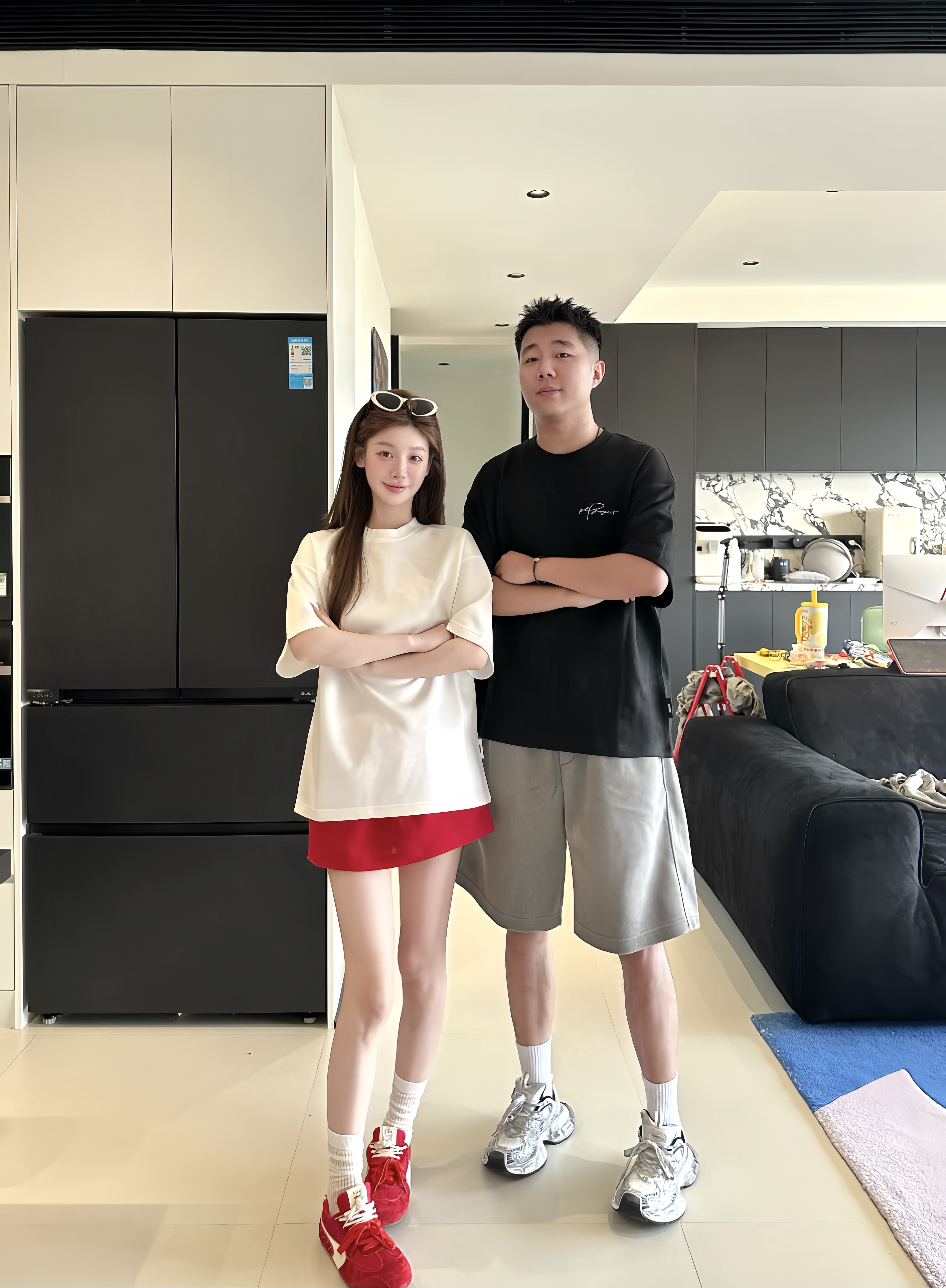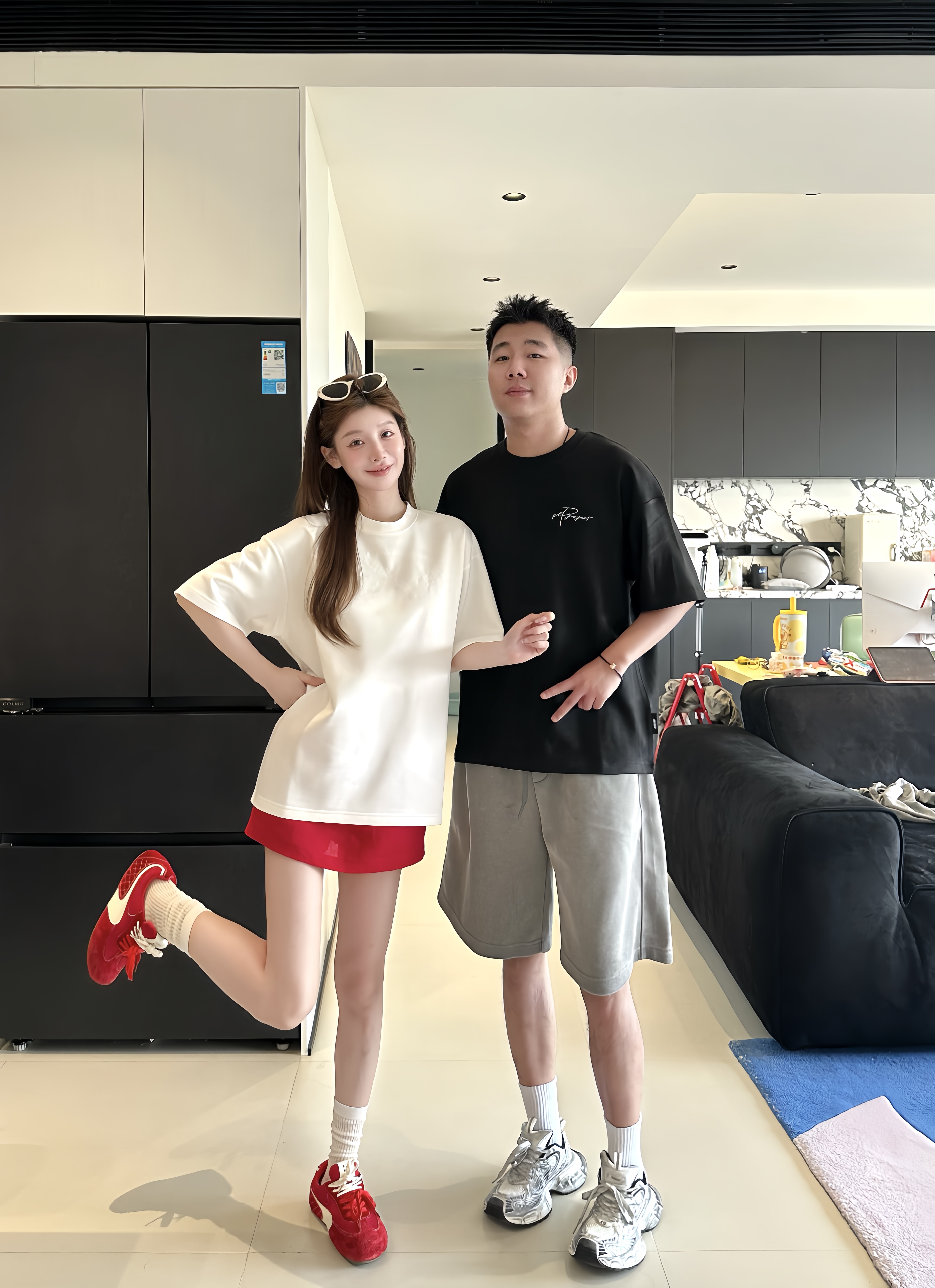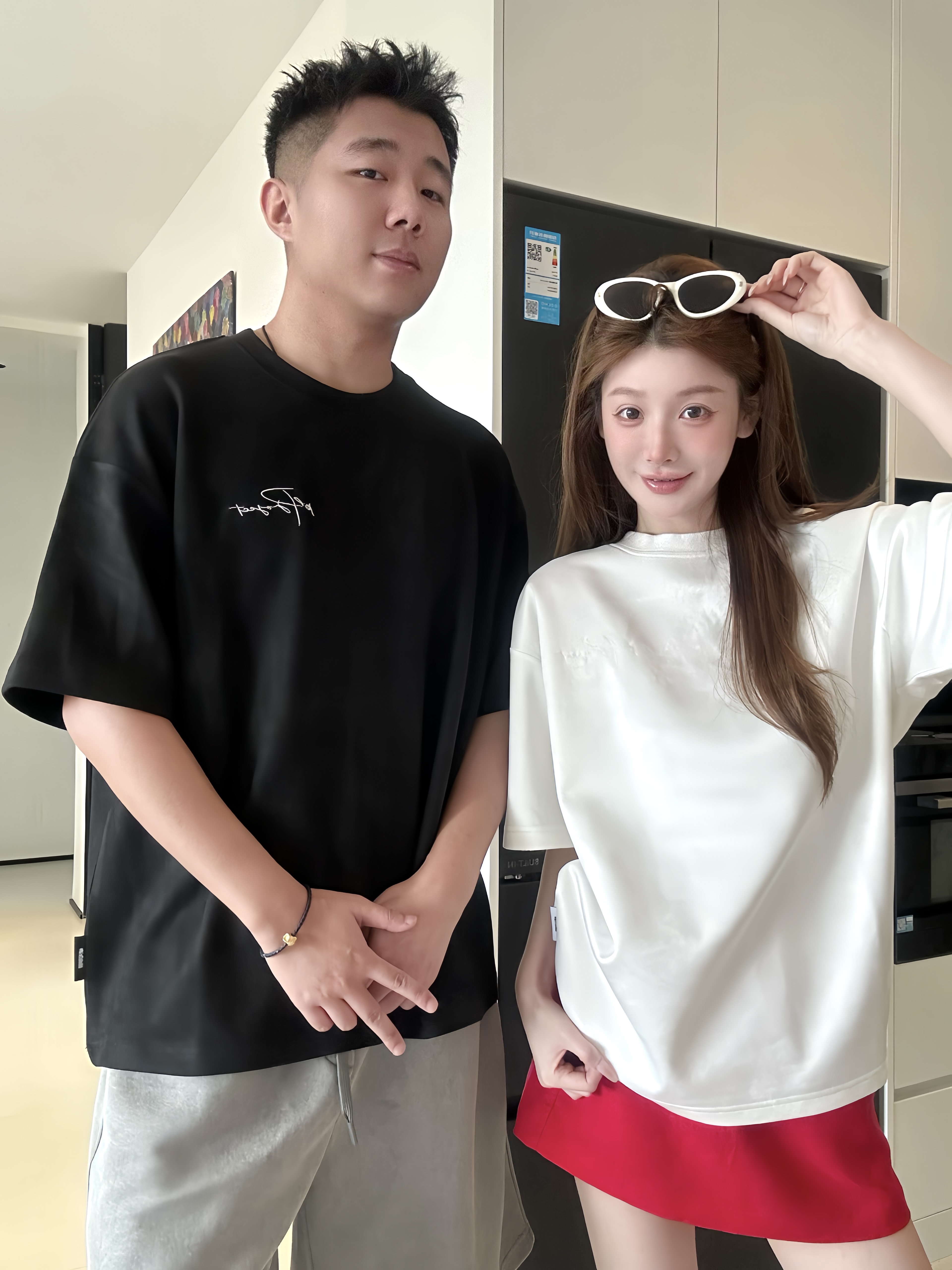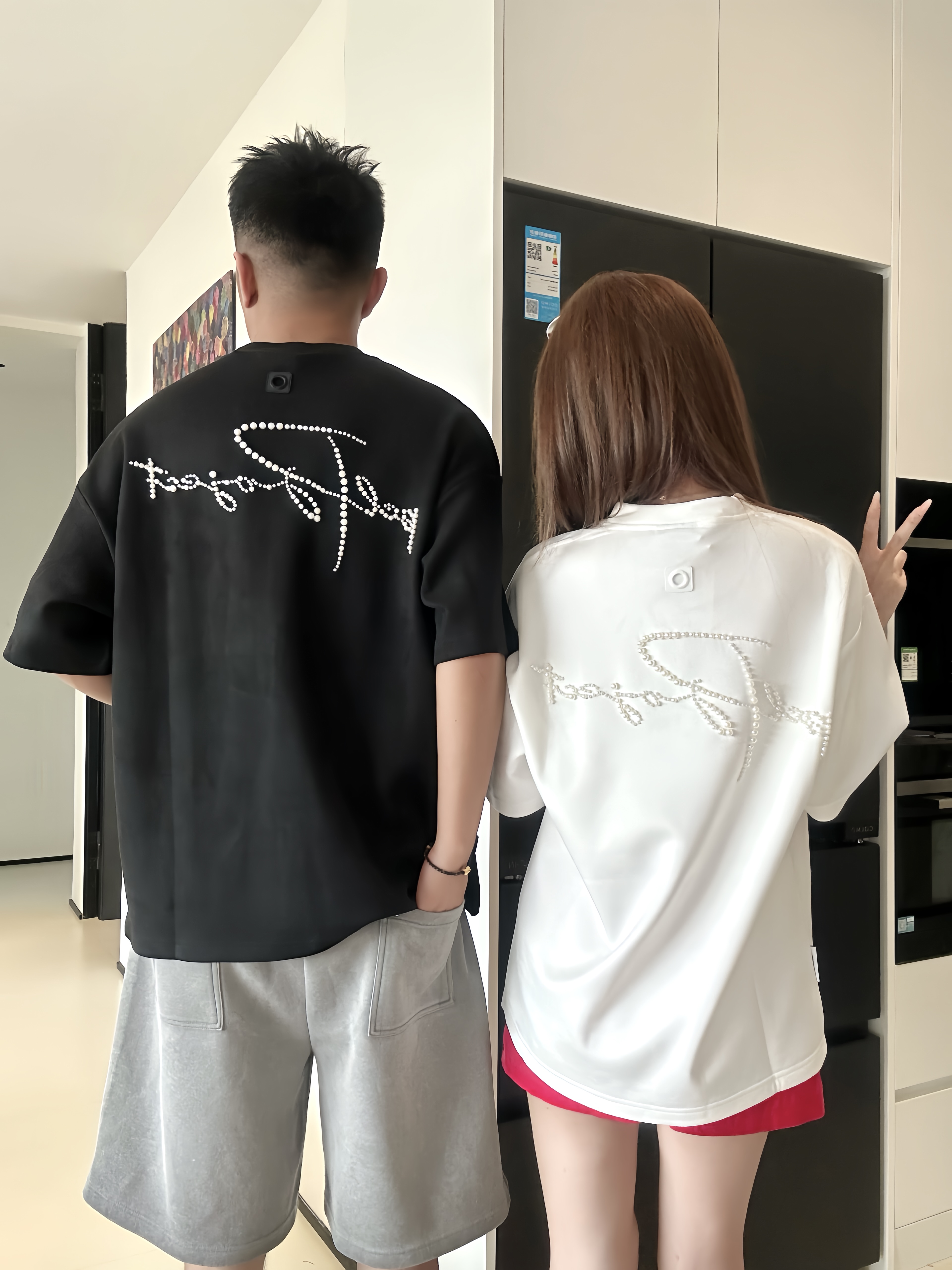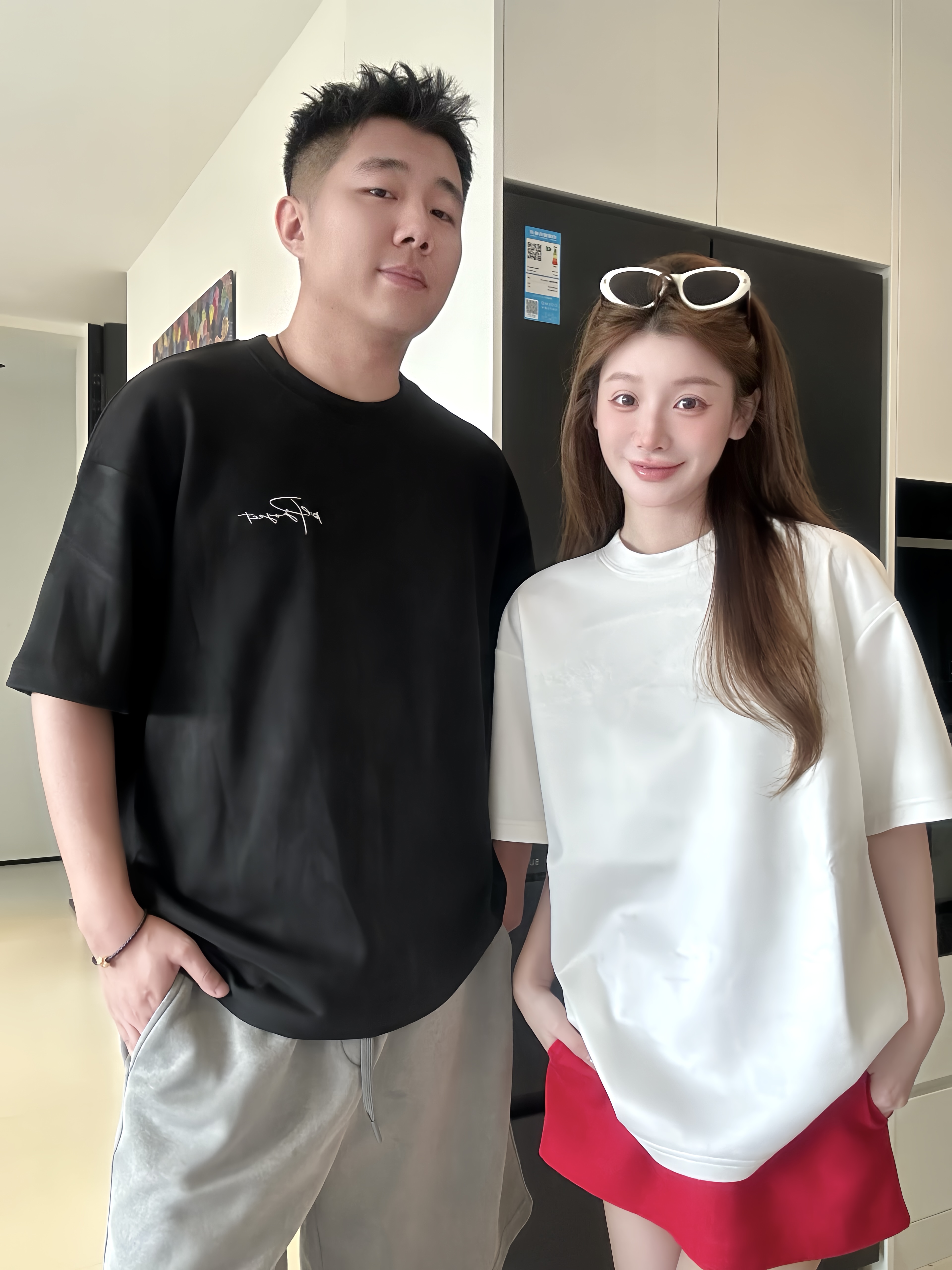 真的!这件珍珠t恤超有设计感 面料软fufu的 贴身穿超级舒服 版型是那种很宽松的 上身很有慵懒松弛的感觉 情侣日常逛街约会默契感满满💯