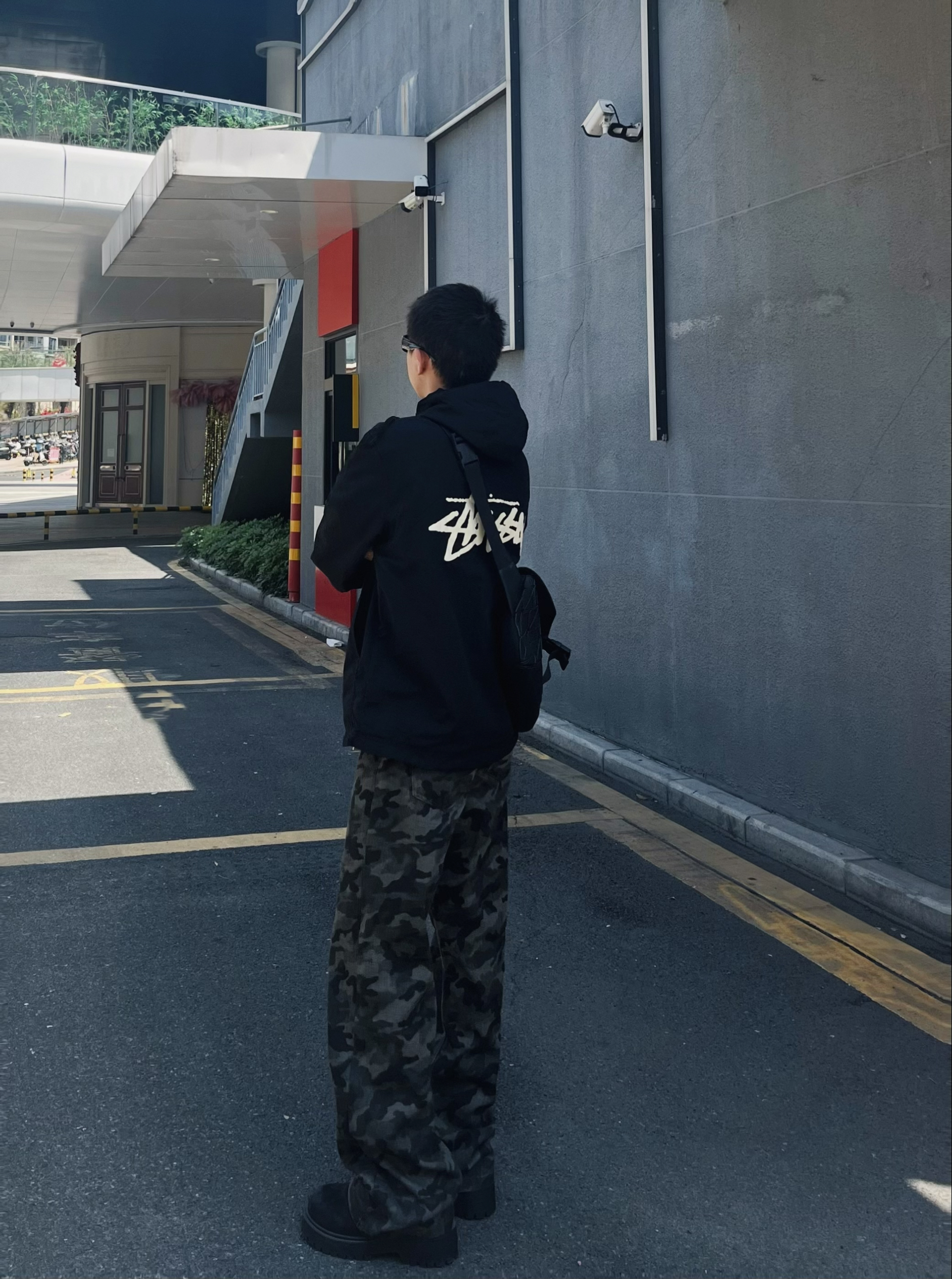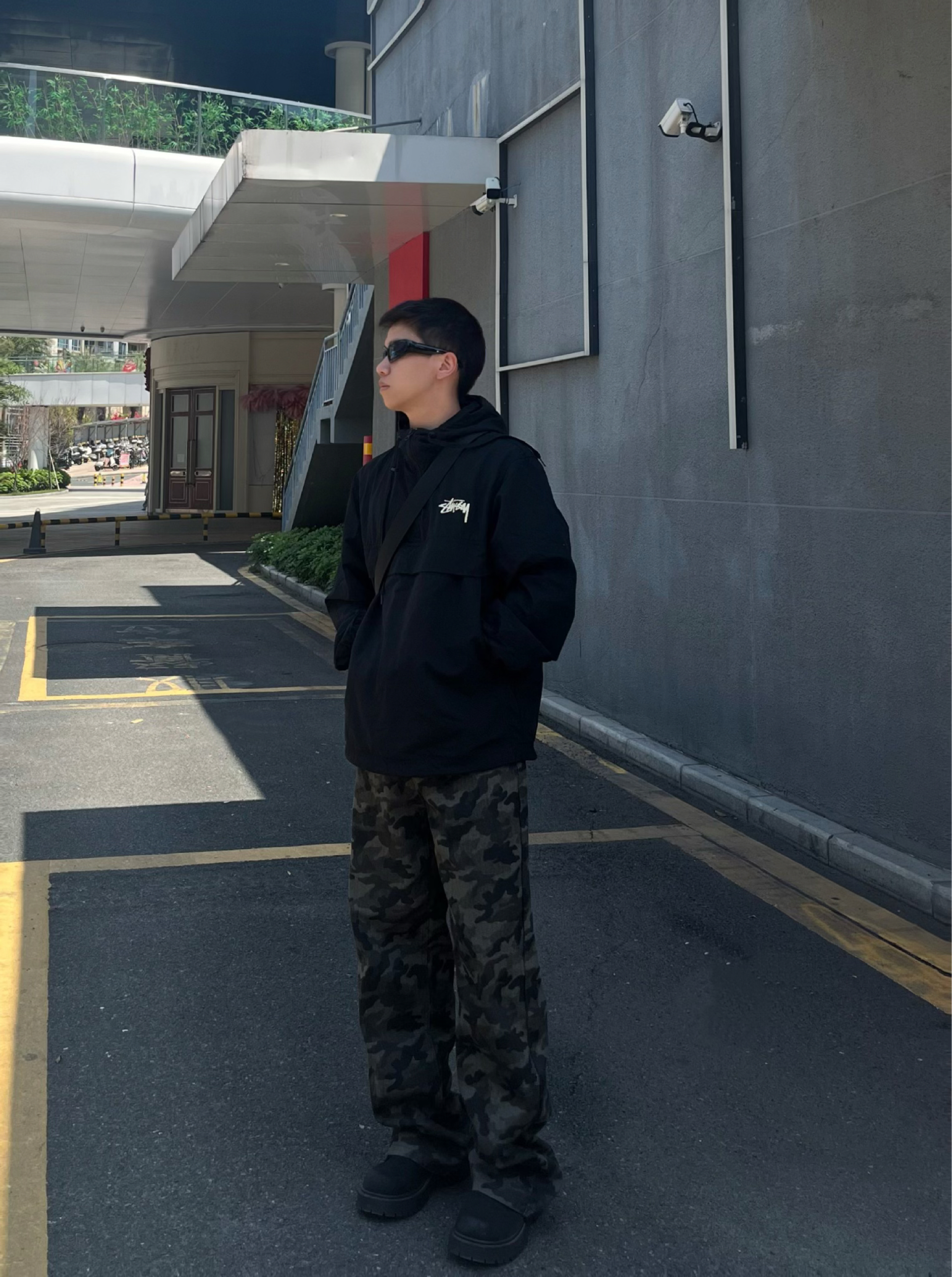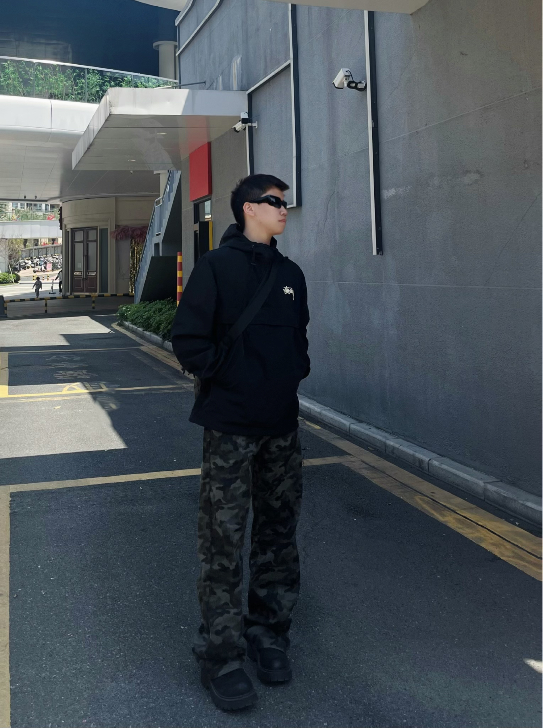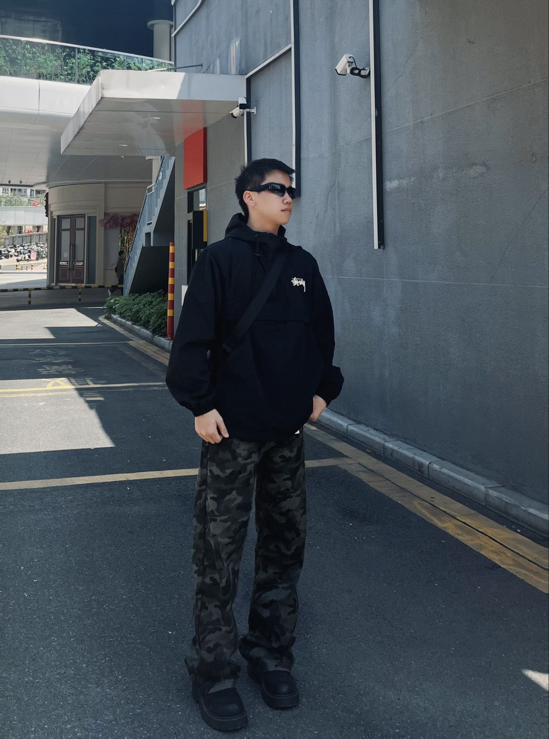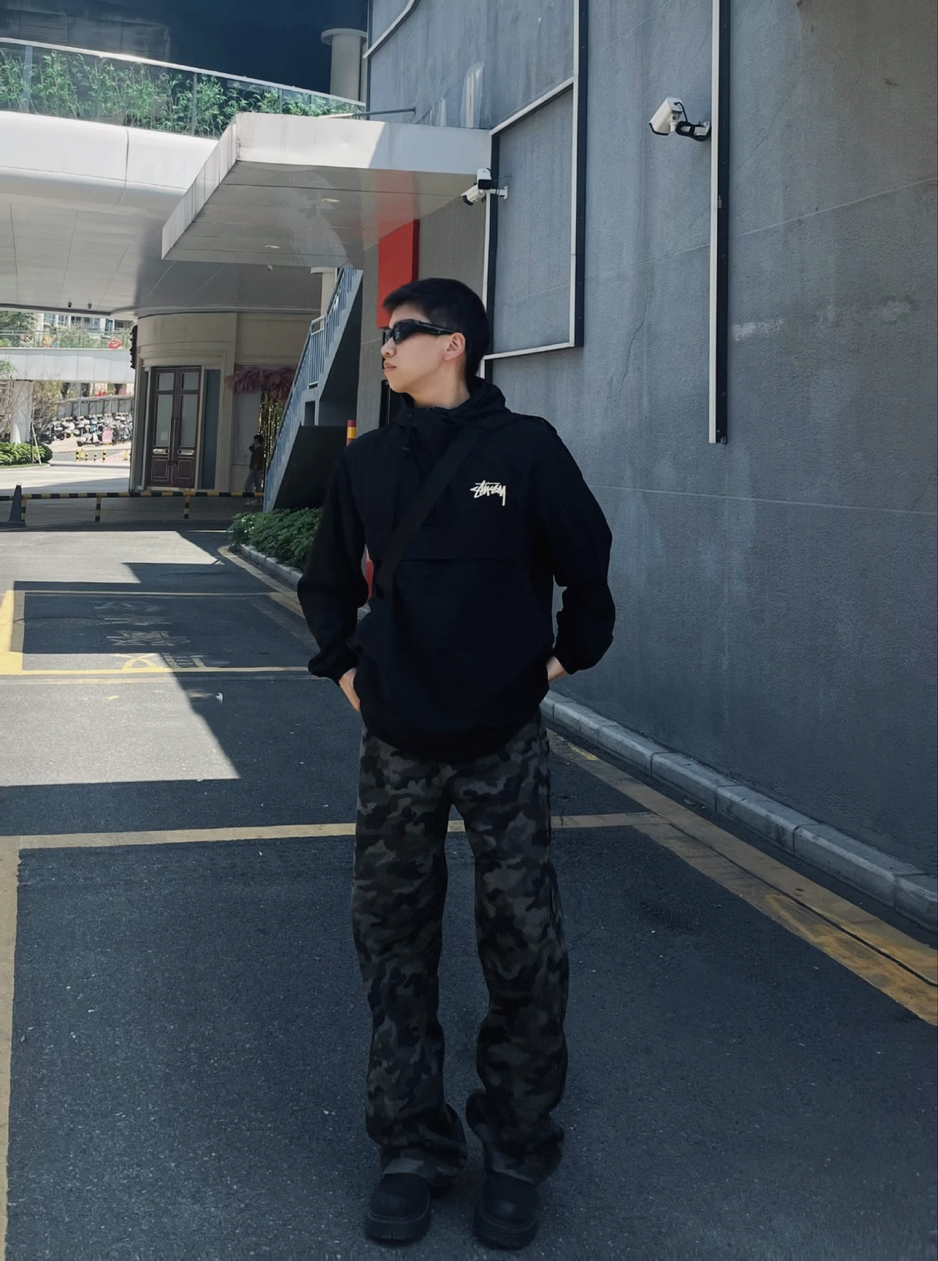 今日份运动户外穿搭分享来啦! 整体走的是黑酷街头+户外机能路线,兼顾实用性和氛围感。 • 上衣:Stussy黑色连帽冲锋衣,半拉链设计+经典logo,防风又有美式街头那味儿,日常出街或轻度户外都合适。 • 下装:迷彩阔腿工装裤,垂感和版型都很赞,迷彩元素自带户外感,宽松版型还能藏住腿型缺点。 • 鞋子:黑色厚底德比鞋,增高同时增加硬朗感,和整套风格完美适配。 • 配饰:黑色斜挎包,实用又能...