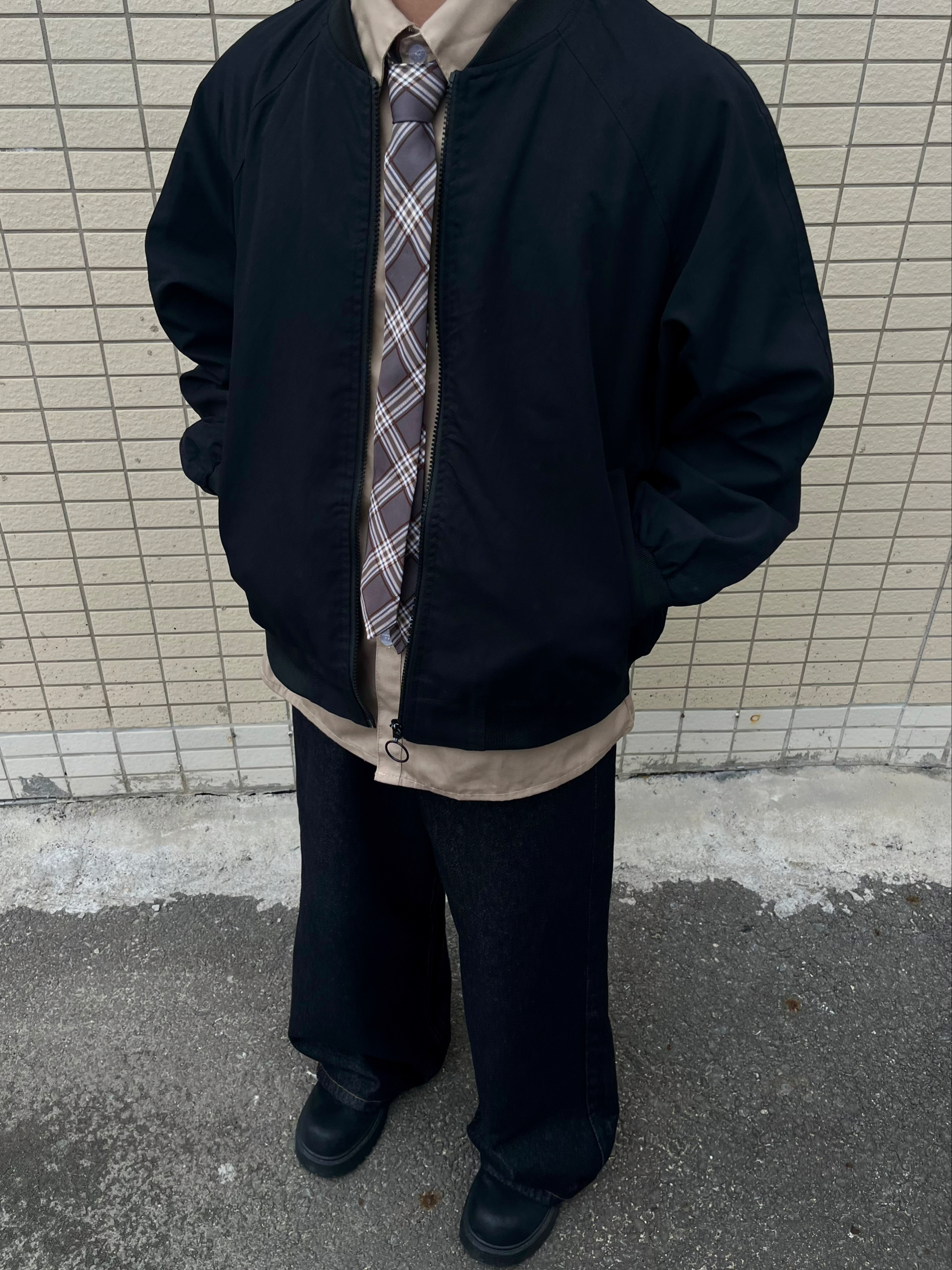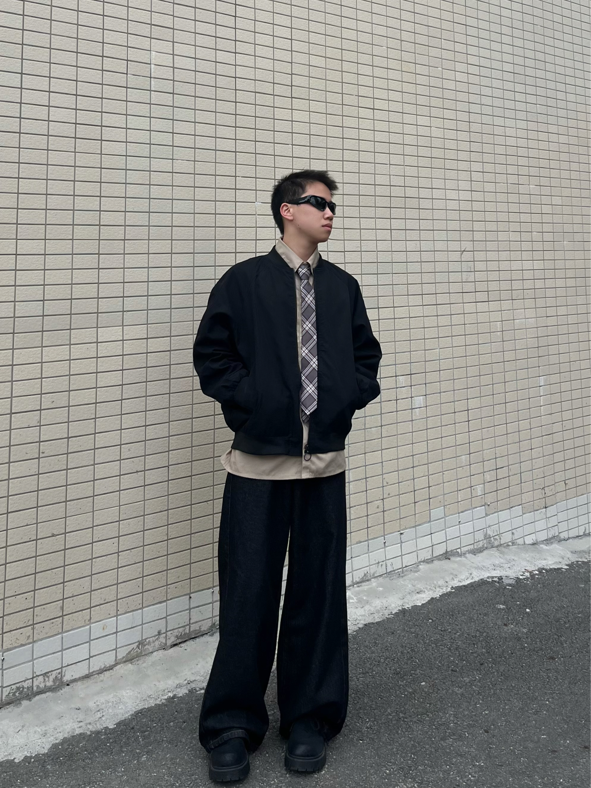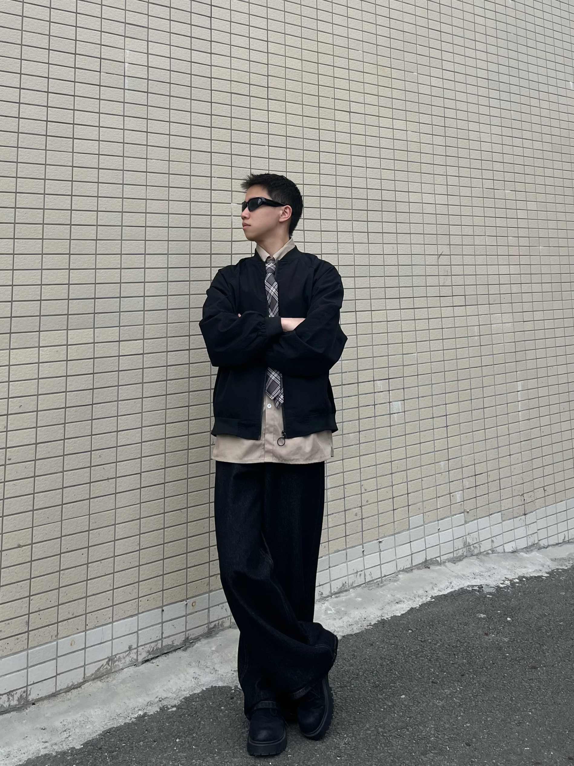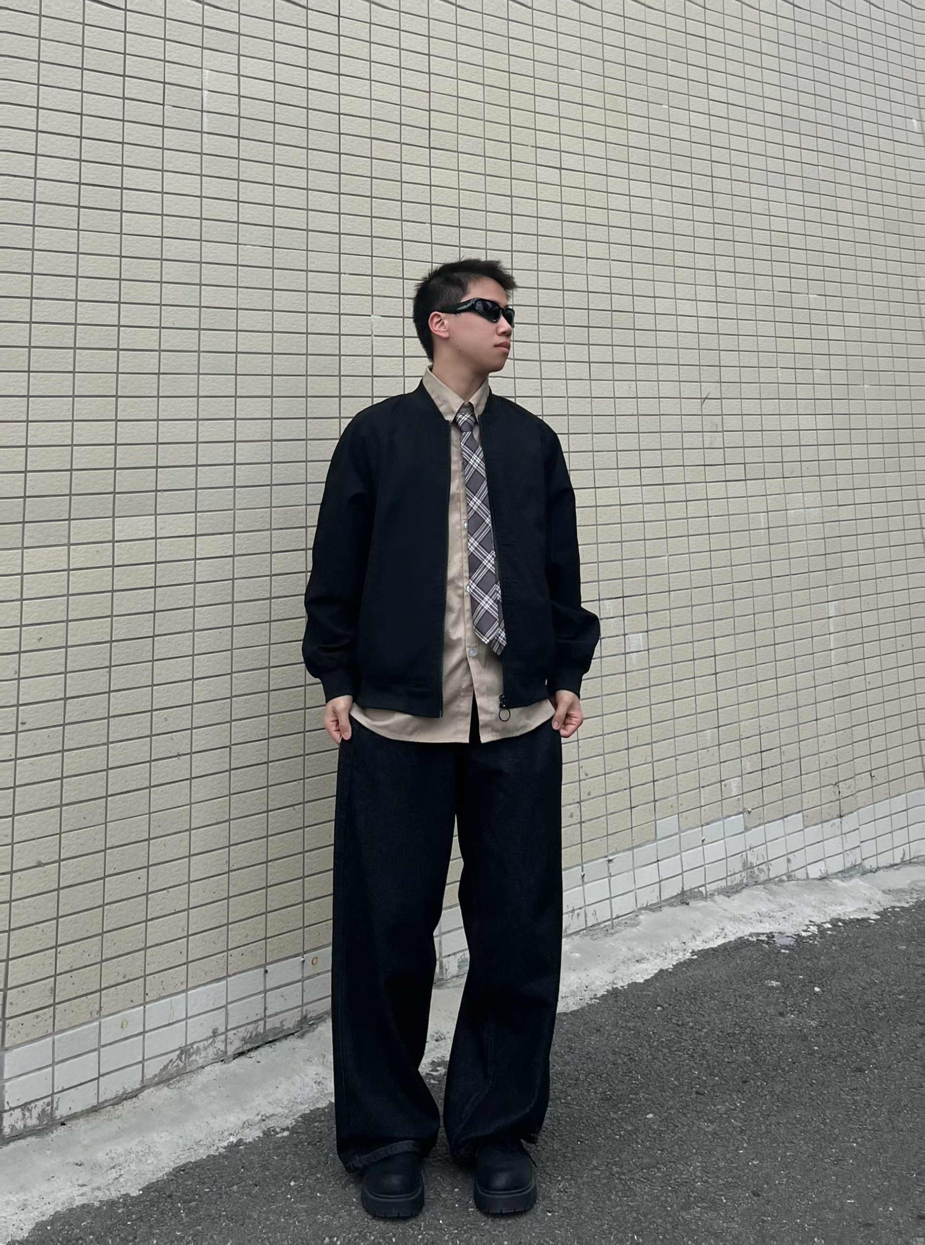 今日份美式复古运动风穿搭分享来啦!主打学院感+户外松弛感,兼顾日常出街和轻户外场景。 • 外套:黑色棒球服夹克,经典立领+宽松版型,美式街头感拉满,防风又利落,户外出行也实用。 • 内搭:卡其色衬衫+格纹领带,叠穿增加层次感,瞬间注入学院复古氛围,打破运动装的单调。 • 下装:黑灰色阔腿牛仔裤,垂感优秀,宽松版型适配各种身形,耐磨面料也适合户外行走。 • 鞋子:黑色厚底德比鞋,增高同时强化...
