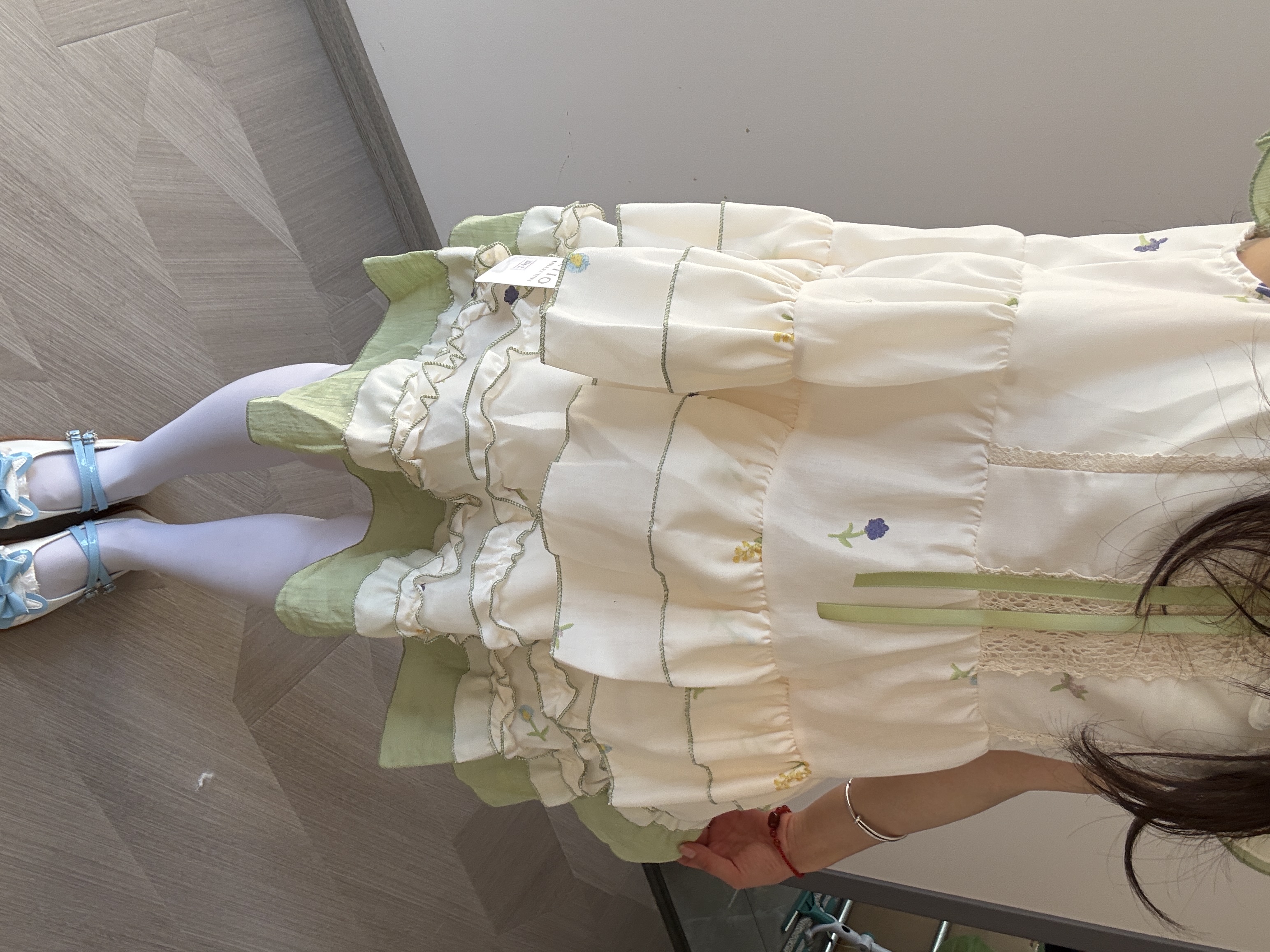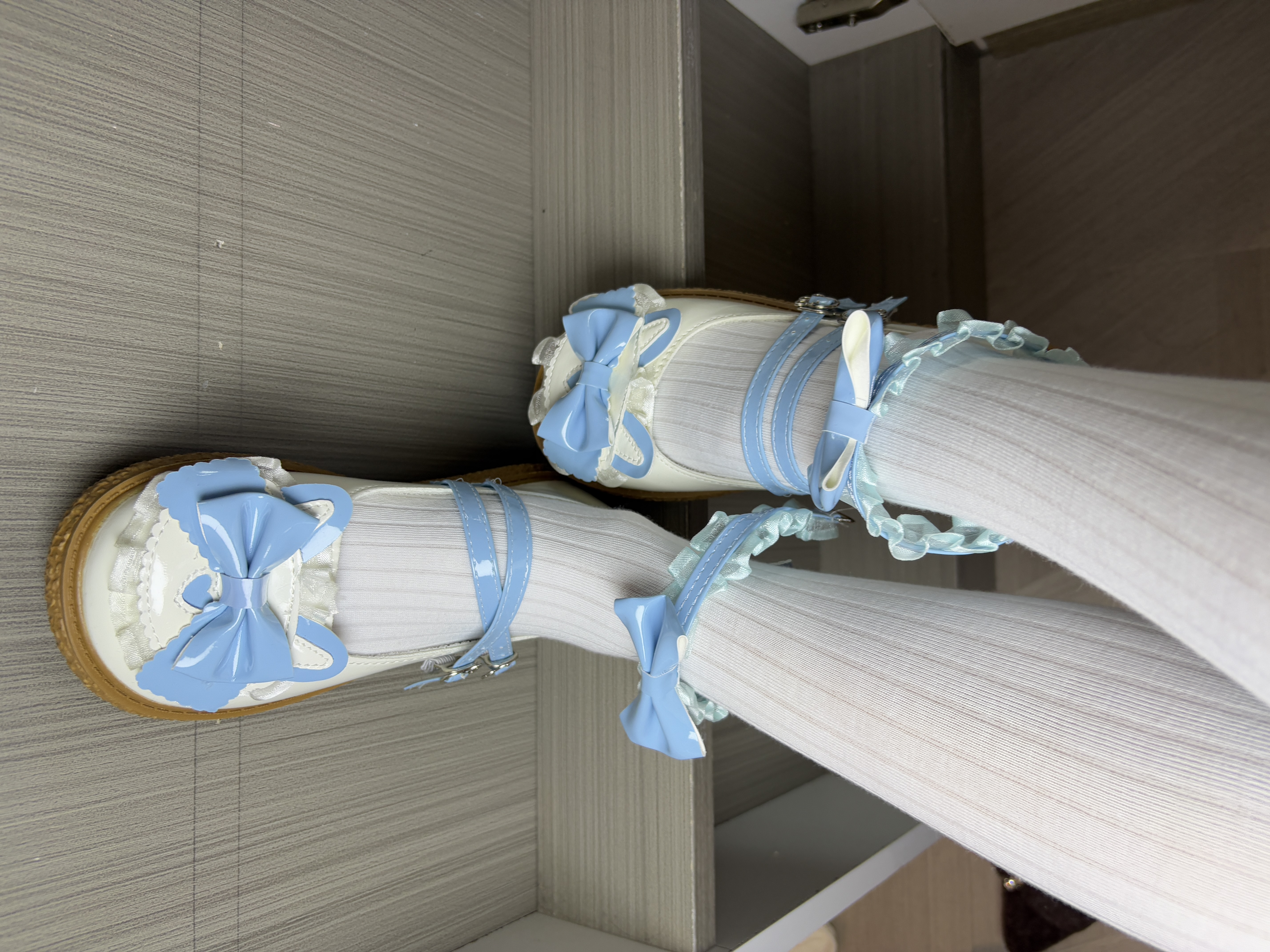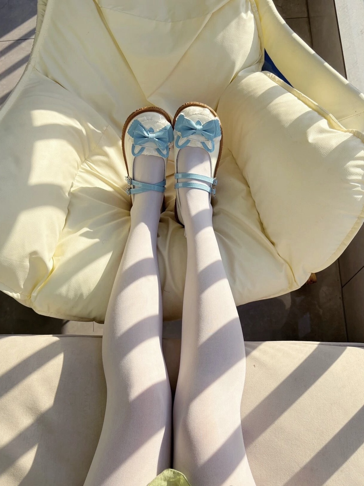 风格:典型的日系甜系Lolita鞋款,也适合搭配JK制服。 • 设计: ◦ 鞋头圆润宽大,是标志性的“大头鞋”造型,显得可爱减龄。 ◦ 鞋身以奶白色为基底,搭配清新的天蓝色蝴蝶结和双袢带,还有精致的蕾丝花边点缀,充满少女感。 ◦ 鞋底是浅棕色牛筋底,柔软耐磨,同时有一定厚度,能悄悄增高。 • 搭配:图中搭配了白色连裤袜,这种组合是Lolita和软妹穿搭的经典公式,干净又温柔,在阳光下显得...
