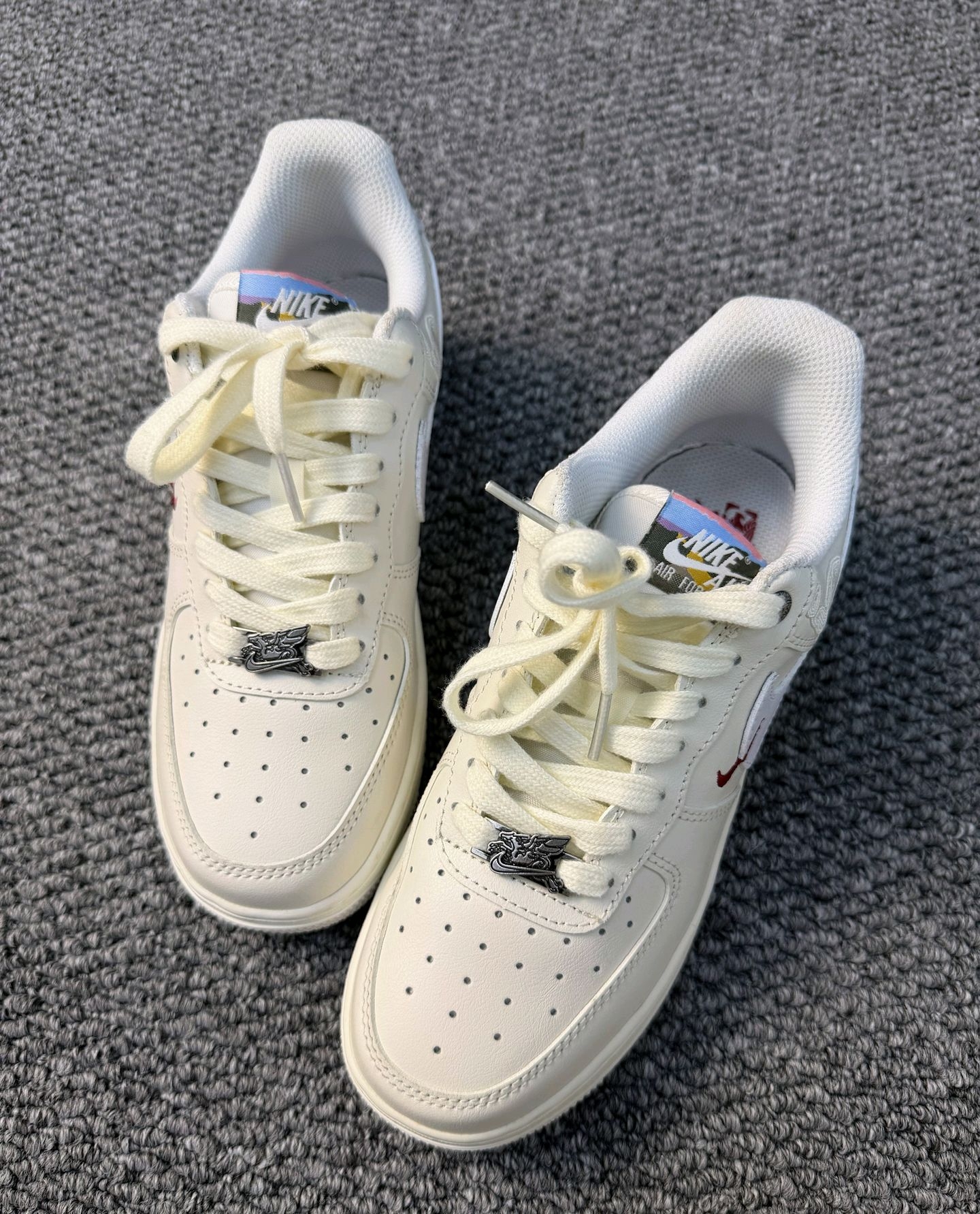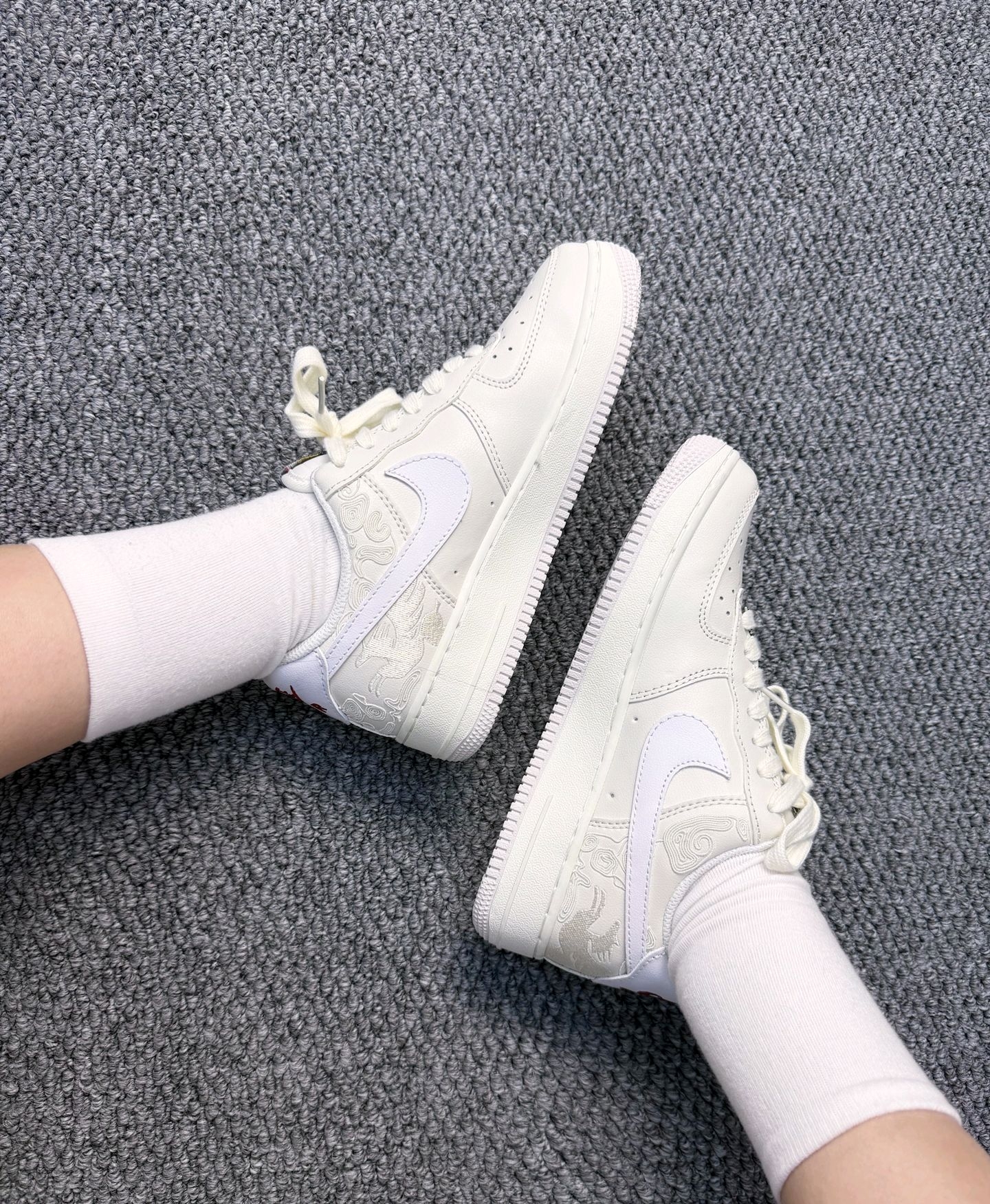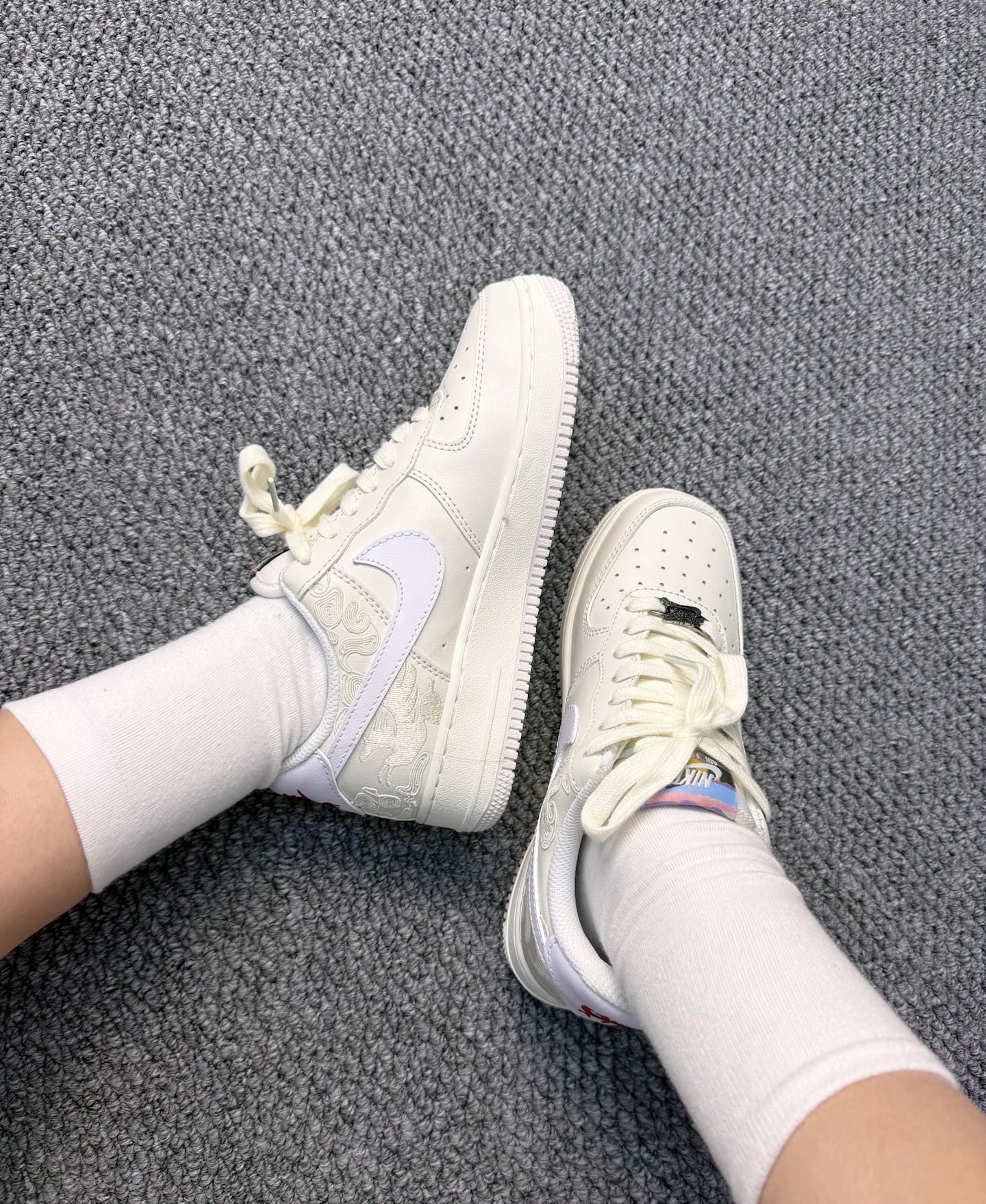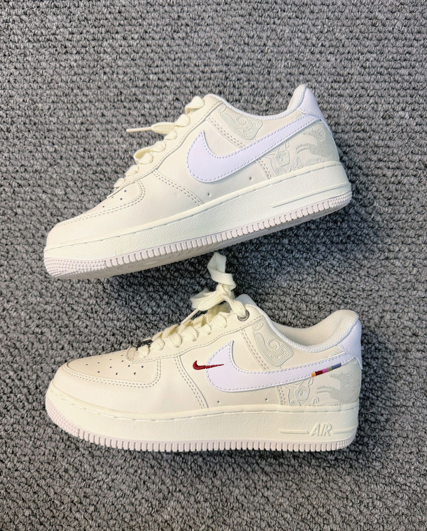 鞋侧面的祥云和奔马暗文泰精致了,低调拥有国风感,细节控狂喜🎉鞋舌的渐变标签🏷️,金属飞马鞋扣、还有后跟那一小段彩色缝线,处处都是小心机😏耐克NF1马🐎年限定也🤩泰会了吧