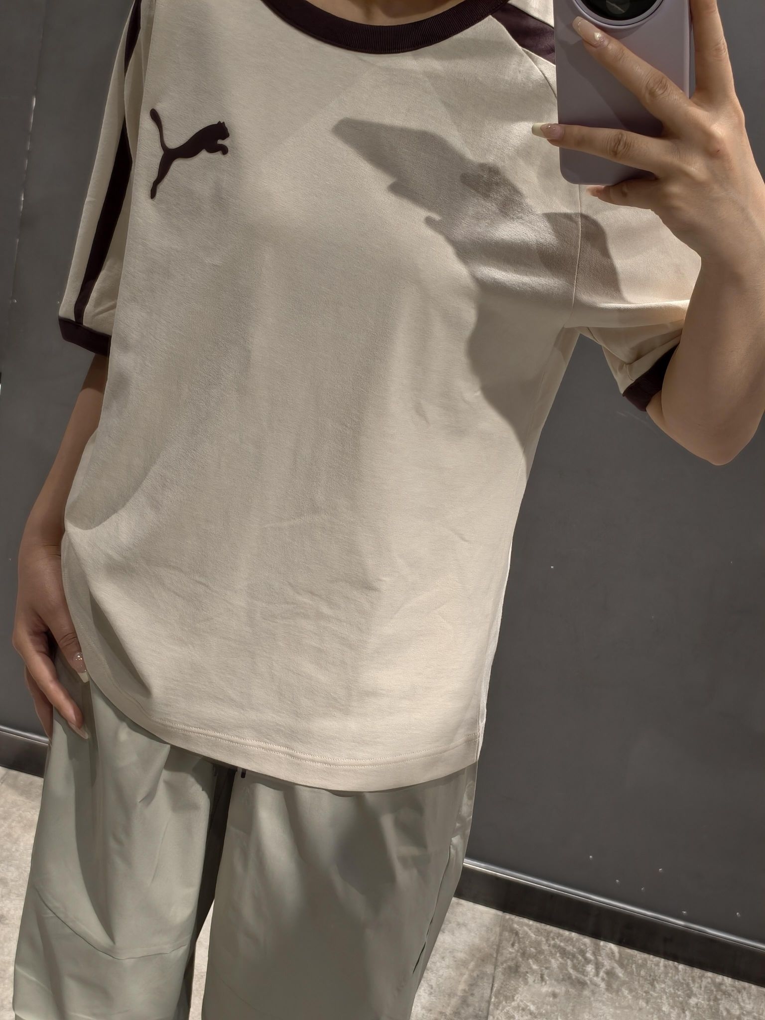 🌟PUMA T7经典短袖T恤,米白+深棕撞色,复古运动风满满!纯棉材质柔软透气,夏天穿超舒服~胸前小豹子Logo低调又有辨识度🐆,侧边条纹设计超有细节感。宽松版型,男女同款,单穿叠穿都OK,牛仔裤、运动裤随意搭配,轻松get休闲运动风✨。张凌赫同款,明星效应加持,时尚实用,夏日衣橱必备!