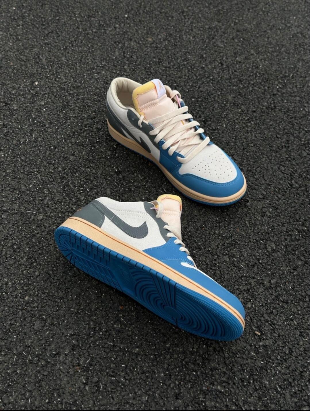 好打理!干净清爽!复古味拉满! 兄弟们,这双AJ1 Low “Tokyo Vintage”蓝灰配色,真的忍不住疯狂分享! 今天本来只是出门取个快递,随手一穿就被惊艳到。上脚瞬间沦陷——奶白绒面革摸起来软乎乎的,侧面蜥蜴纹Swoosh+金色刺绣细节越看越有质感,蓝灰拼接把复古氛围直接拉满。 重点是巨好穿!鞋口内衬软糯贴脚,完全不磨不压,日常走路、偶尔投篮都舒服。 搭一件浅灰连帽卫衣+做旧直筒牛仔...