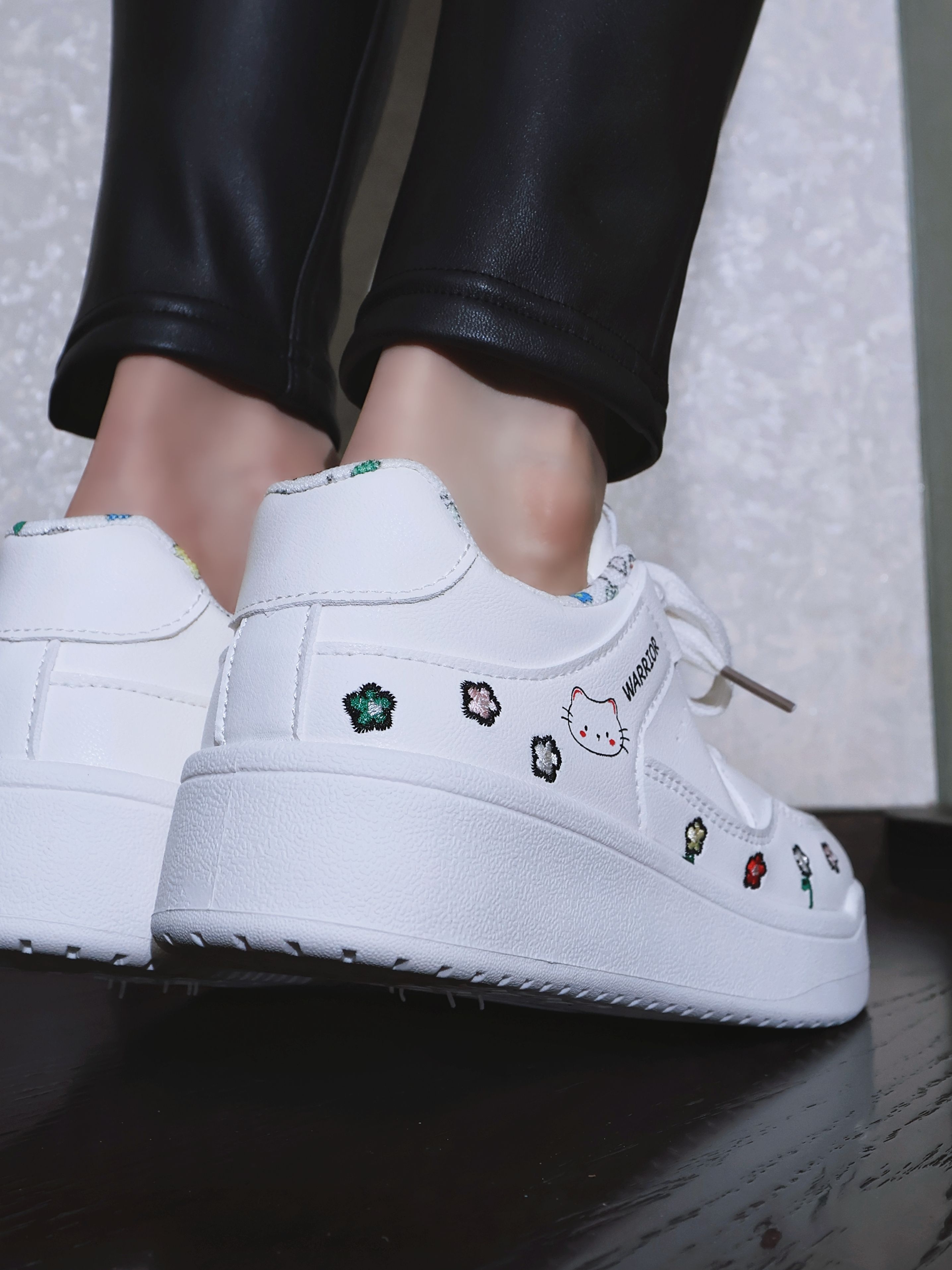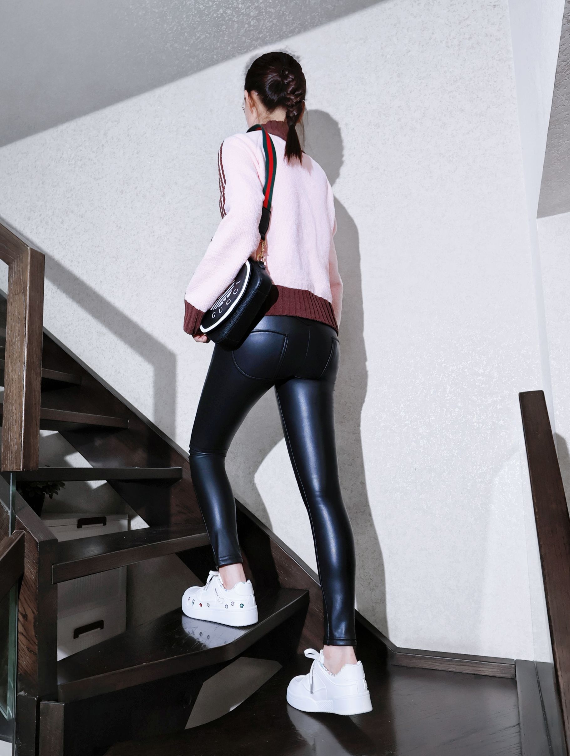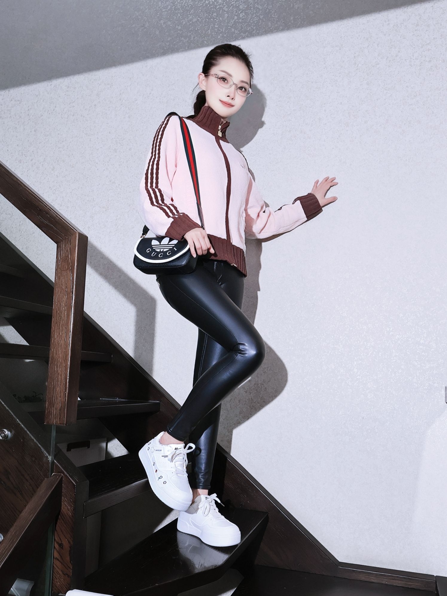 粉色运动外套混搭黑色皮裤,甜酷碰撞超吸睛!搭配的是回力厚底小白鞋,鞋身点缀喵星人与小花刺绣,清新又萌趣还有厚底显高哦!