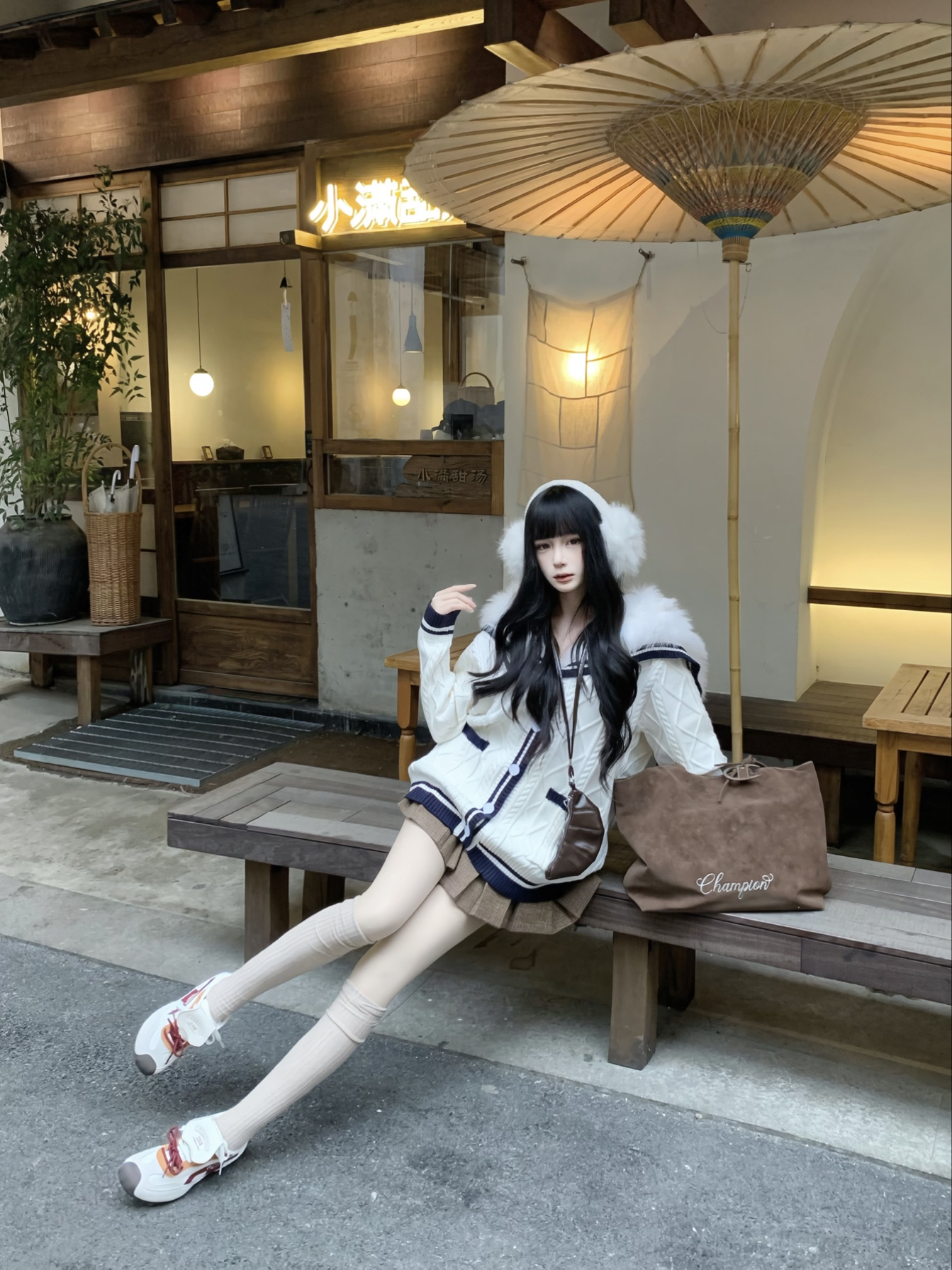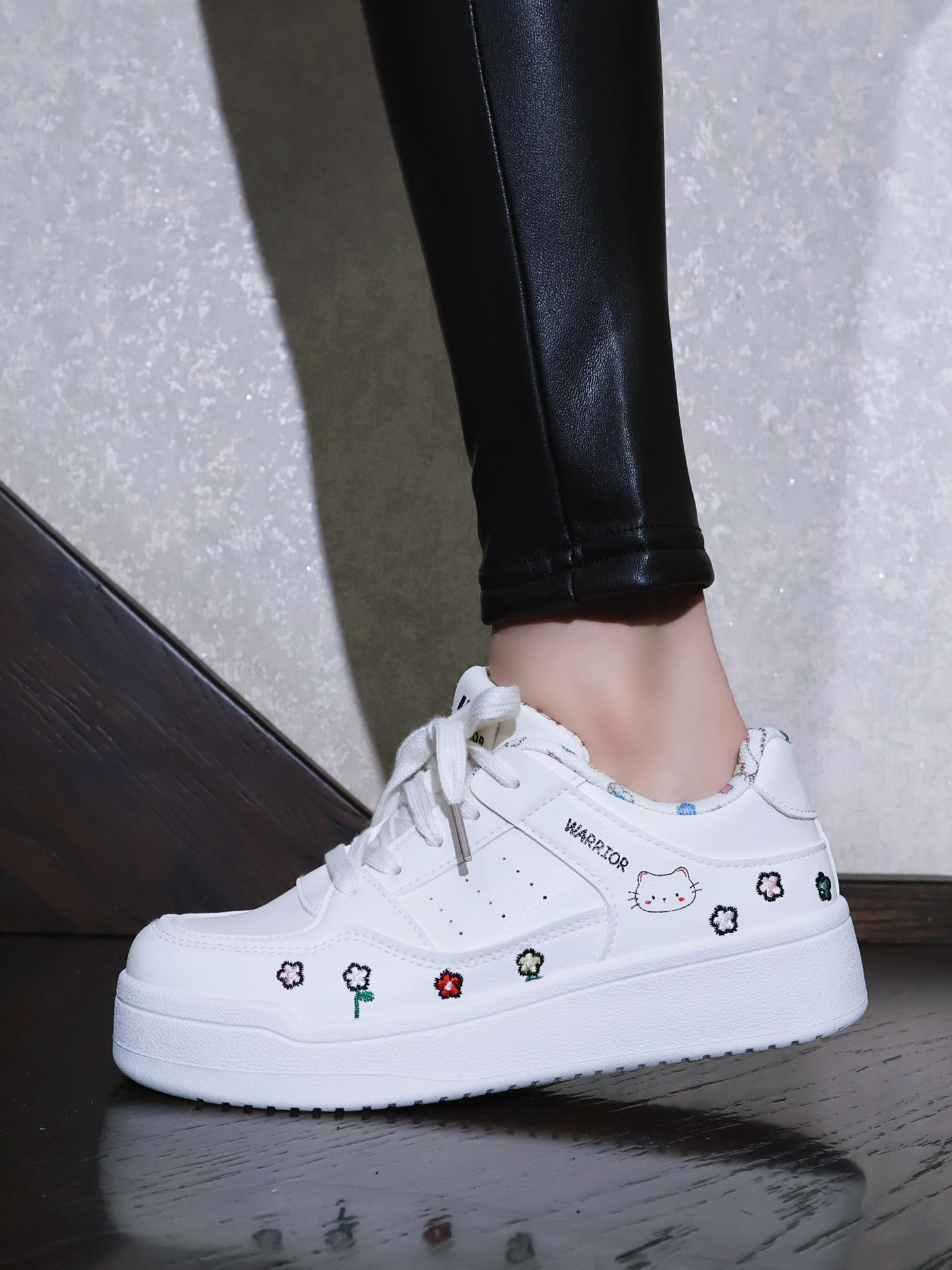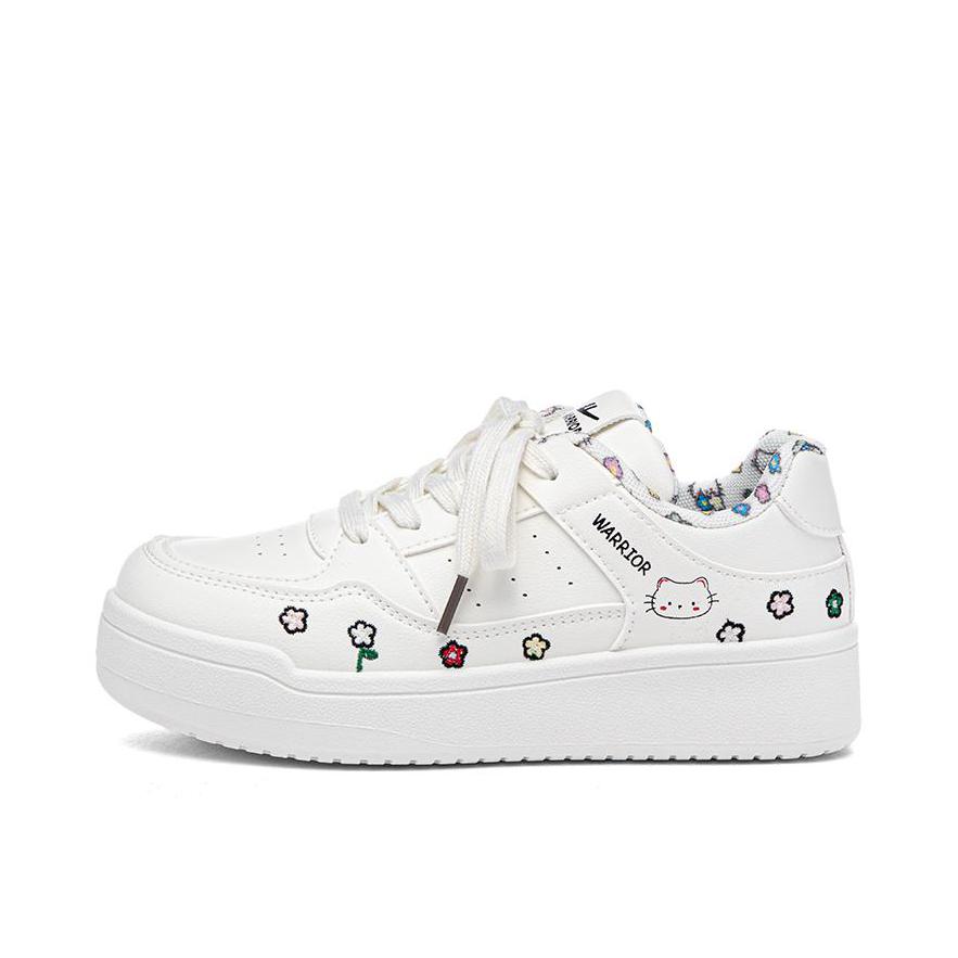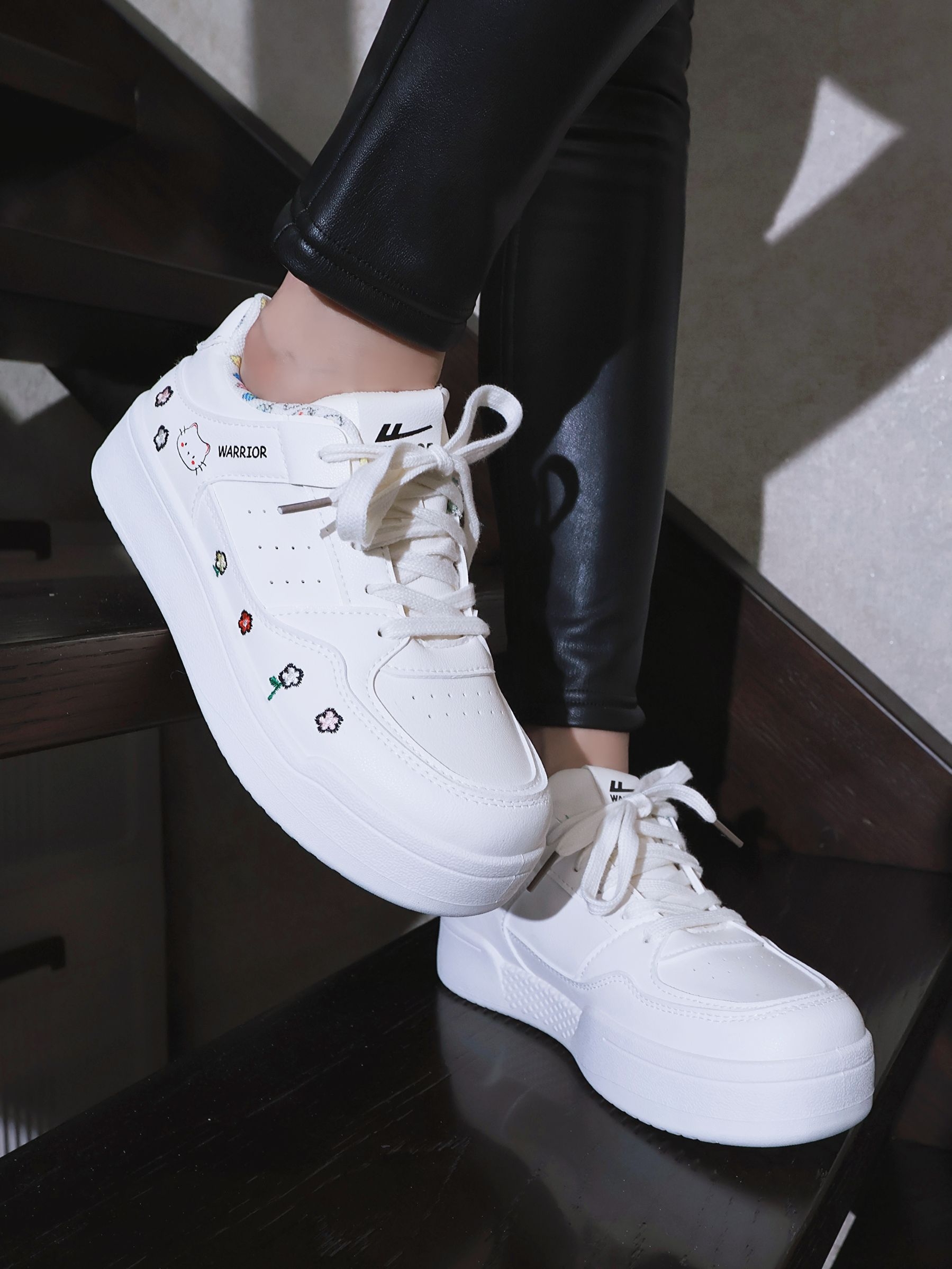 粉色运动外套混搭黑色皮裤,甜酷碰撞超吸睛!搭配的是回力厚底小白鞋,鞋身点缀喵星人与小花刺绣,清新又萌趣还有厚底显高哦!