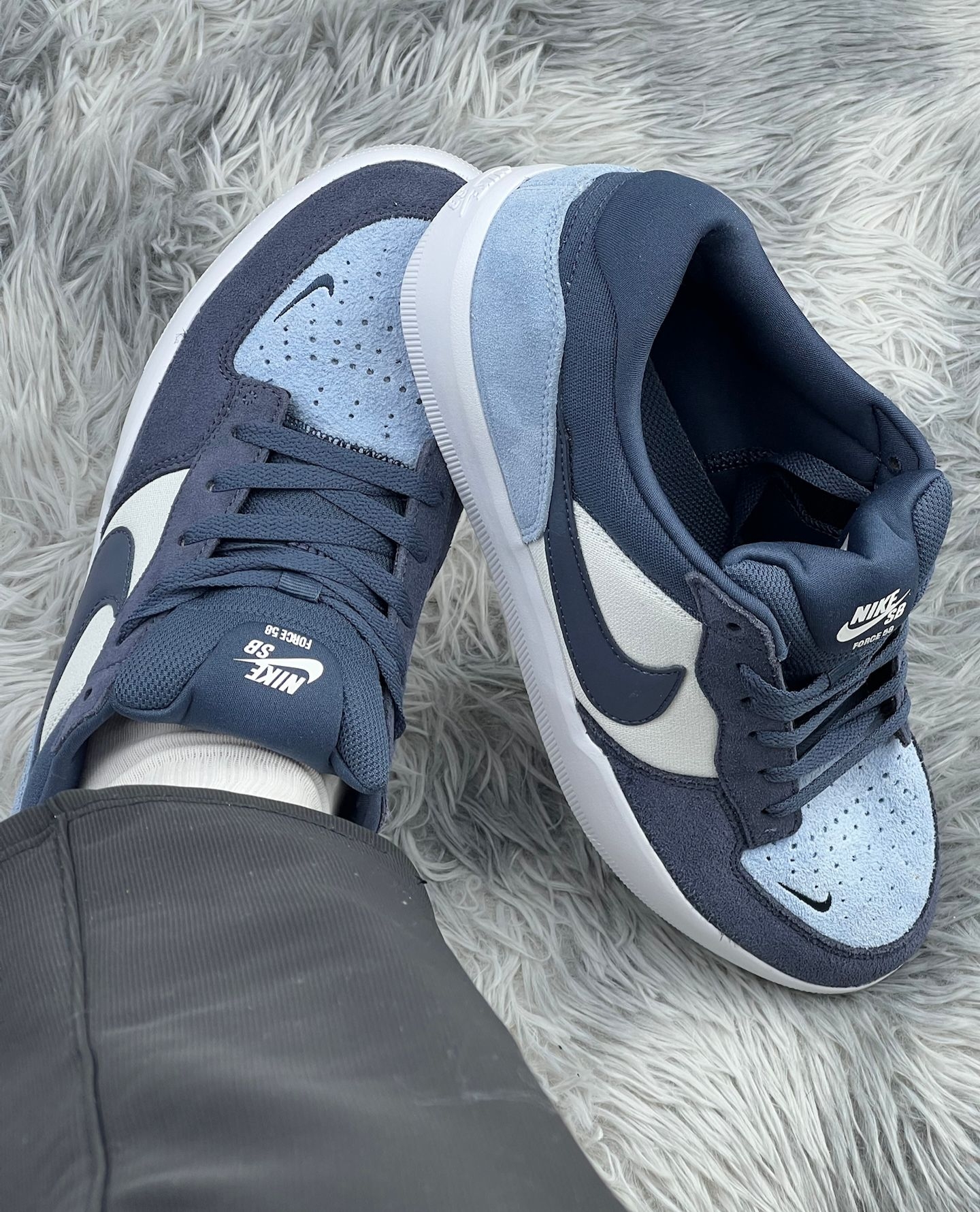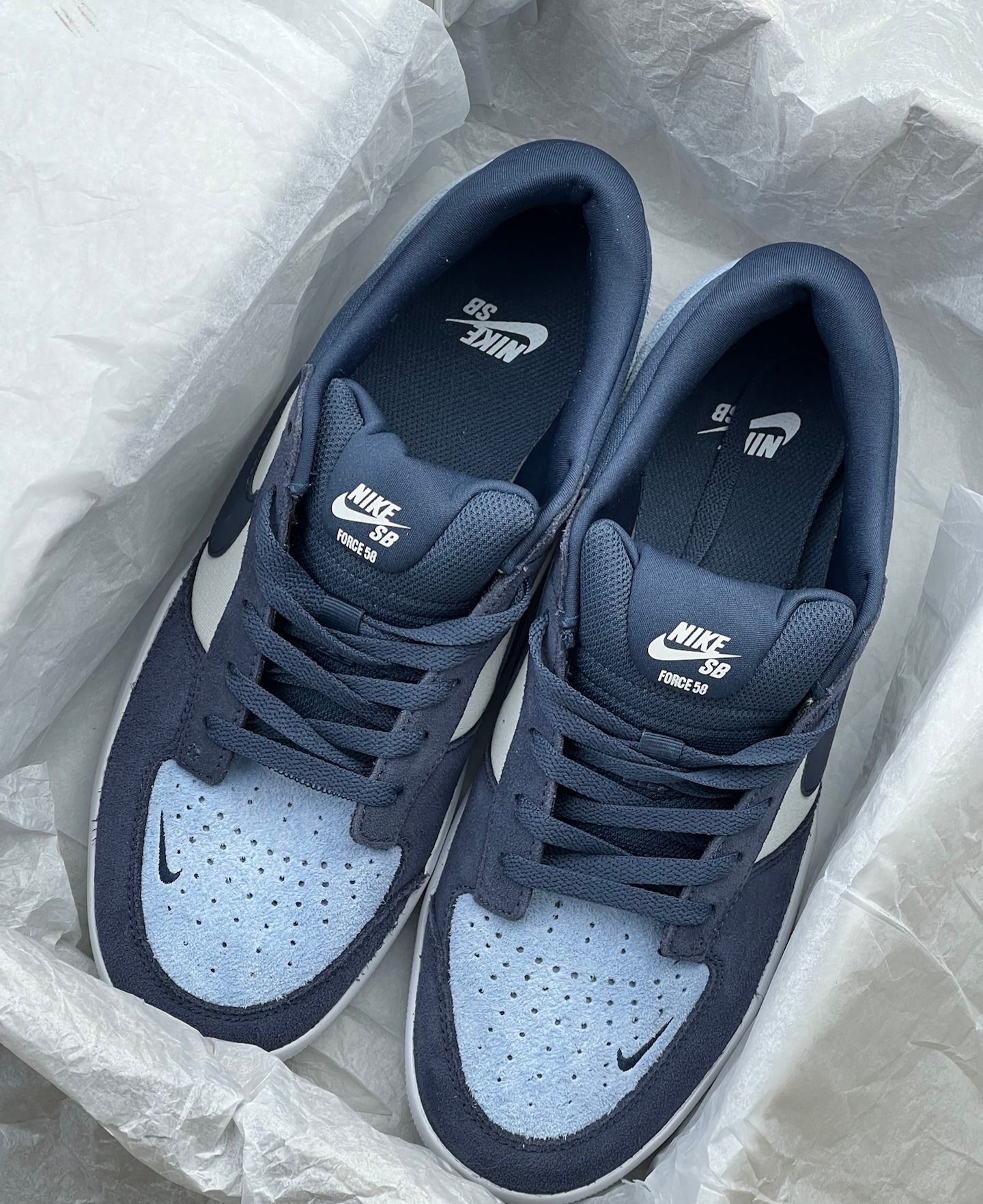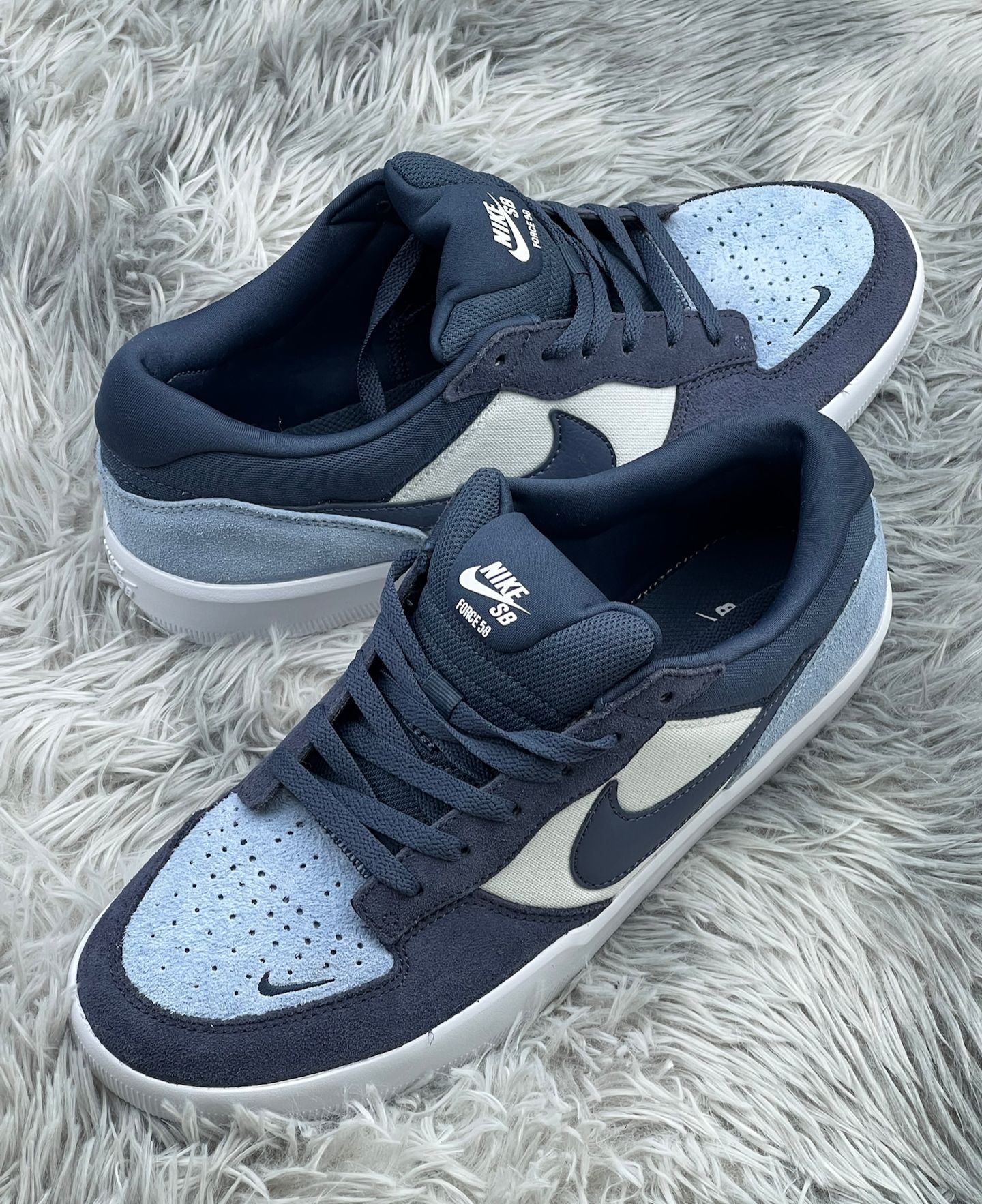 Nike SB Force 58这双藏蓝拼浅蓝真的戳中我了💙,麂皮加网布的组合看着就很有质感,上的脚第一感觉是包裹感够足,鞋型偏窄,脚宽的朋友得大半码才舒服 日常搭深色牛仔裤或者工装裤都很适配,藏蓝自带松弛感,浅蓝又能提亮整体造型,周末压马路或者滑板都能穿。不过说缺点也很实在,新鞋穿的前三天后跟磨得厉害,得贴个后跟贴才行;而且麂皮部分特别容易吸灰,穿两天就得拿刷子打理一下 缓震中规中矩,长时间走路...