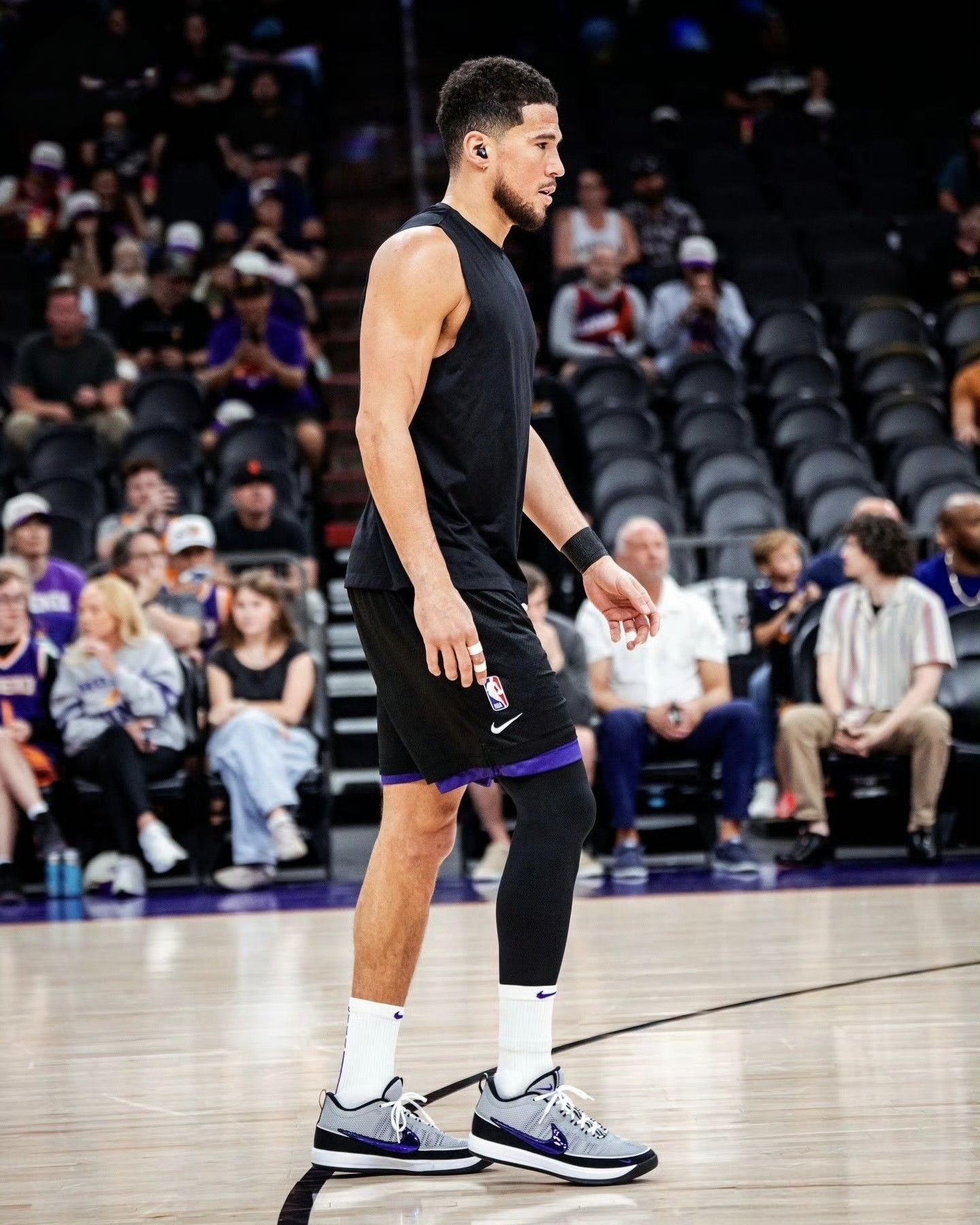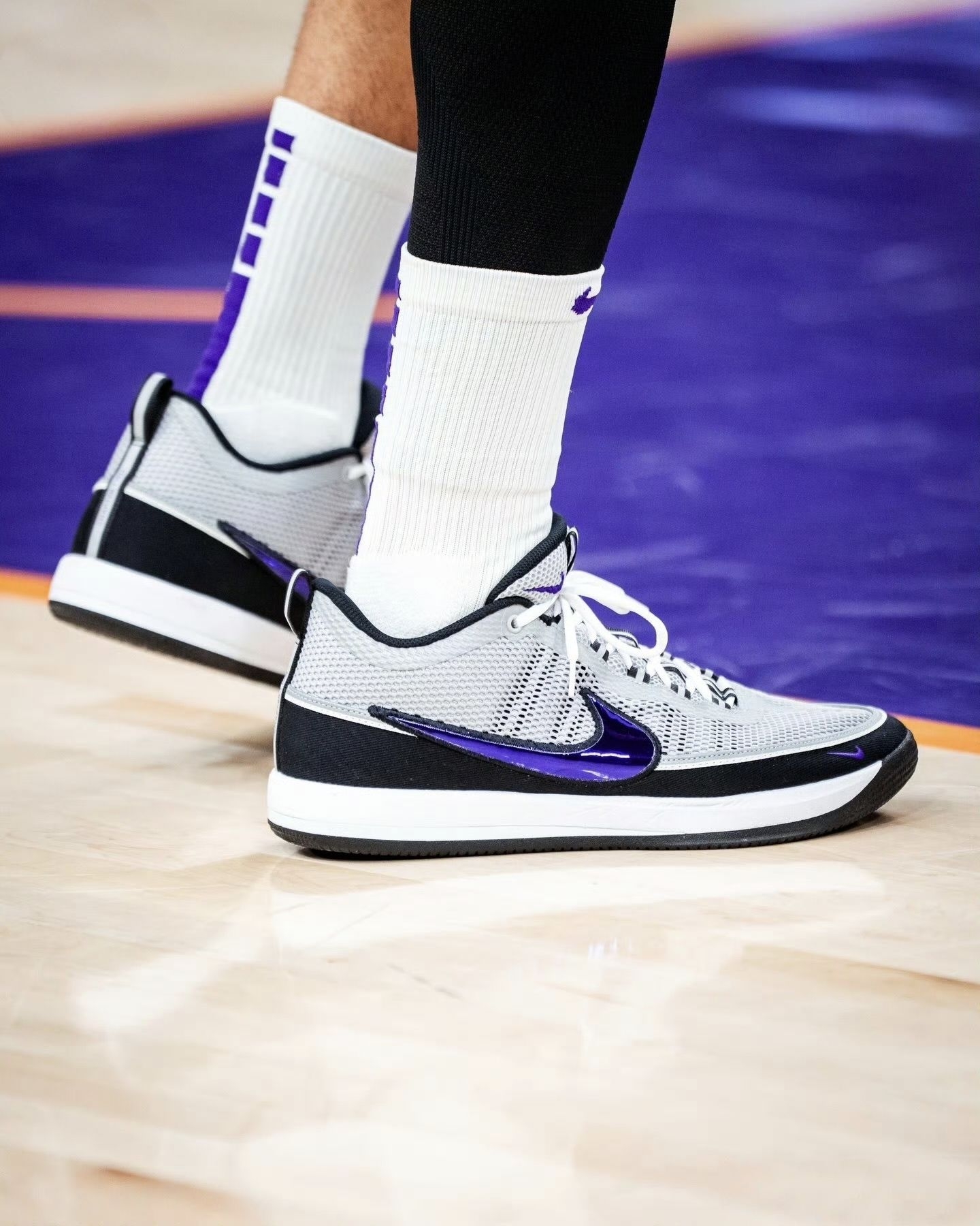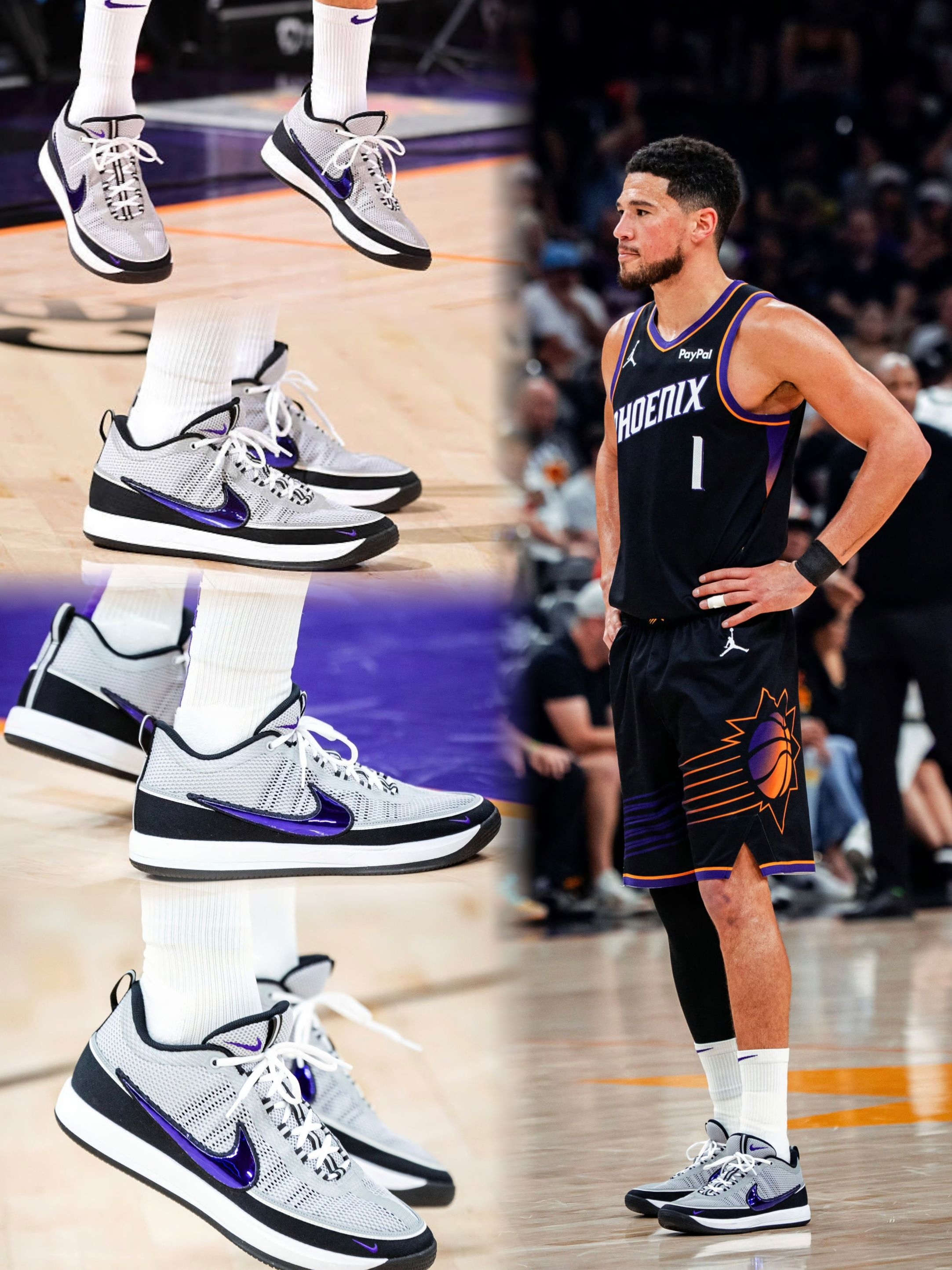 今日NBA常规赛太阳105-108不敌雄鹿。 本场比赛,太阳队球员德文-布克出战35分钟,投篮17中4,三分球5中2,罚球5中4,得到14分4篮板7助攻2抢断1盖帽。 比赛中,布克上脚灰紫色Nike BOOK2“Purple Spiridon”PE