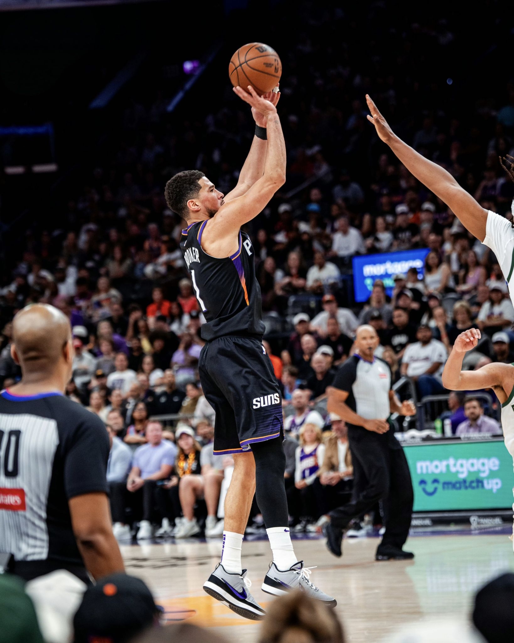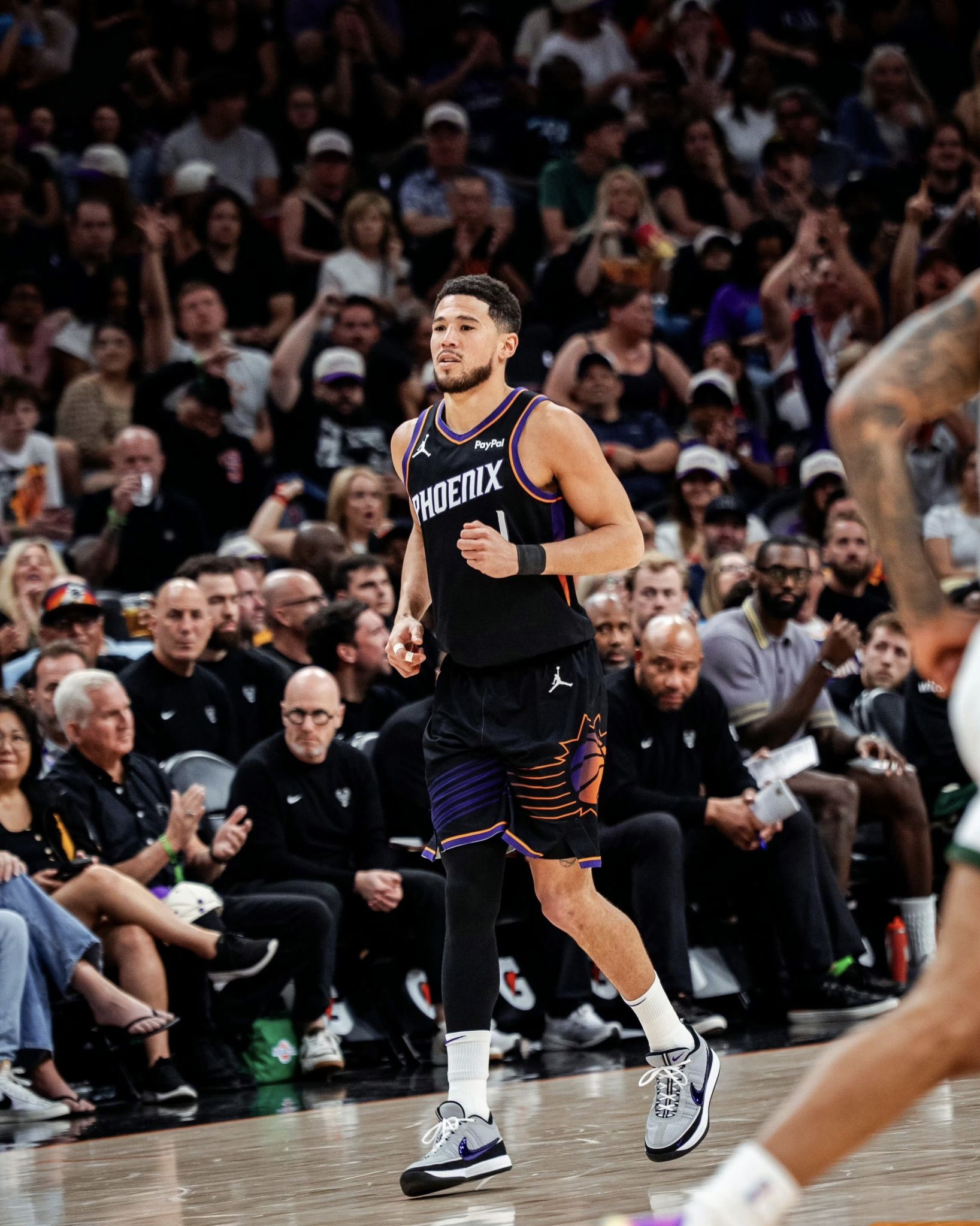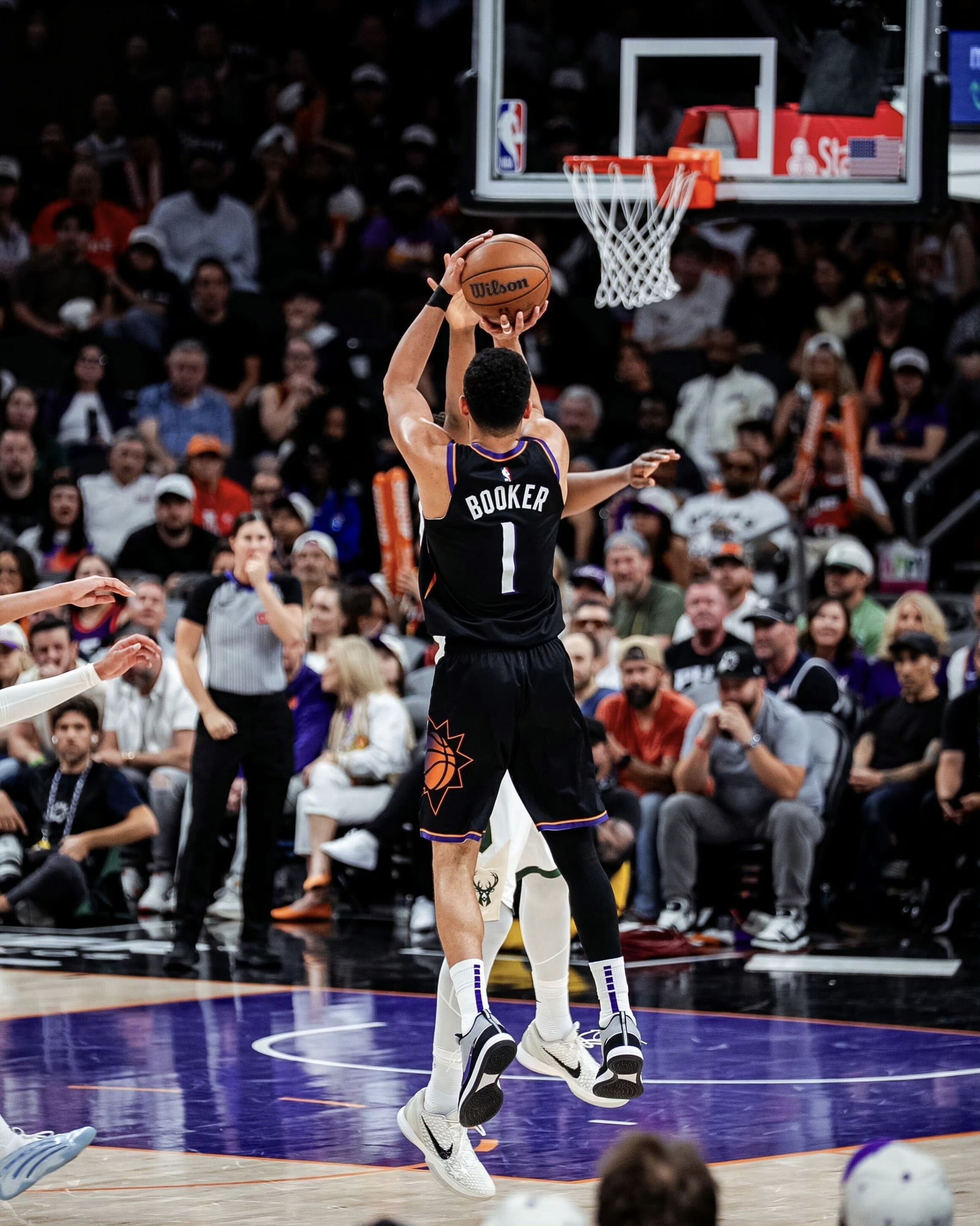 今日NBA常规赛太阳105-108不敌雄鹿。 本场比赛,太阳队球员德文-布克出战35分钟,投篮17中4,三分球5中2,罚球5中4,得到14分4篮板7助攻2抢断1盖帽。 比赛中,布克上脚灰紫色Nike BOOK2“Purple Spiridon”PE