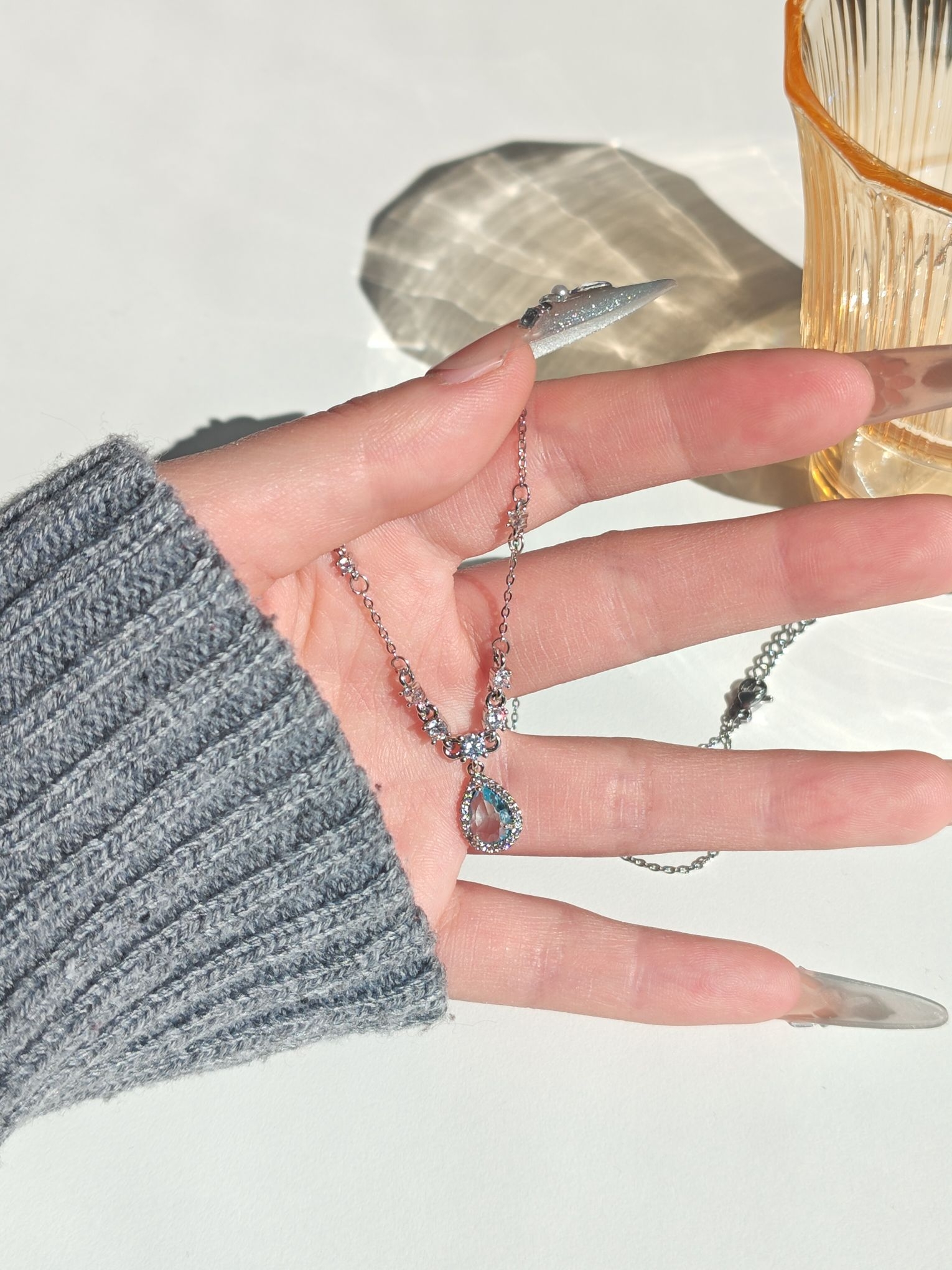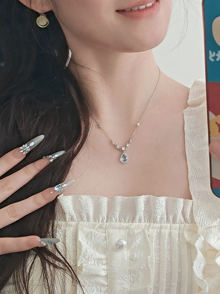 收藏了好久的蓝眼泪,终于被我搞到手了哈哈哈哈!!! 之前刷到各位美女们的分享,真的是每次都心动的不得了! 这次为了迎接这个项链,我特意去做了个海洋蓝的美甲,这海洋公主也是让我当上了😁 吊坠上的蓝宝石很透亮,在盒子里看是很贵气的那种,戴上之后就显得很透亮,很适合夏天去海边玩! 链子上也有很多碎钻,很公主风,看到的姐妹们,就一个字,买它!