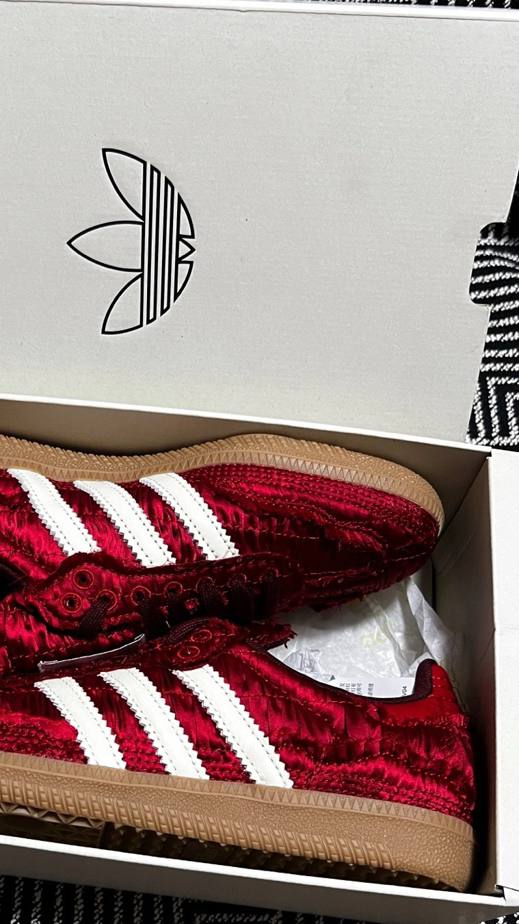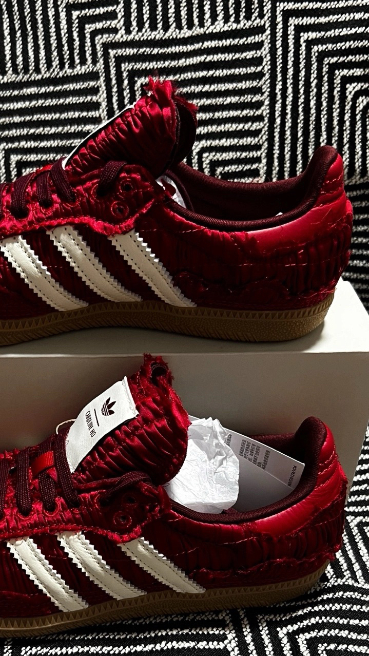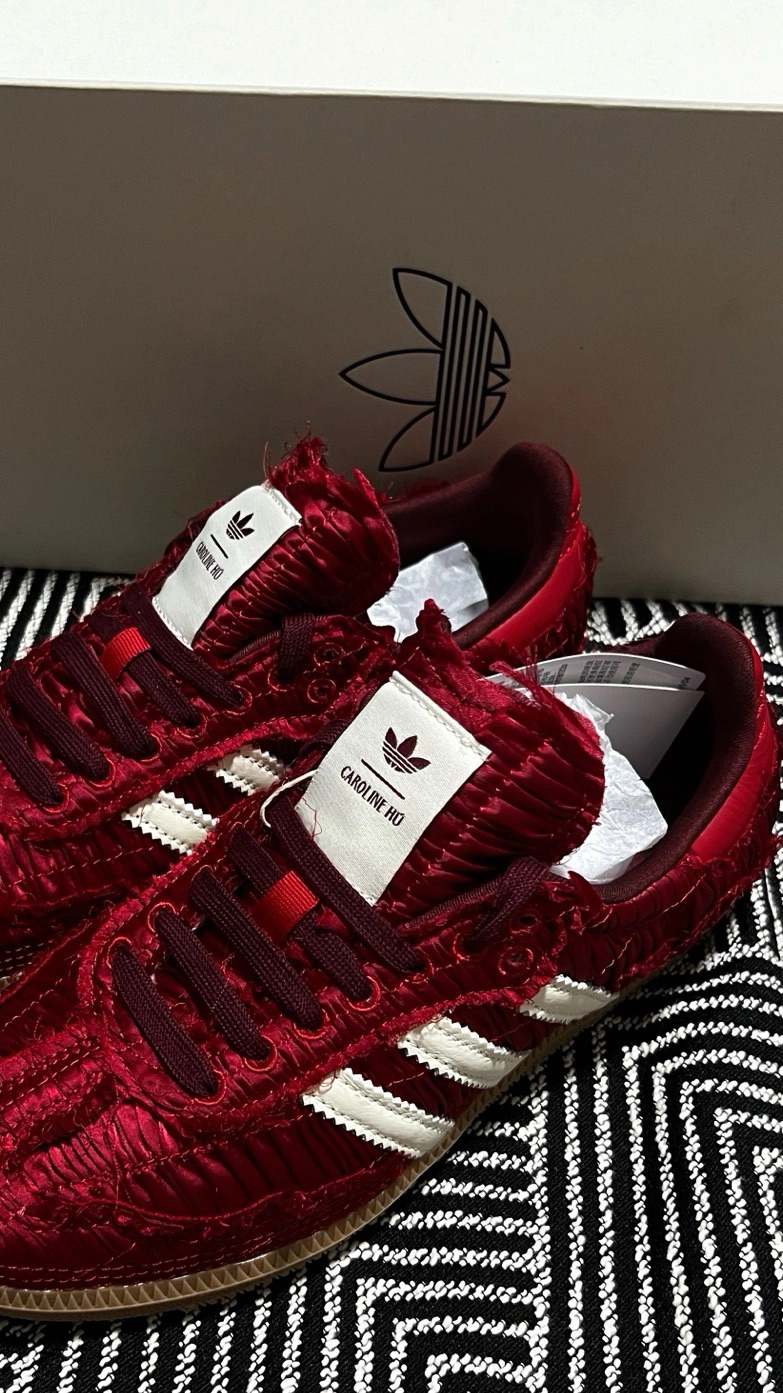 谁能拒绝一双自带复古滤镜的红丝绒球鞋啊!💃 Caroline Hu和阿迪的联名真的把浪漫刻进了DNA里,酒红色褶皱丝绒面料自带高级光泽,毛边设计又甜又酷,上脚直接变身复古画报女主角。 经典Samba鞋型+白色三条杠,搭配牛仔裤、百褶裙都超适配,酒红配色自带氛围感,秋冬配大衣、春夏配碎花裙都能hold住,走在路上回头率直接拉满! 鞋舌上的联名标签细节拉满,连鞋盒都精致到想收藏,这双鞋真的是颜值与质感...