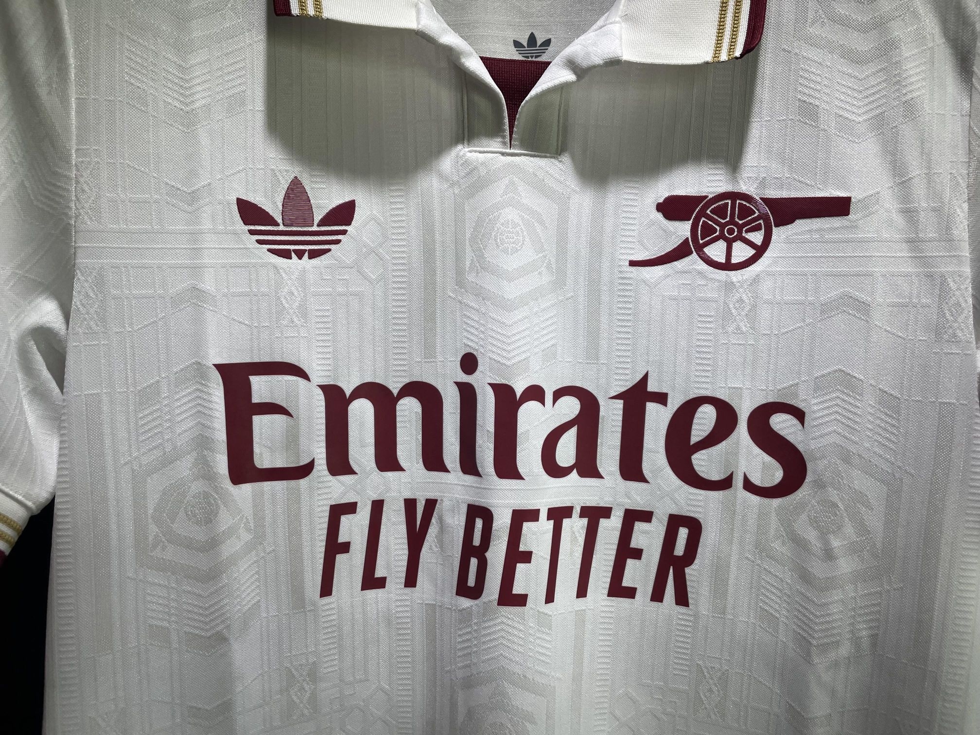 ⚽️阿森纳25/26赛季第二客场球衣由阿迪达斯设计,白色主色+酒红细节,复古又现代!胸前“Emirates Fly Better”赞助标志,左胸三叶草,右胸俱乐部徽章,袖口“Visit Rwanda”字样,致敬合作伙伴。面料透气速干,夏天穿超舒服,日常穿搭或看球都很合适🔥。灵感来自海布里球场,满满北伦敦足球文化,枪手球迷必入!