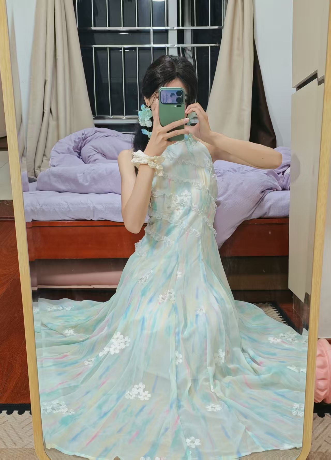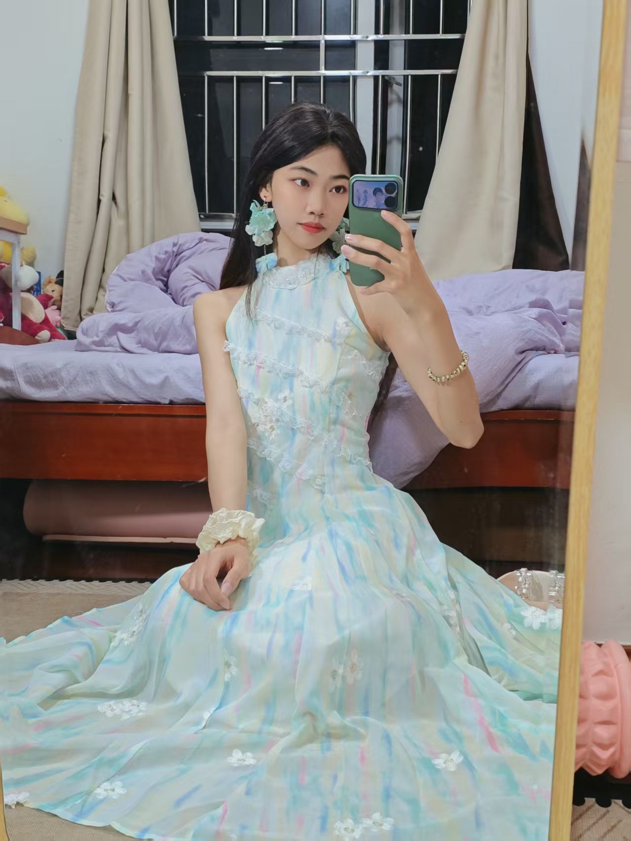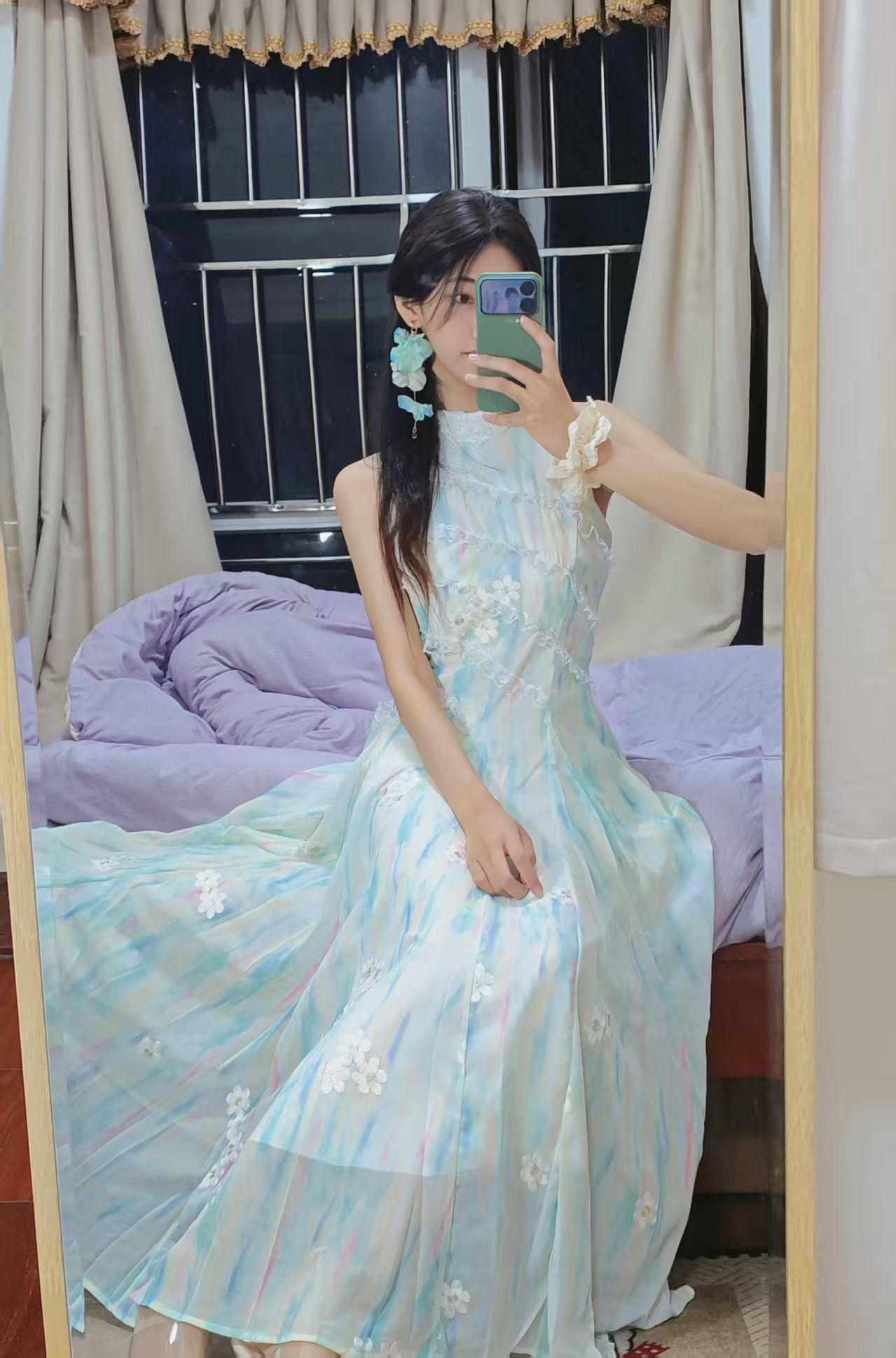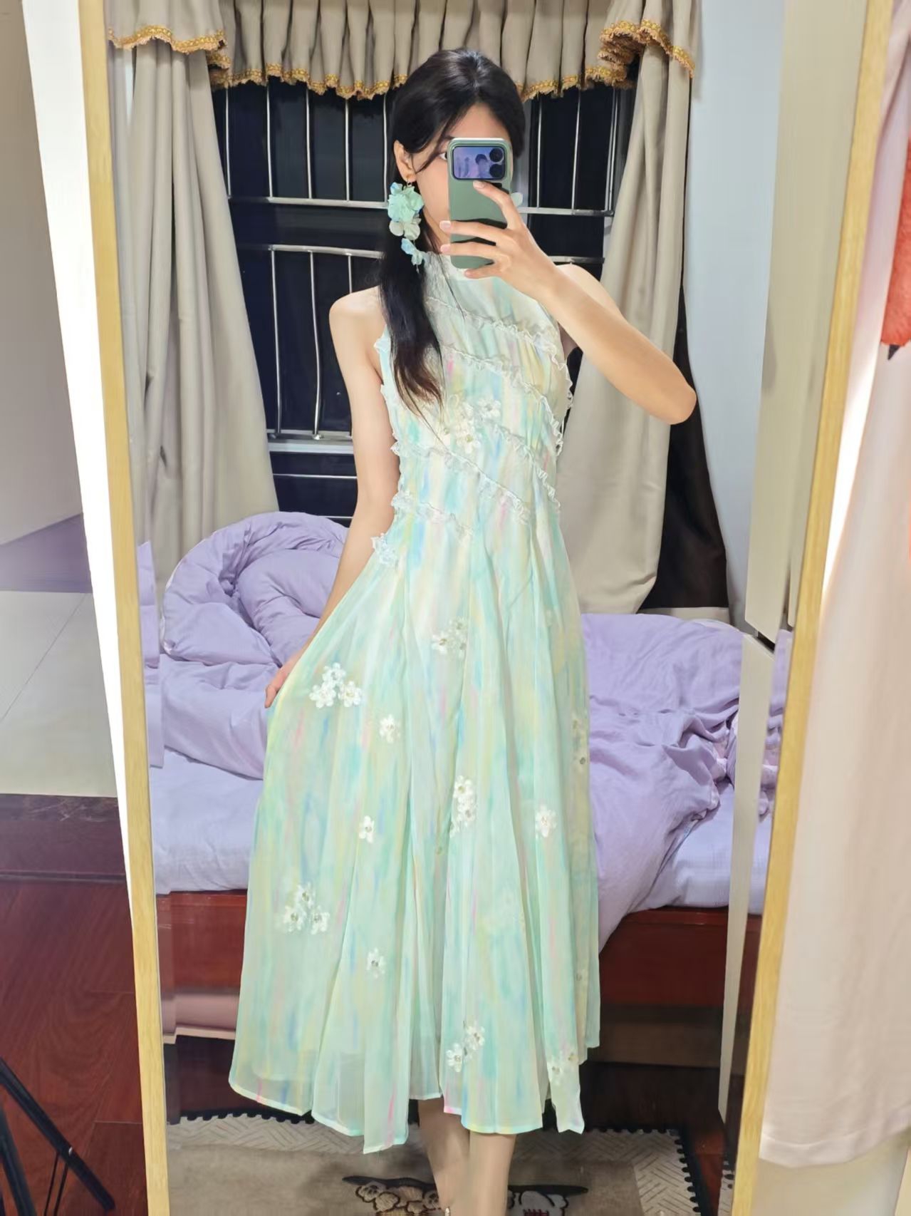 👗 身高/体重:160cm / 45kg 💚 裙裙亮点: - 浅薄荷绿渐变底色+立体小白花刺绣,自带朦胧滤镜,温柔到骨子里 - 挂脖设计露肩又显瘦,完美修饰肩颈线条,对溜肩也很友好 - 高腰大摆裙型,小个子穿也能拉长比例,走路带风超飘逸 - 雪纺面料轻薄透气,春夏穿完全不闷,还自带微闪光泽感 🌸 搭配思路: - 耳饰:同色系花朵耳饰,和裙上小花呼应,氛围感拉满 - 鞋子...