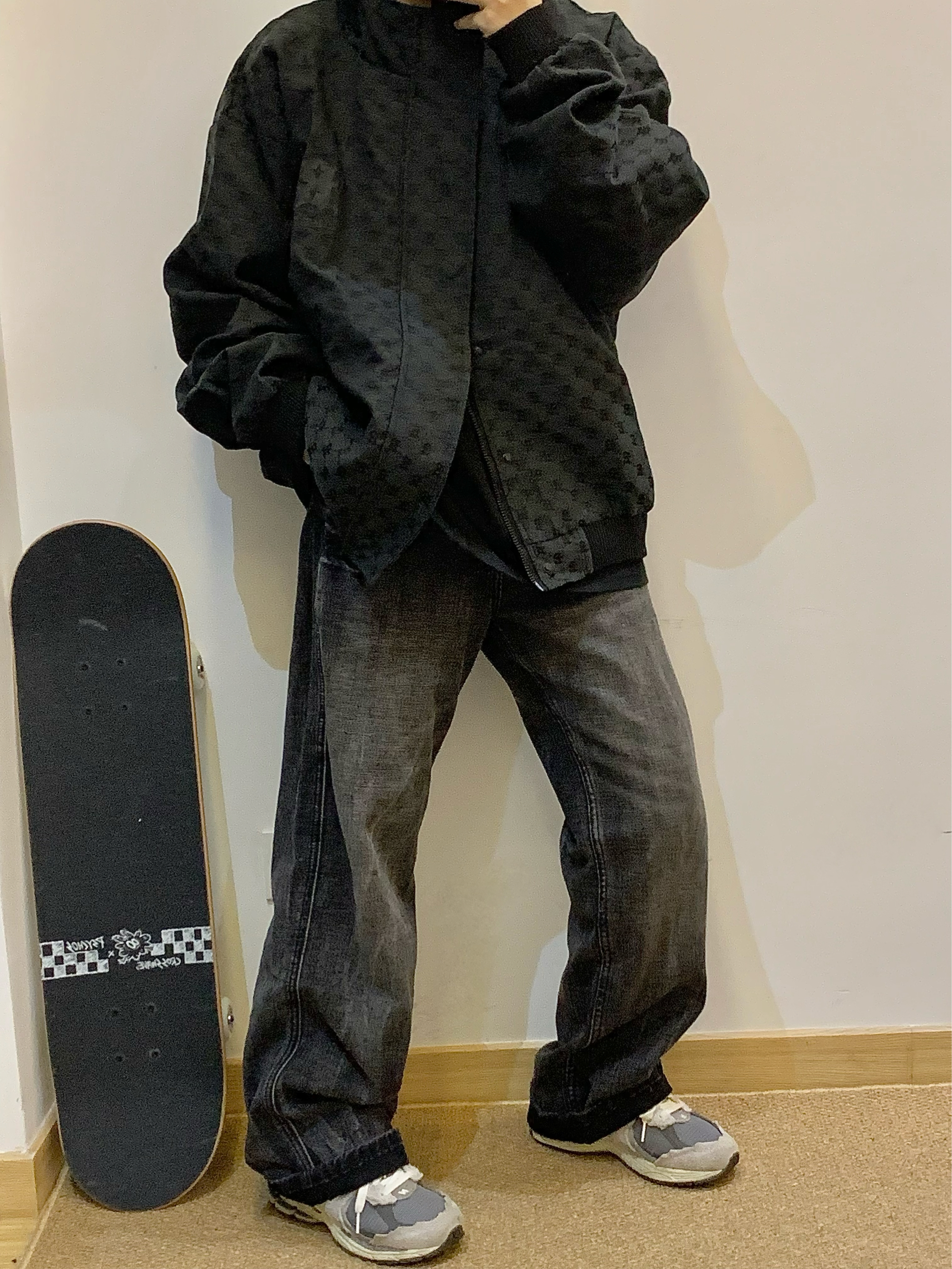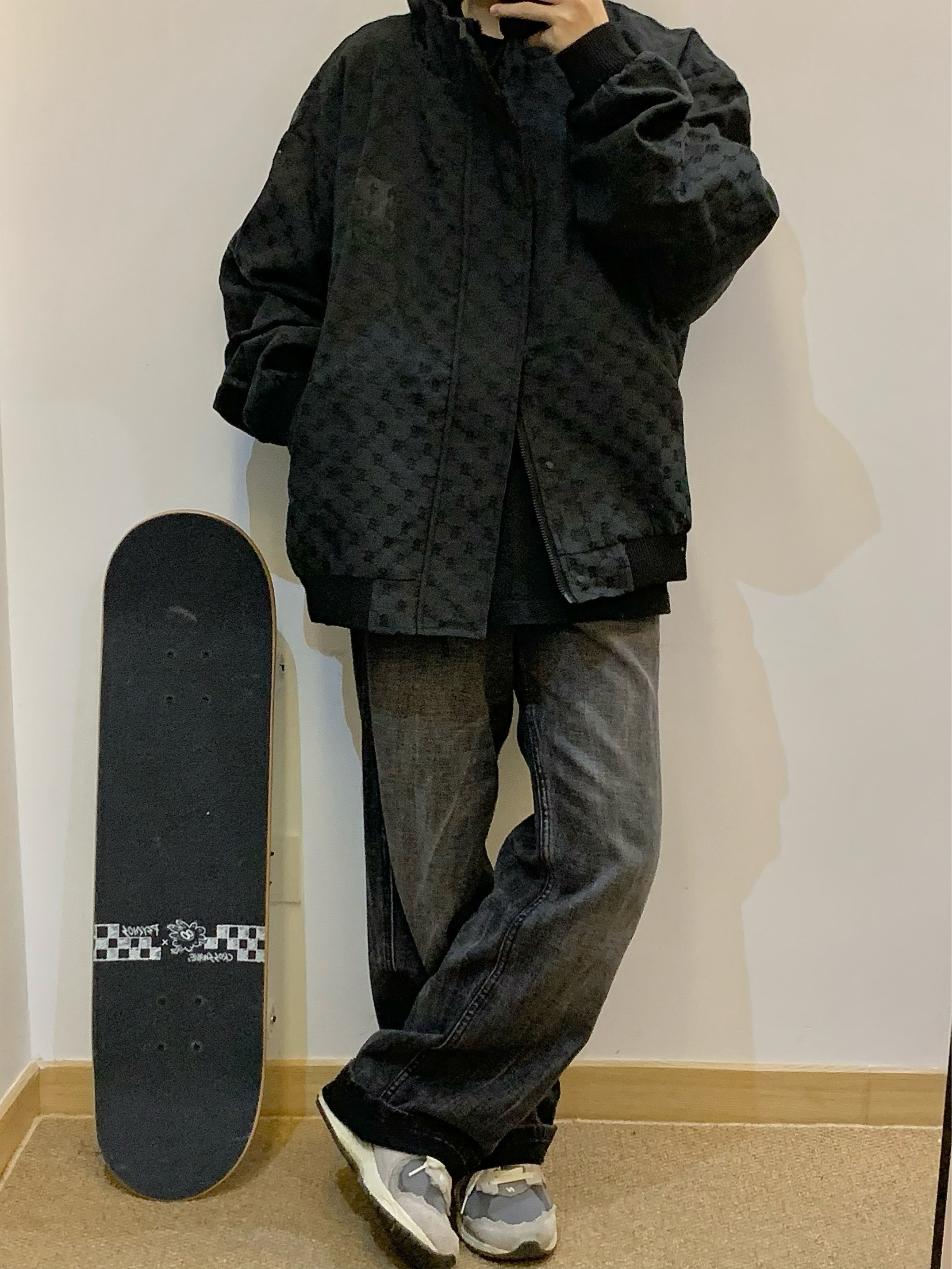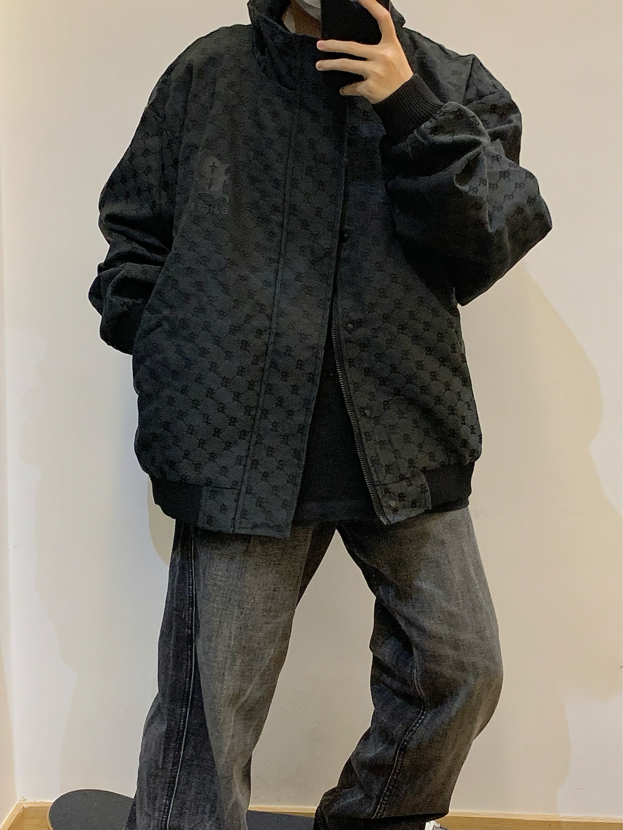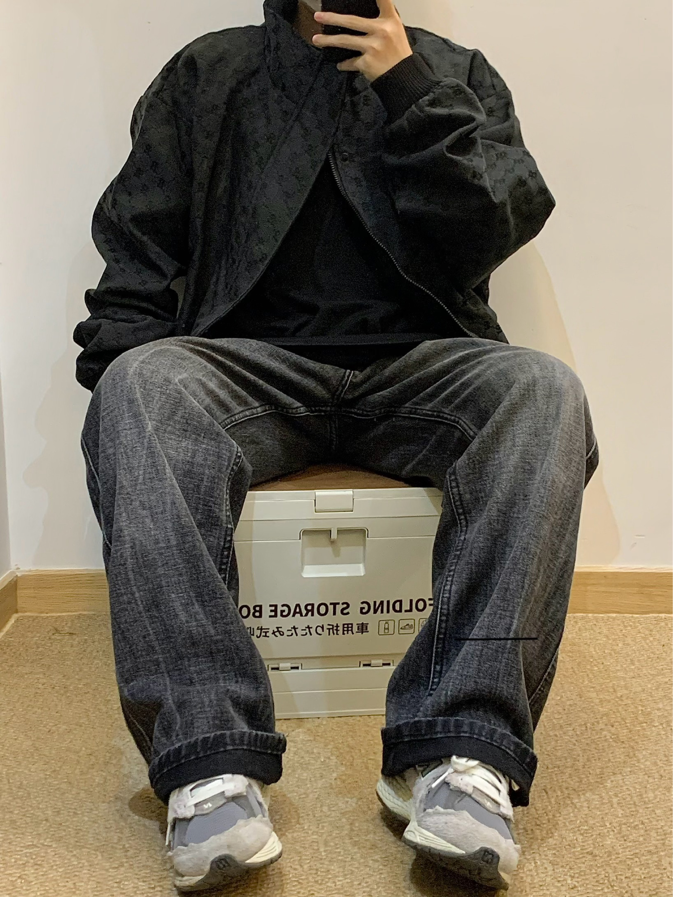 黑色复古夹克外套搭配做旧牛仔裤 满印的老花刺绣 很有质感 立领设计 上身帅气十足 版型也很赞 初秋穿正好! 👔:BJHG 👟:NB2002R