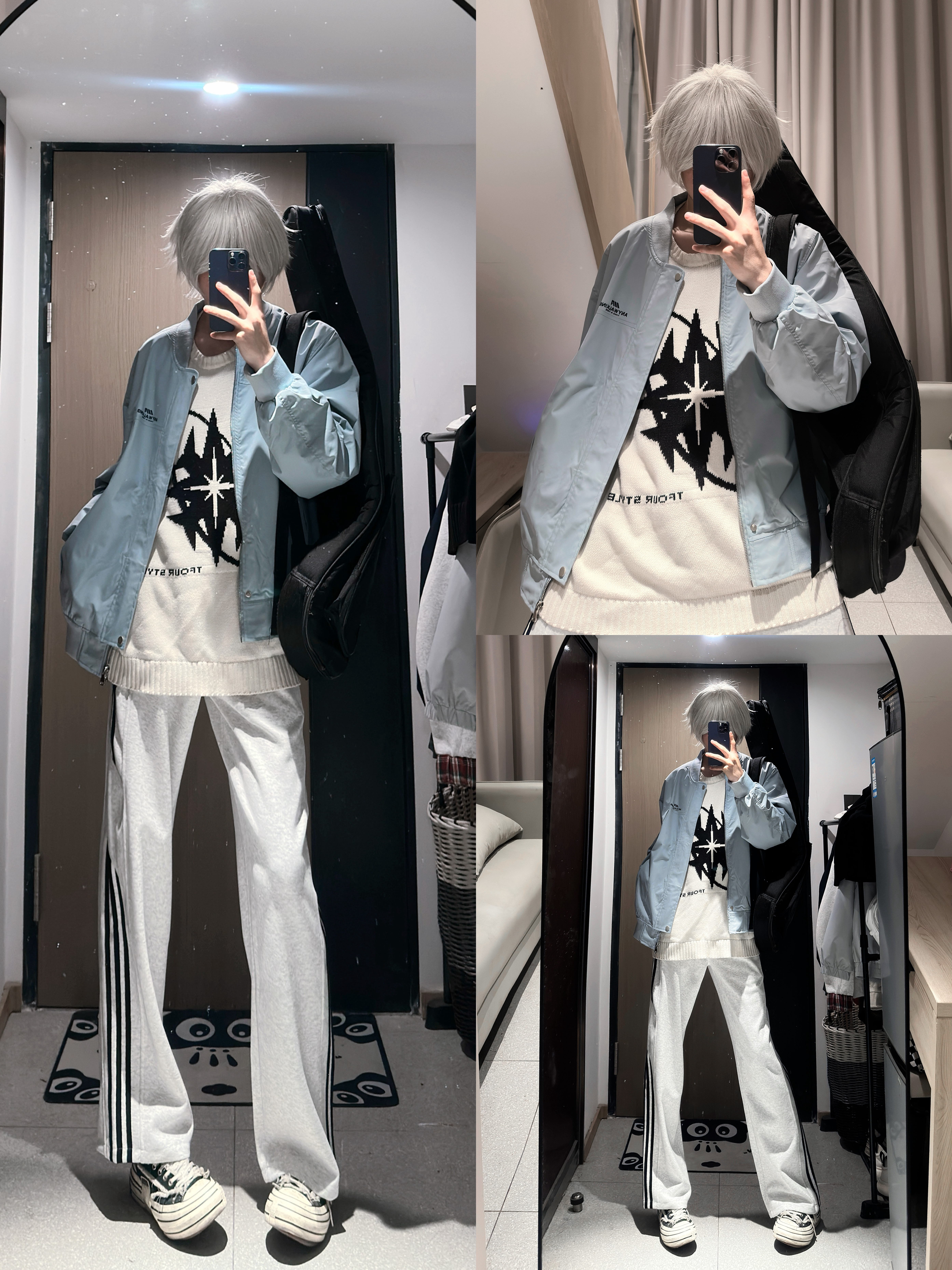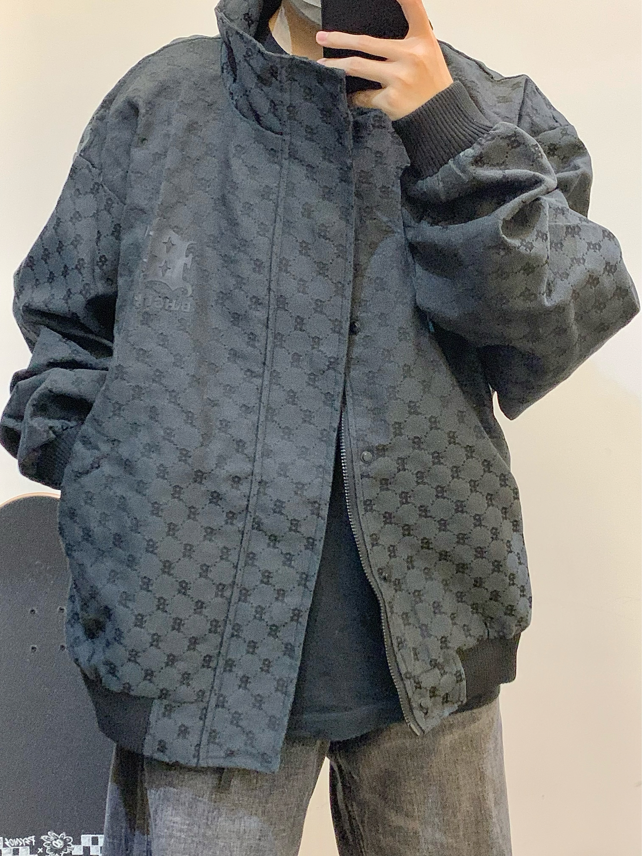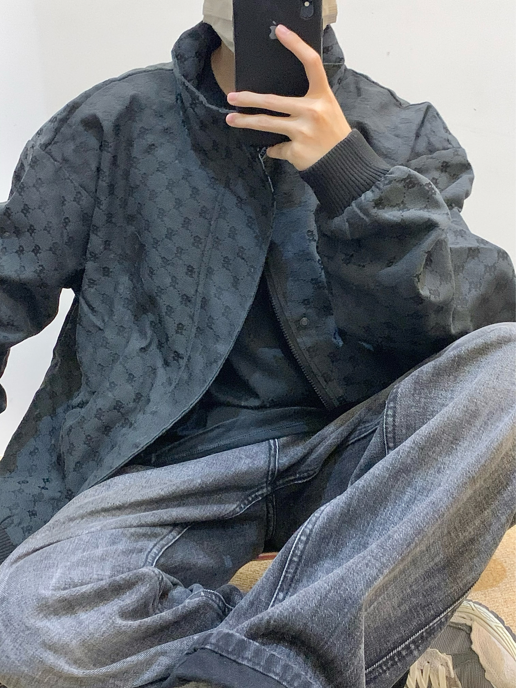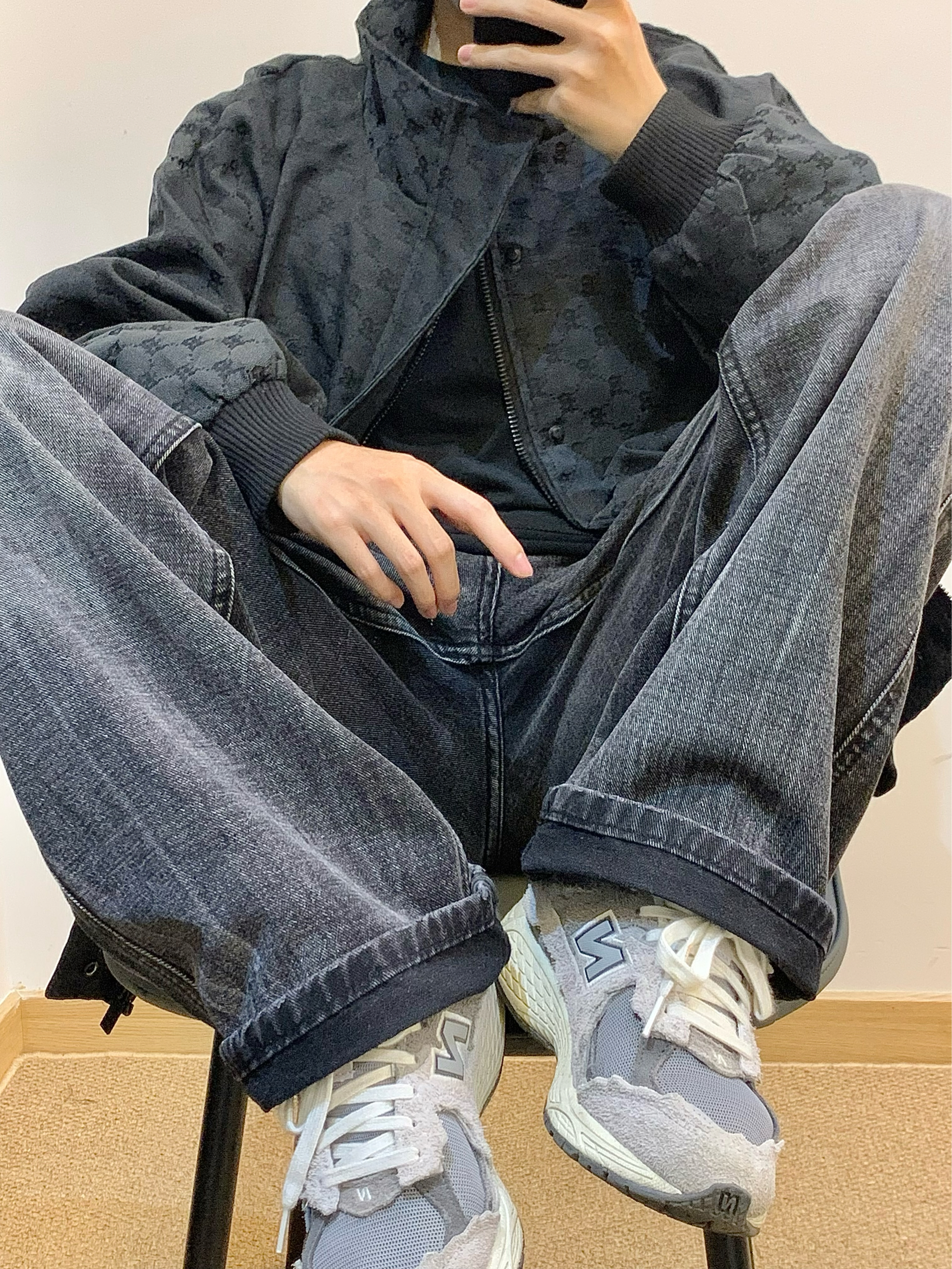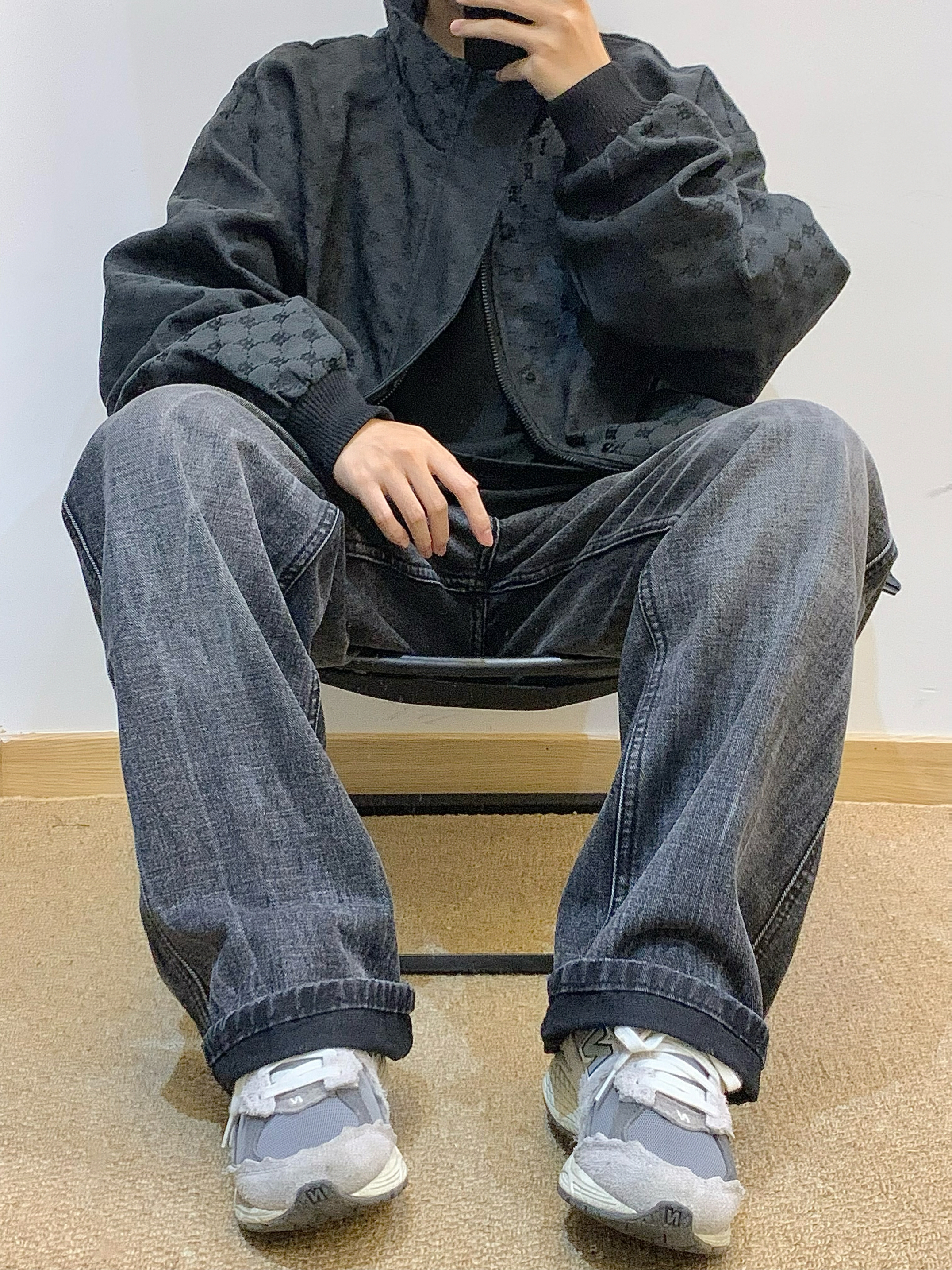 黑色复古夹克外套搭配做旧牛仔裤 满印的老花刺绣 很有质感 立领设计 上身帅气十足 版型也很赞 初秋穿正好! 👔:BJHG 👟:NB2002R