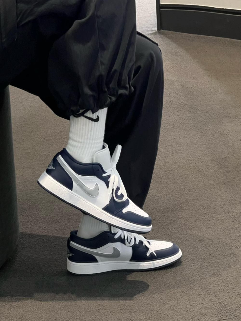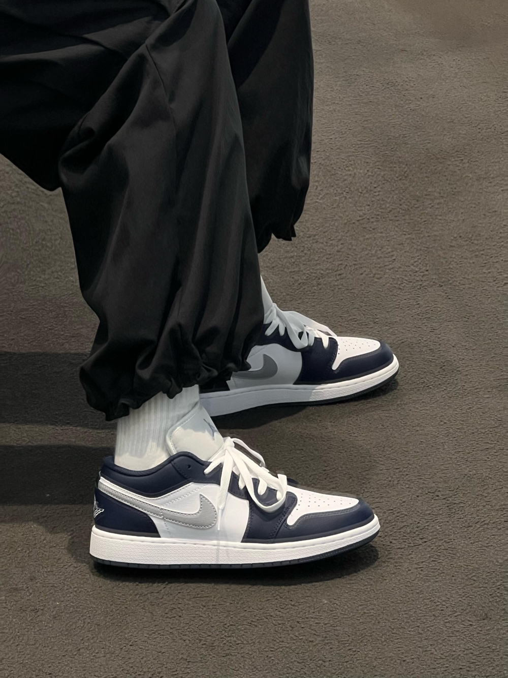 这配色谁顶得住啊!AJ1午夜蓝杀我💘 开箱我的新宠AJ1!! 这是什么神仙配色啊!深邃的午夜蓝搭配干净的白, 不是那种俗气的亮蓝,是自带高级滤镜的耐看蓝💙 低帮设计真的很友好,夏天穿也不闷脚, 银灰色Swoosh点睛,细节感满满。 随便搭个黑裤白袜,街头少年感瞬间拿捏, 这颜值真的越看越喜欢!