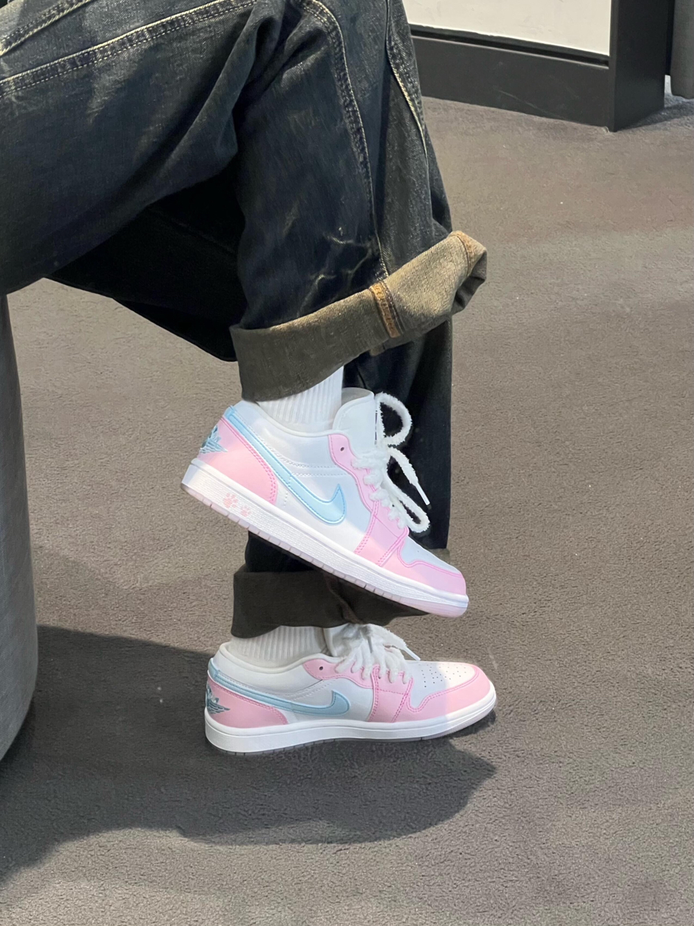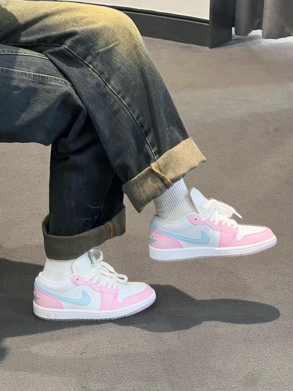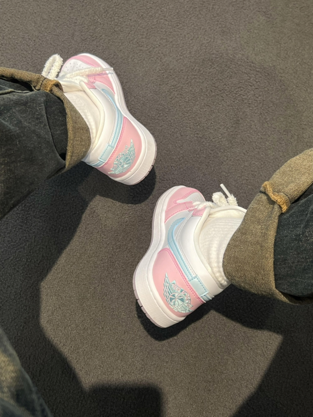 救命!这双AJ1 Low粉蓝配色也太春天了吧! 软乎乎的樱花粉+奶fufu的 baby 蓝,搭配干净的白色鞋身,甜妹氛围感直接拉满💖 后跟还有可爱的小爪印细节,少女心爆棚! 低帮版型利落显腿长,搭配卷边牛仔裤,清爽又减龄,日常出街、约会都超合适。 这颜值真的越看越心动,春天的第一双甜妹鞋必须是它!