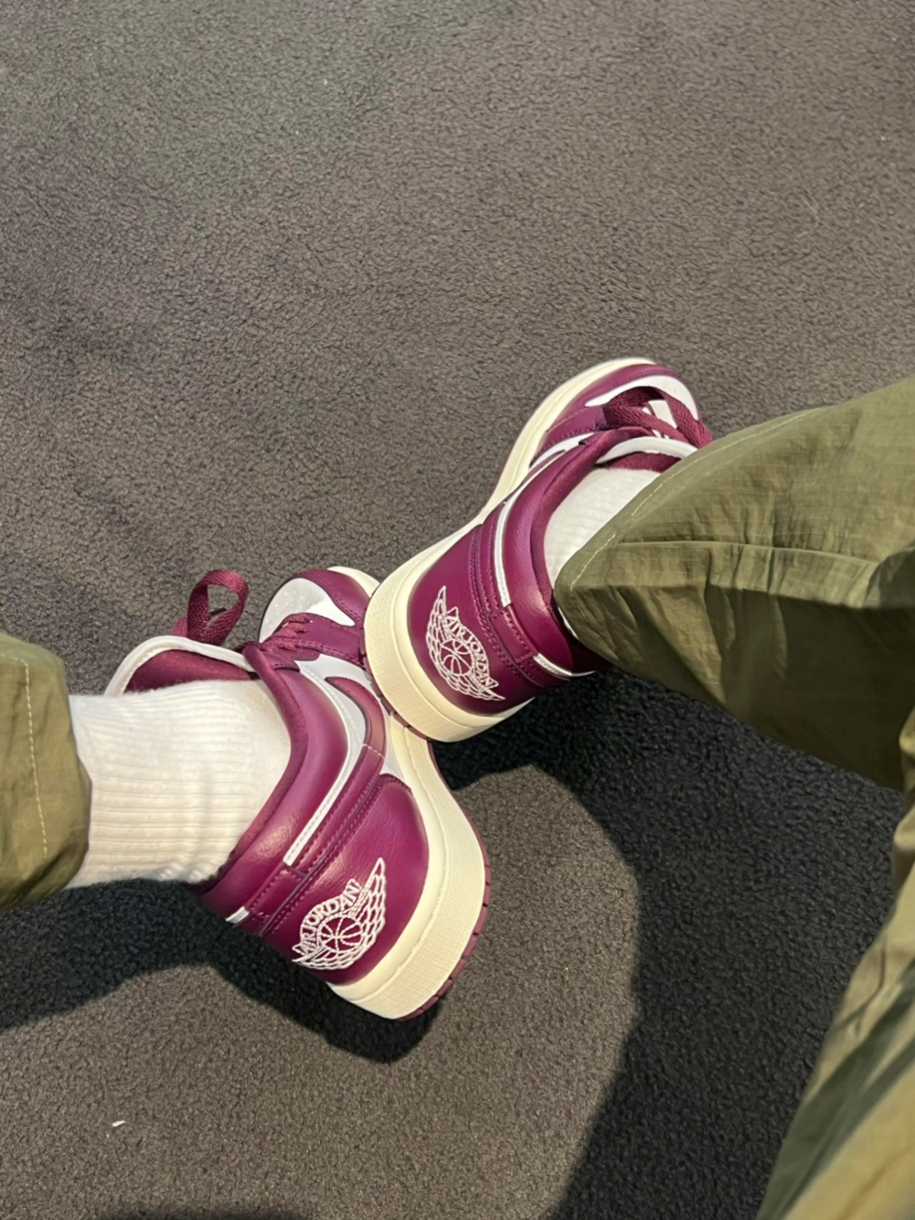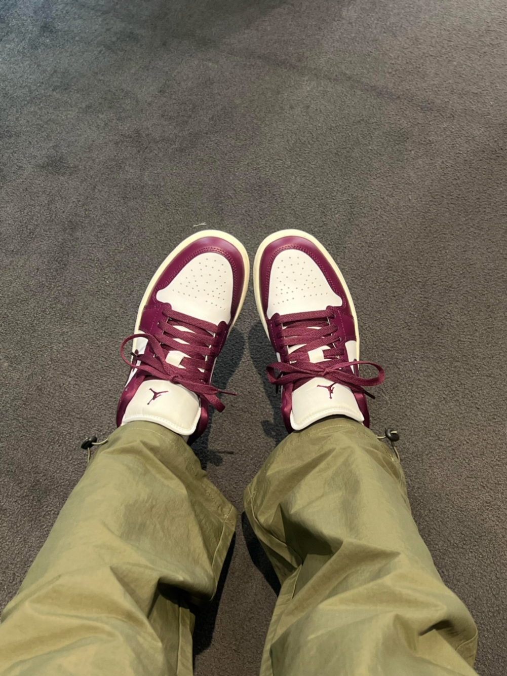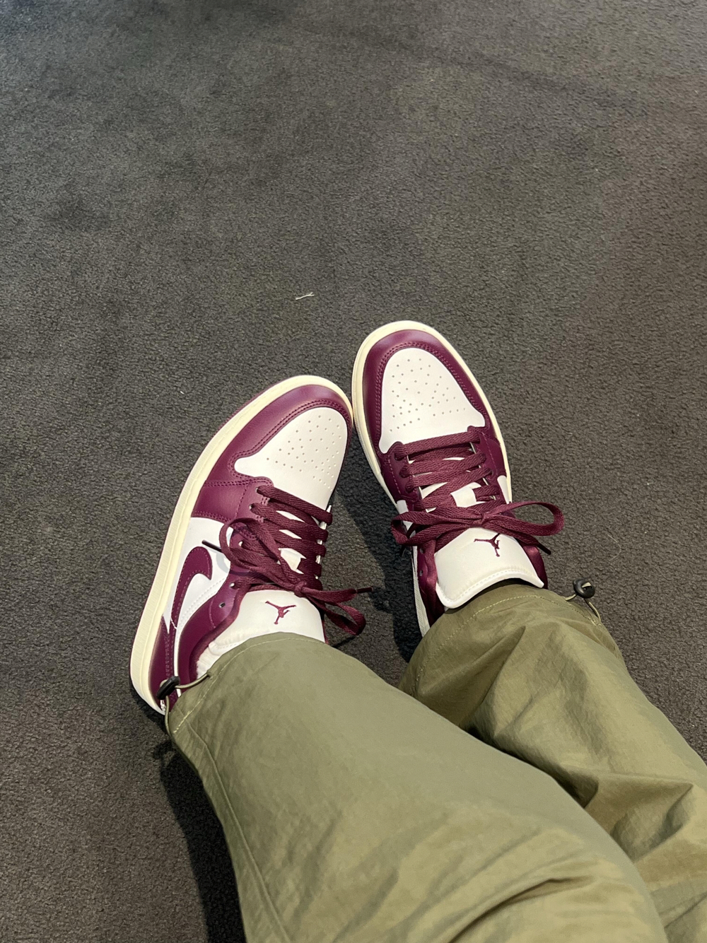 一眼沦陷的AJ1 Low酒红配色,直接把复古感焊在脚上! 浓郁的车厘子酒红撞干净的白,自带高级滤镜,上脚显白又显贵,黄皮姐妹也能轻松驾驭~ 奶白中底中和了酒红的厚重,整体温柔又有质感,搭配军绿色工装裤,松弛感直接拉满。 低帮版型利落显腿长,不管是日常出街、通勤还是约会都超合适,这颜值真的越看越上头!